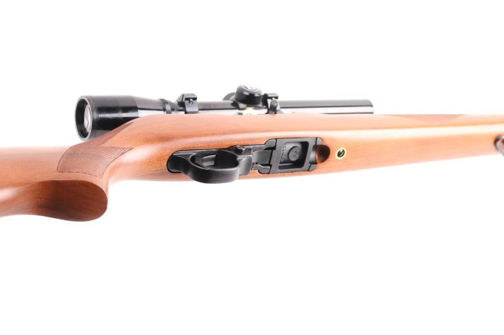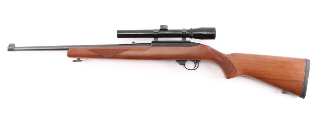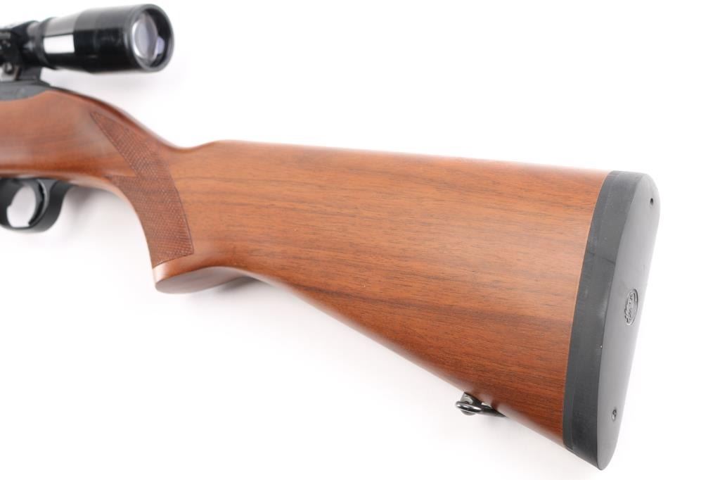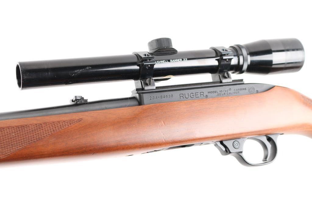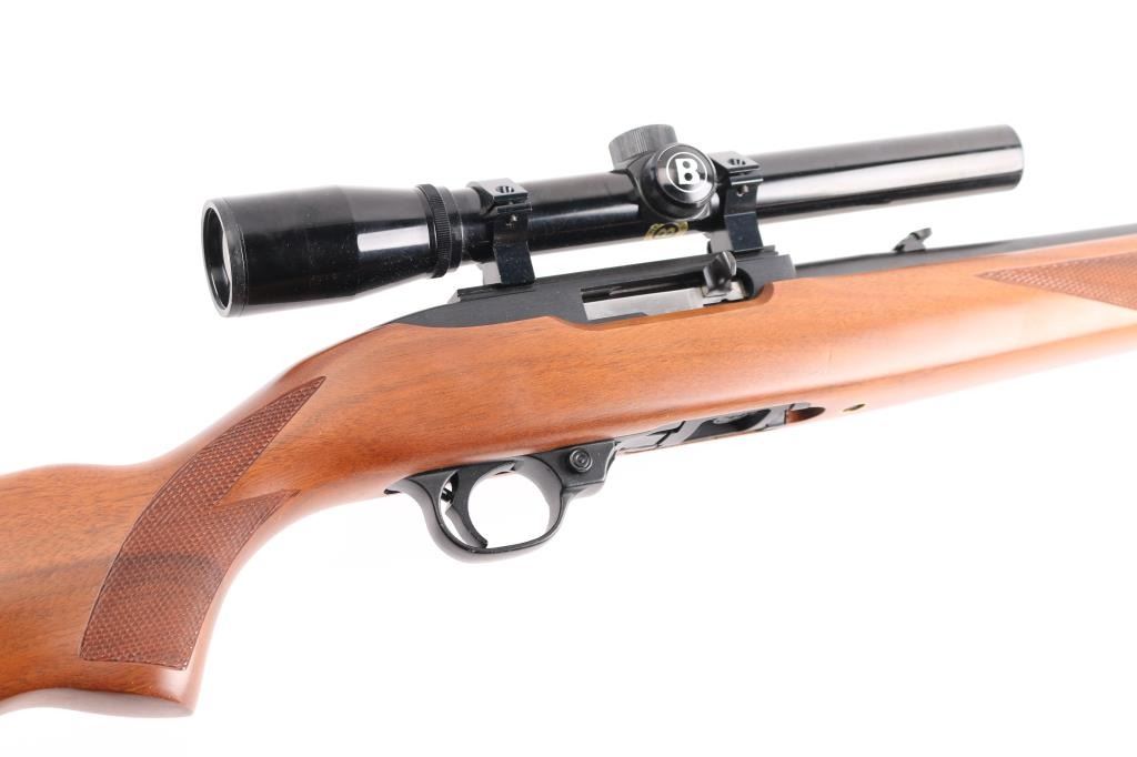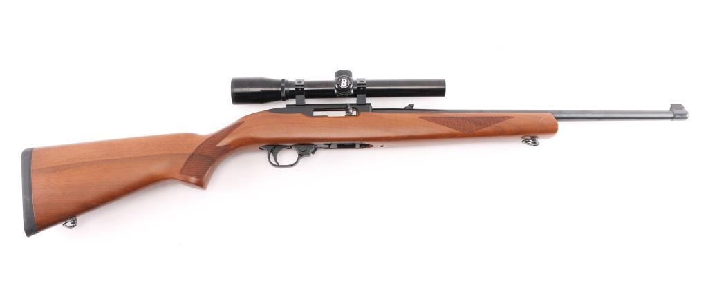 Semiautomatic rimfire rifle features blued finish, checkered wood stock with curved grip, thin rubber butt pad, 18" barrel, blade front sight, folding adjustable rear sight, dovetail base mounted to receiver, manual safety, manual bolt hold open, sling swivels, detachable magazine. Mounts a Bushnell Banner 22 scope (appears 4x) with duplex reticle. Bore is very good. Retains 98% finish with minor handling marks. Stock is excellent overall. Scope is very good with clear view. Includes (1) magazine.