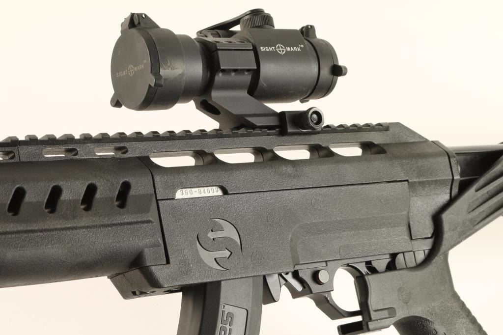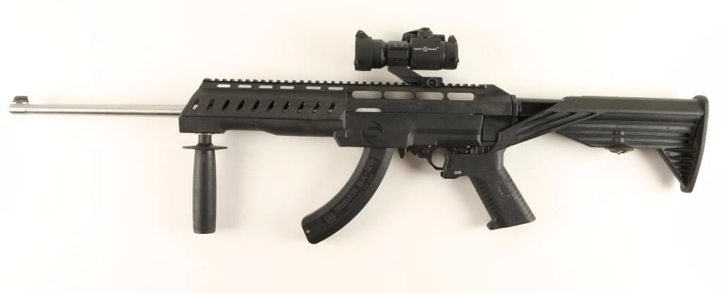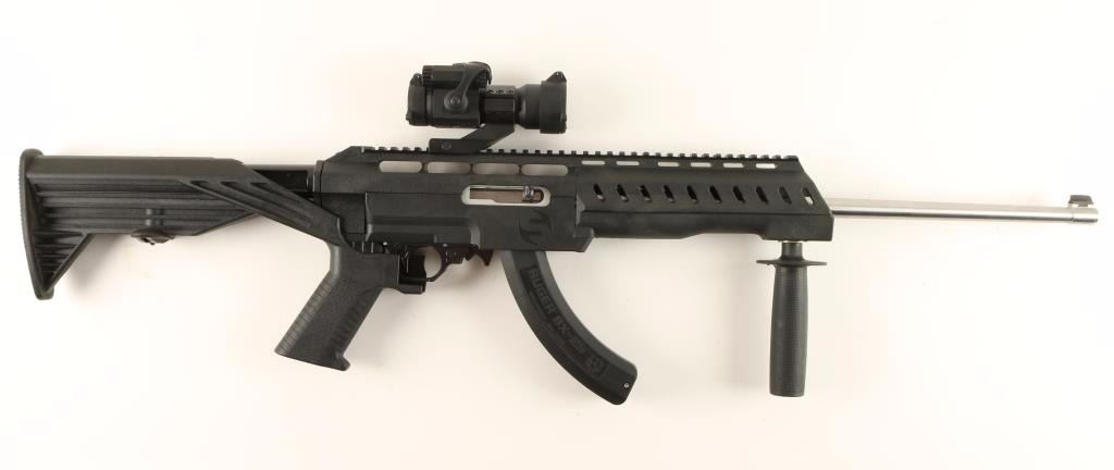 Customized and upgraded stainless steel semi automatic sporting rifle chambered in .22 Long Rifle. Features a brushed finish, 18.5" tapered barrel, blade front sight, Slide Fire black synthetic stock with bump fire technology, upgraded Volquartsen adjustable trigger assembly, vertical foregrip, factory 25 round magazine, Sight Mark red dot sight, push button safety, and hold open lever. Rifle show light handling wear on barrel. Action is crisp, bore is immaculate, and stocks are fine. Condition is excellent. ***Modern Firearm***