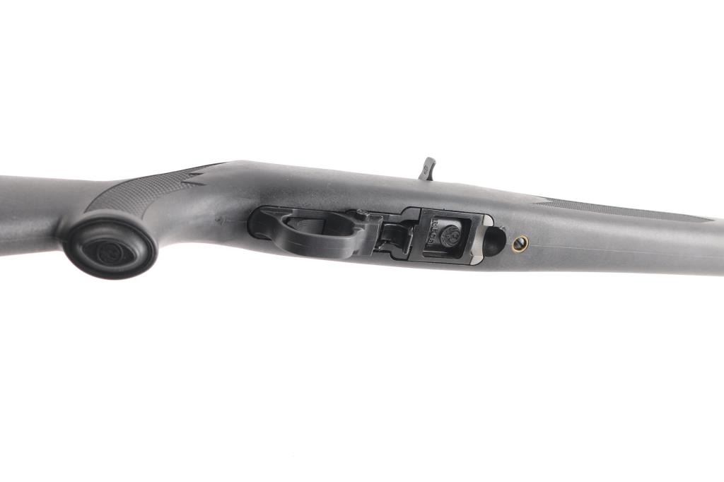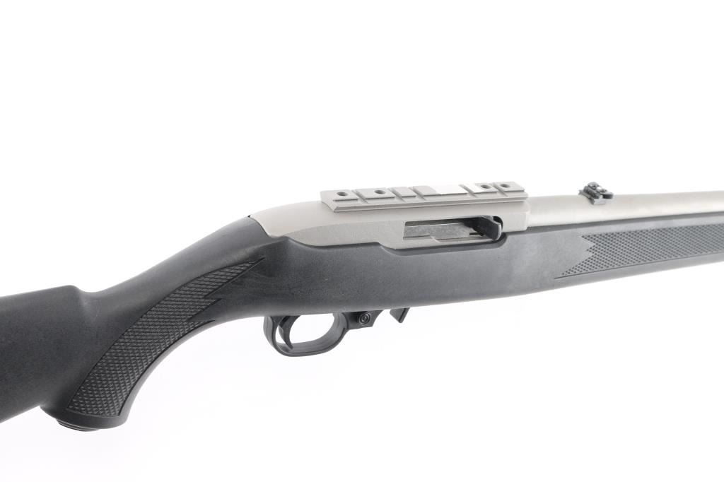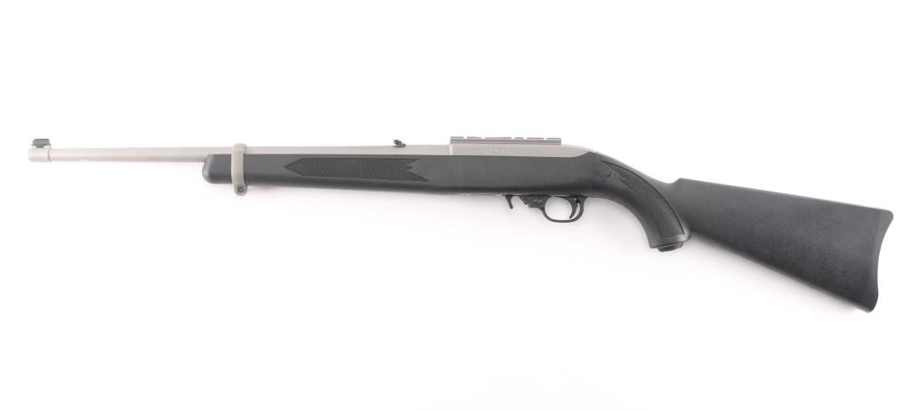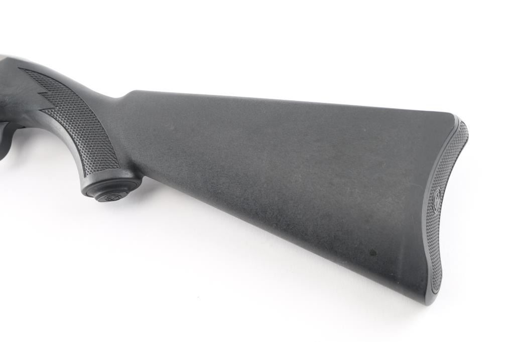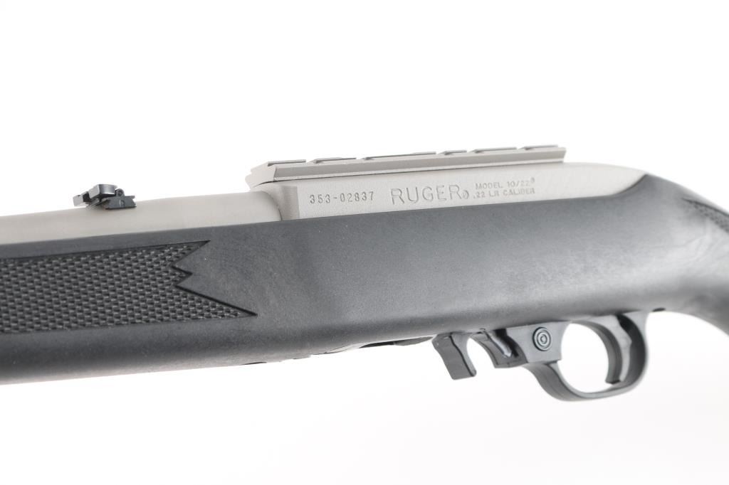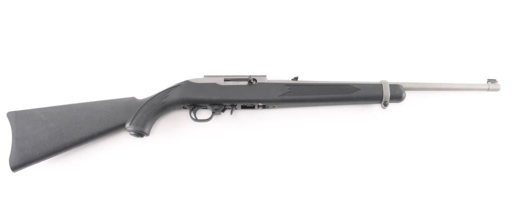 American made semi-automatic rimfire rifle circa 2008. Features18.5" barrel, gray parkerized finish, black synthetic stock with curved grip, bead blade front sight and flip-up adjustable rear sight, push button manual safety. Metal finish looks excellent on the barrel. Stock is excellent, bore is excellent/bright. Scope base installed on receiver. 10 rd rotary magazine.NRA Condition-Excellent. Modern Firearm.
