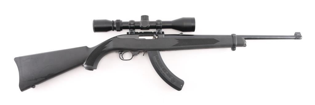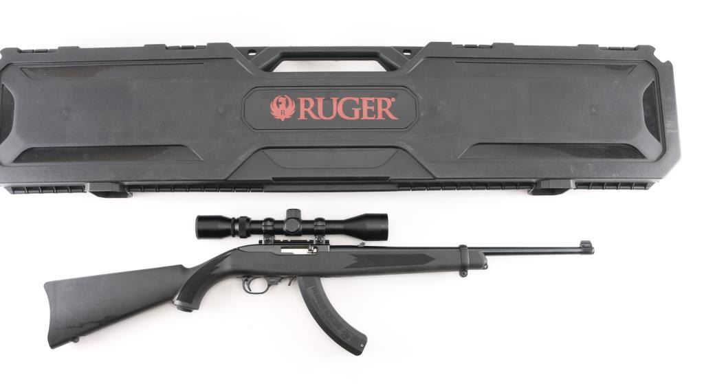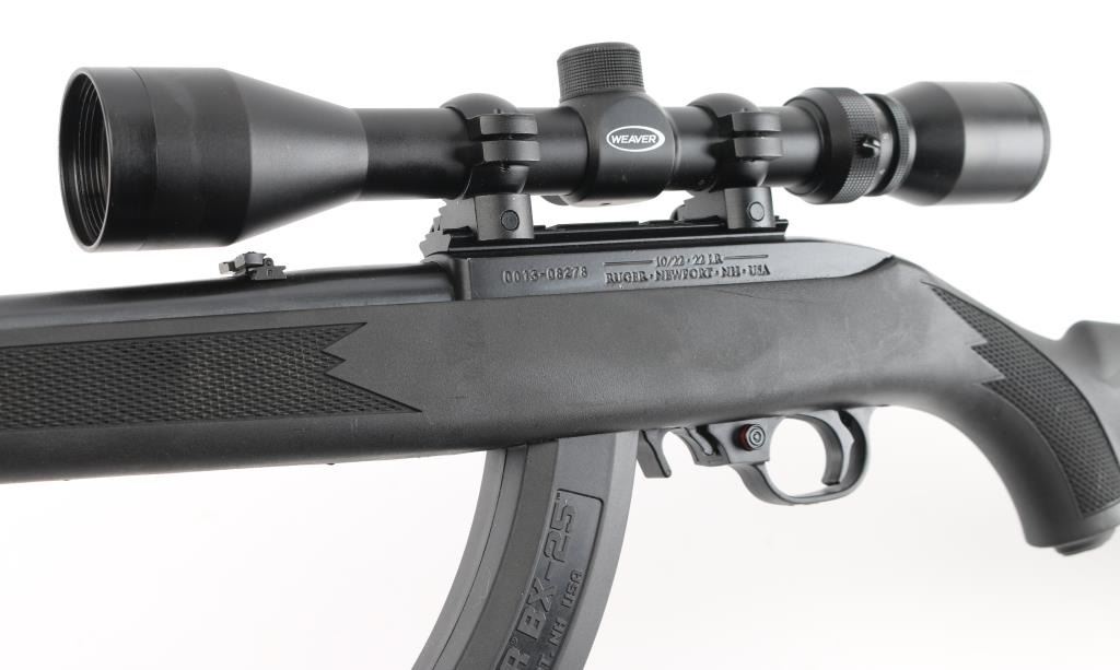 American made rifle, semi-automatic, approximately 18 1/2" barrel, bore is bright, integral combination scope base adapter for both Weaver-style and .22 tip-off scope mounts, black synthetic stock, polymer trigger housing assembly, serrated trigger, checkered forend and grip, Ruger BX-25 magazine, Weaver 3-9X scope. Rifle exhibits minor edge wear. Includes original case. Condition is NRA Excellent. Modern Firearm