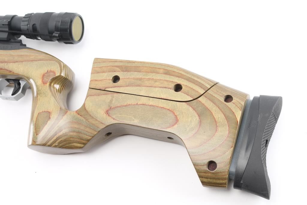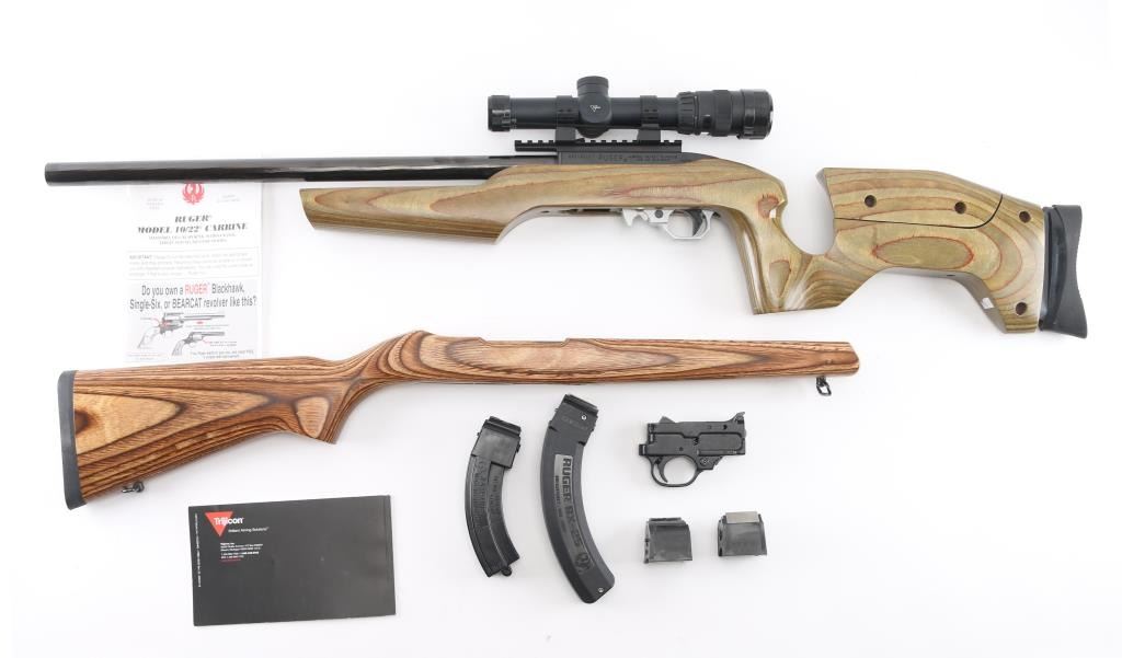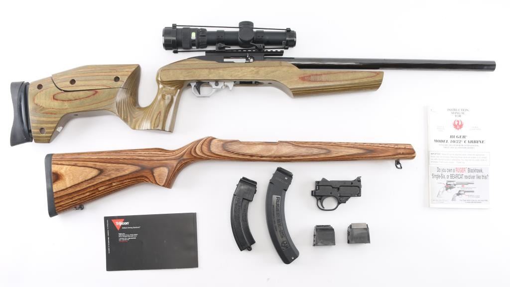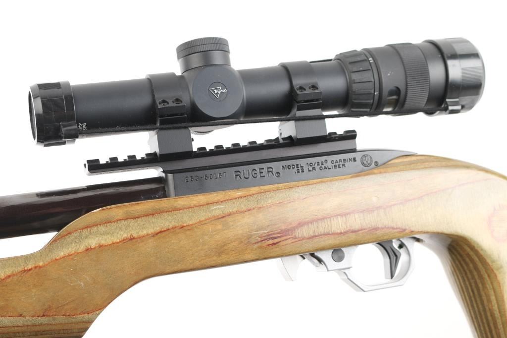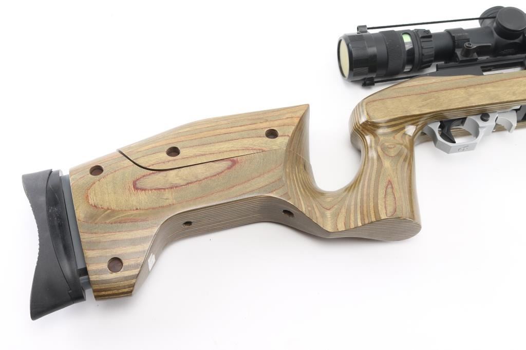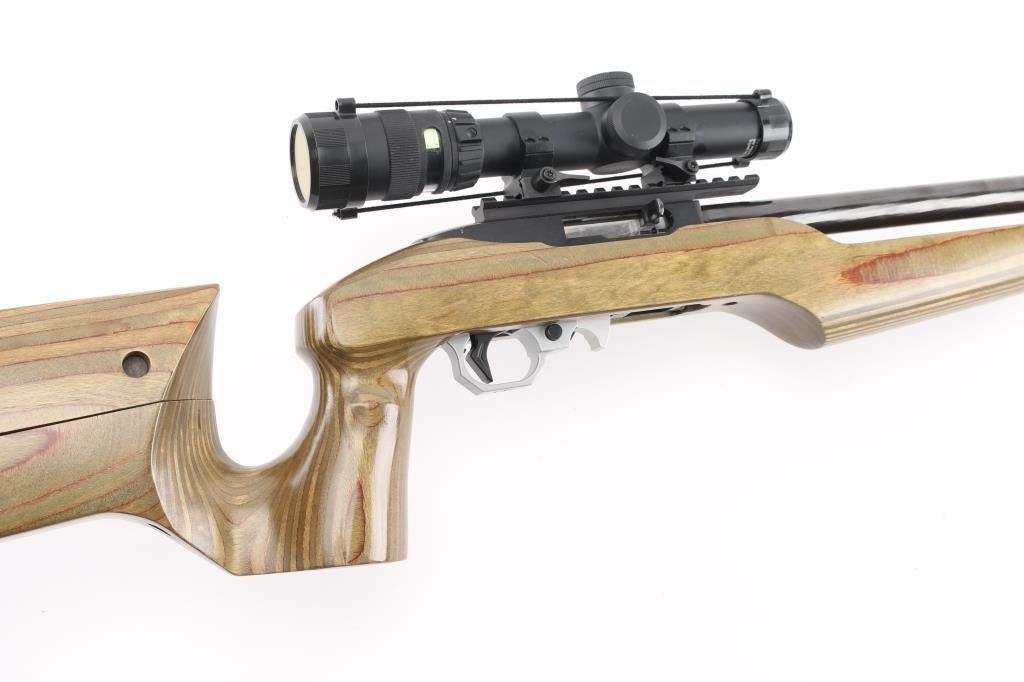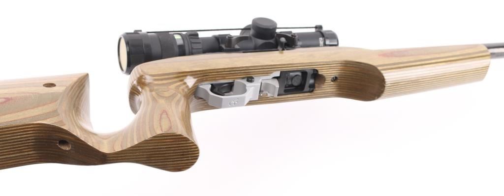 Customized semiautomatic target or competition rifle. Features blued finish, 20" Ruger bull barrel, Picatinny rail on top of receiver, Volquartsen trigger assembly, push button safety. Smooth green & brown color wood laminate stock features vertical grip area, low positioned handguard to free float the barrel, adjustable comb, adjustable length of pull, rubber butt pad. Mounts a Trijicon 1-4x24mm scope with tritium and fiber optic illuminated reticle, clear view, lever throw quick detach rings. Bore is pristine. Overall excellent with a few minor blemishes. Includes original stock (brown laminate with sling swivels, rubber pad), the original trigger pack, total of three 10 rd mags, a Ruger BNX-25 mag, a Ramline 30 rd mag. Condition is NRA Excellent *** Modern Firearm ***
