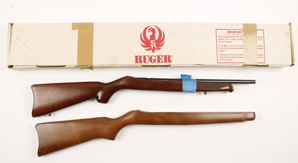 A barrel with a recessed crown, a custom stock with a schnabel forend, metal butt plate and irregular checkering, a regular stock, and a factory 10/22 box.