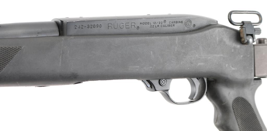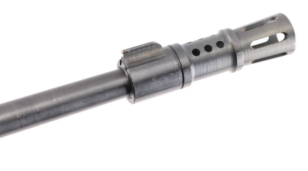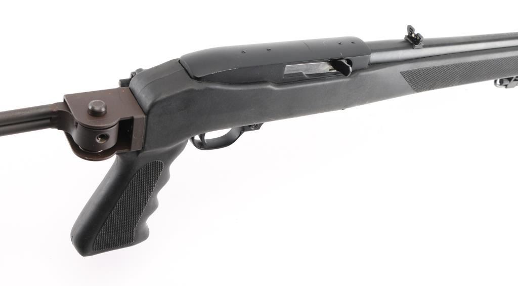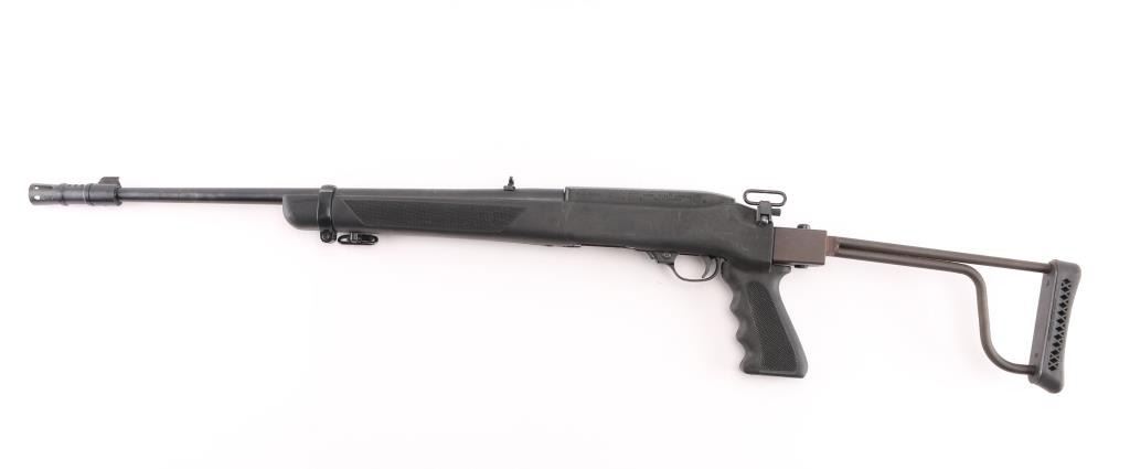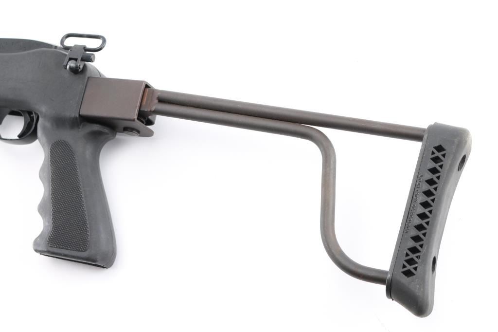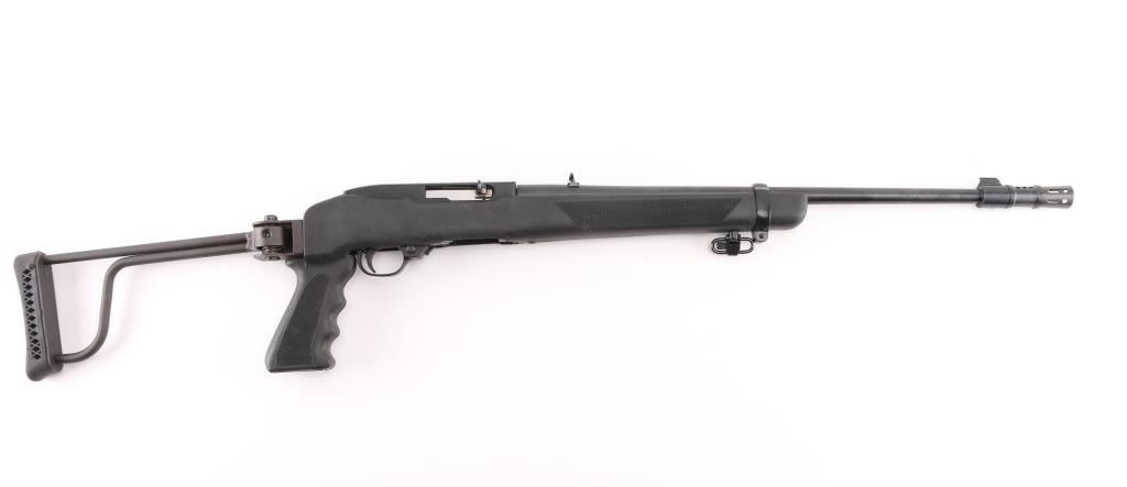 Semi-automatic Carbine chambered in .22 LR. 18 1/2" barrel with 2 1/4" muzzle brake, blade front sight with brass bead and flip-up adjustable rear sight, black polymer stock with checkered pistol grip and metal wire folding stock with a black rubber Butler Creek recoil pad, smooth trigger and push button safety, sling swivels attached and no magazine. LOP 13". Metal retains 98% of it's finish with 1 1/2" scratch on top front of receiver. Bore is excellent and action is smooth. Condition is NRA Excellent. Modern Firearm.
