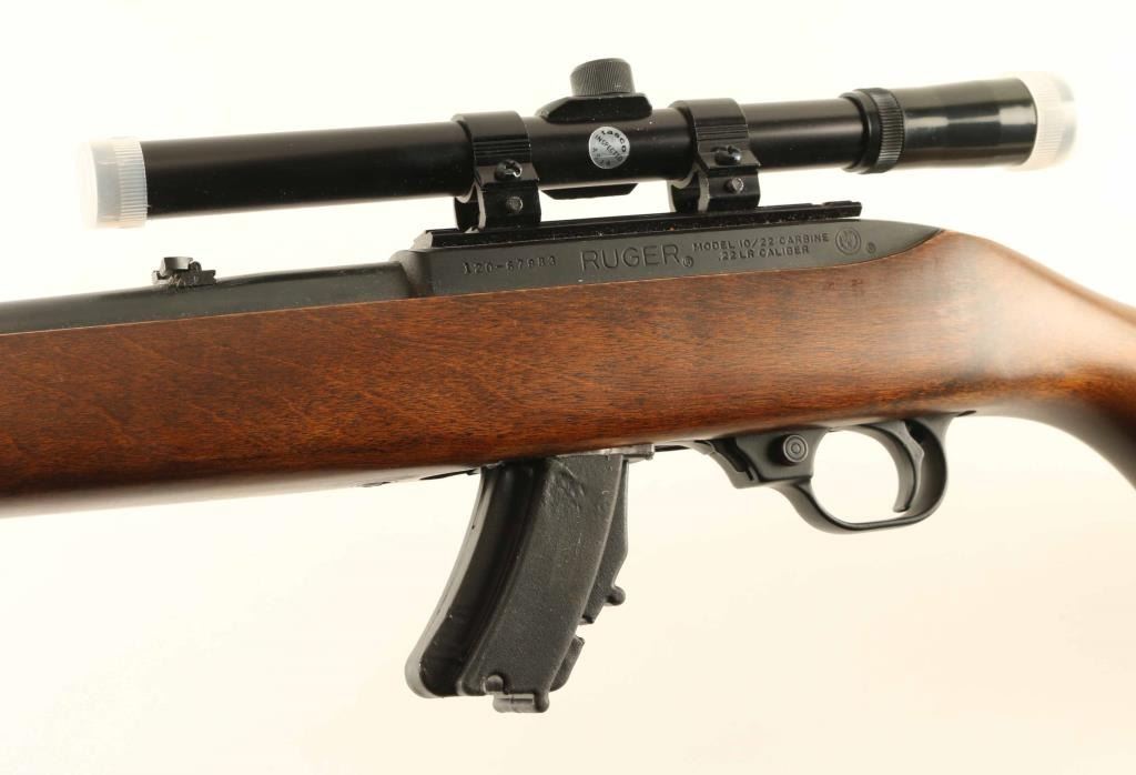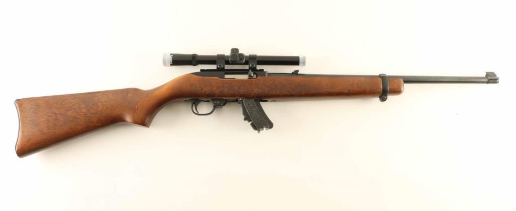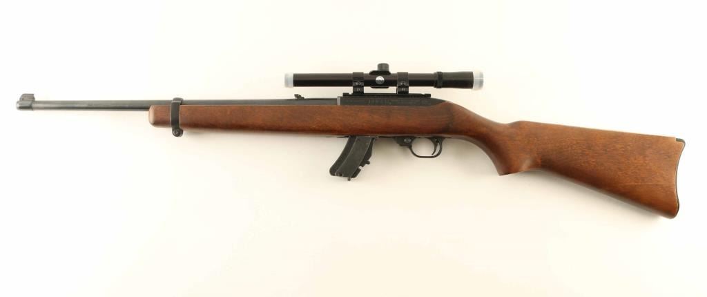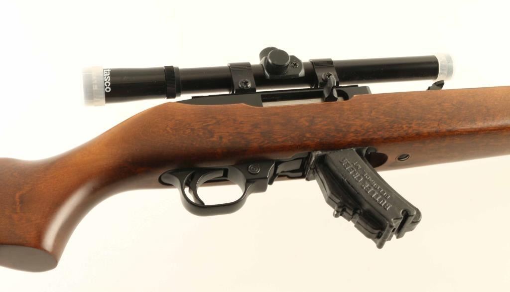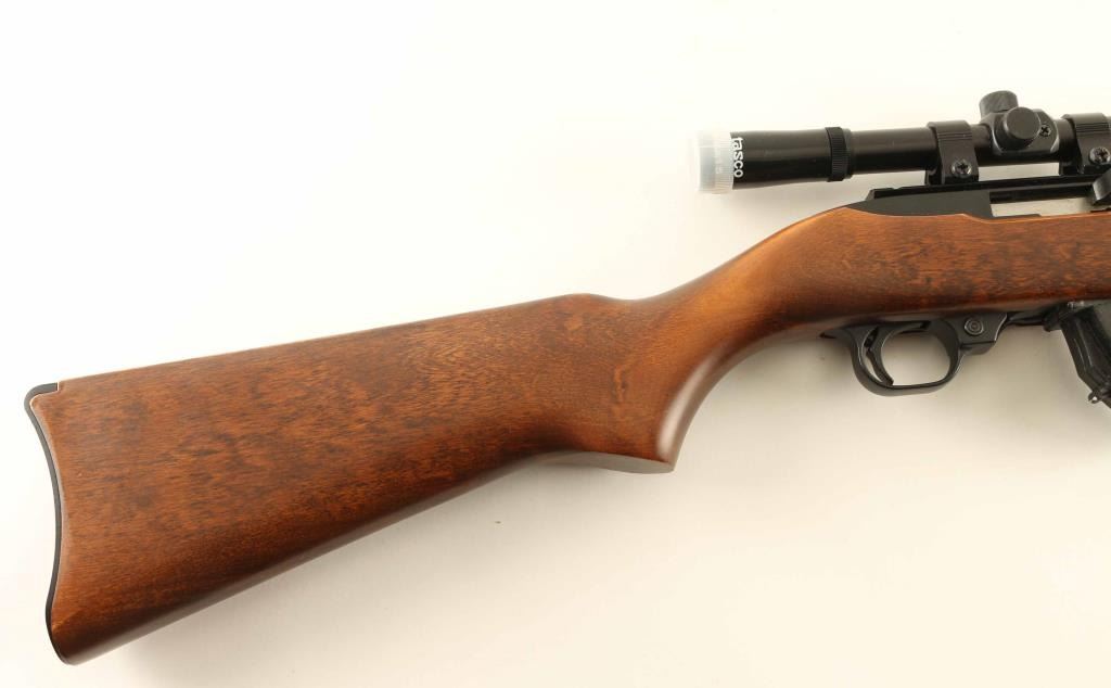 Semiautomatic rimfire rifle manufactured circa 1980. Features blued finish, wood stock with curved grip,18" barrel, blade front sight, folding adjustable rear sight, manual safety, NO magazine. Bore is good condition. Retains 90% finish with some light scuffing. Stock is very good to excellent condition with minor scuff on forend tip. Tasco 4x15 scope mounted. Condition is NRA Very Good Modern Firearm