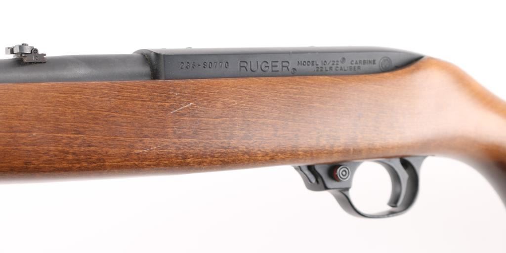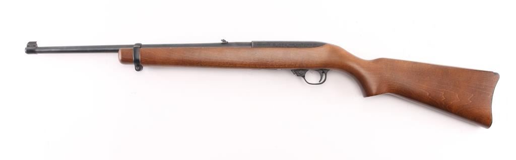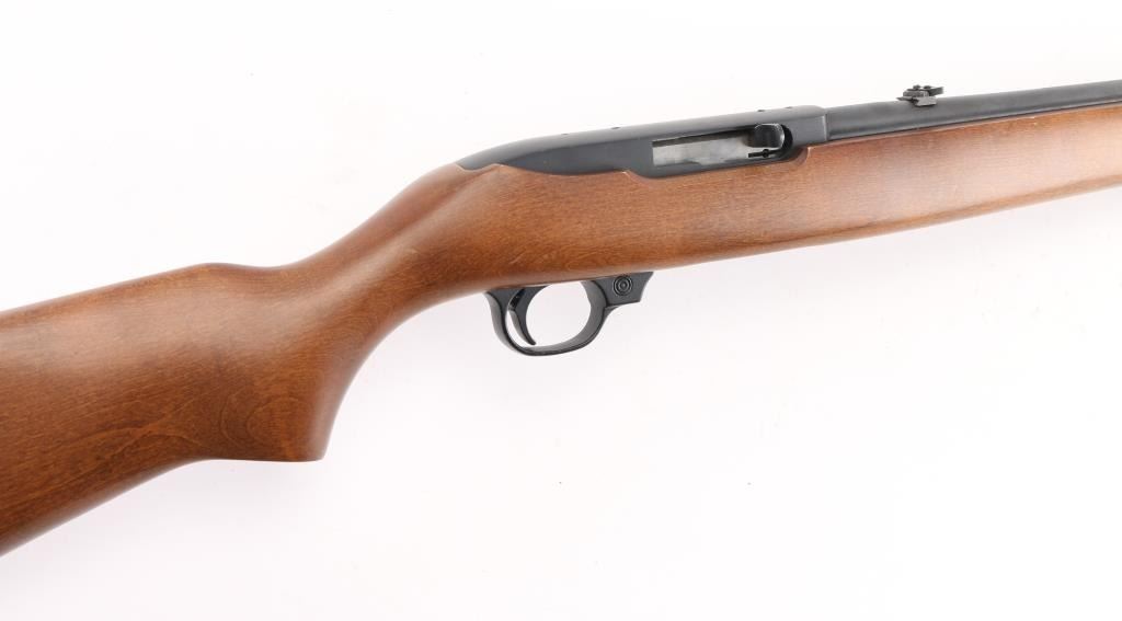Semiautomatic rimfire rifle features blued finish, smooth wood stock with curved grip, factory plastic butt plate, 18" barrel, blade/bead front sight, folding adjustable rear sight, manual safety, detachable 10-rd rotary magazine. Receiver drilled/tapped for optics. Bore is excellent. Blue finish is excellent.. Stock is excellent overall, few small scratches. Includes (1) magazine. Manufactured 1993. NRA Condition is Excellent. Modern Firearm.