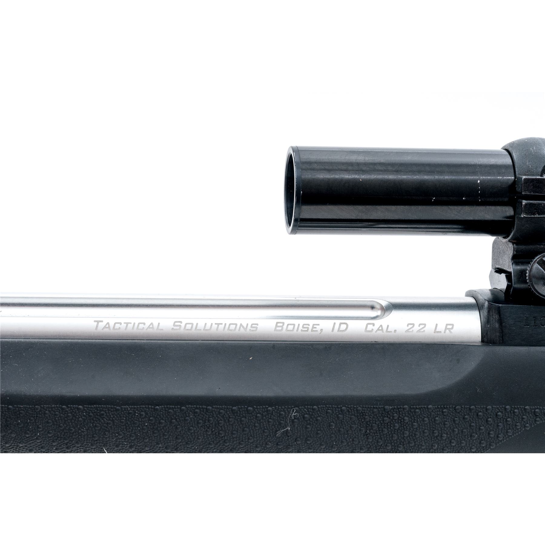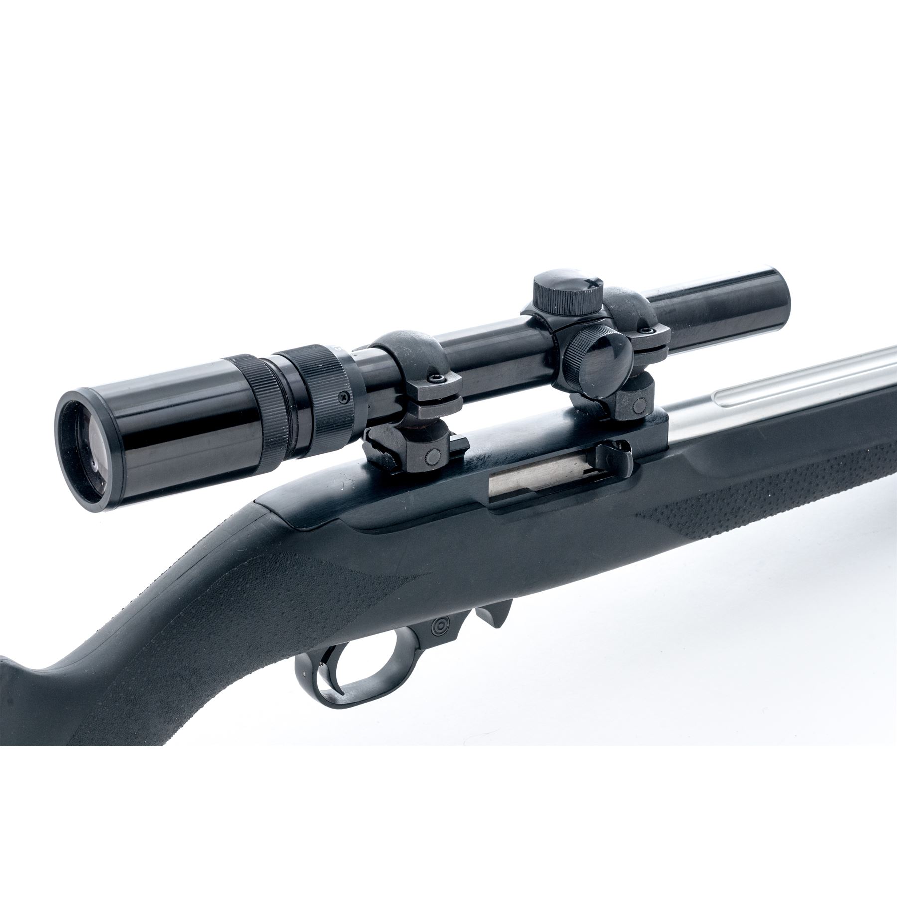 Ruger 10/22 Tactical Semi-Automatic Carbine, #110-52769, .22 L.R. cal., blued receiver; silver 16.5'' fluted lightweight aluminum Tactical Solutions barrel mfg'd without sights; black Hogue over-molded stock with black rubber pad and sling swivel studs. Featuring a target trigger, extended magazine release, and one clear 10-round Ruger magazine. Topped with a Bushnell Sportview 1.5x-4.5x21 scope; scope with duplex reticle and gloss black finish. Metal surfaces are excellent with only a few slight handling marks. Stock rates as fine with scattered light surface scuffs and other small marks, all normal signs of moderate range use. Excellent smooth action with a mirror bright bore. Scope with a few light scratches and ring marks to the exterior; excellent clear optics. Est.: $300-$500. (Modern)