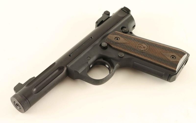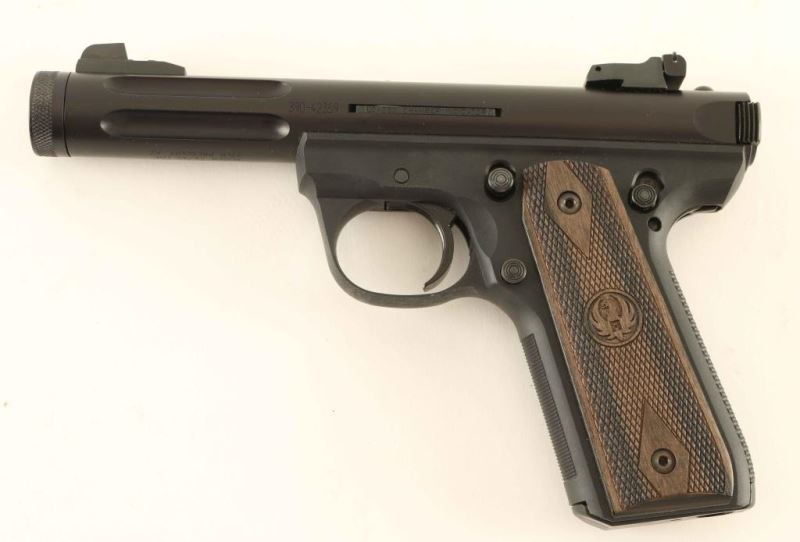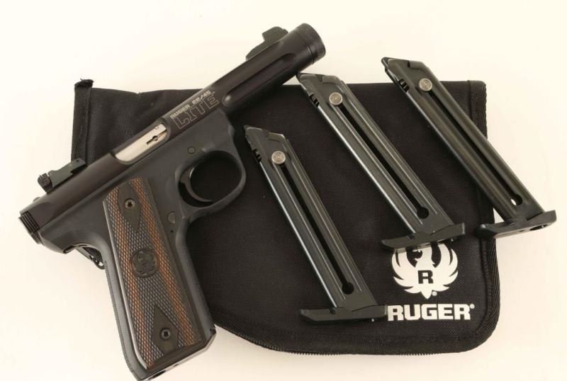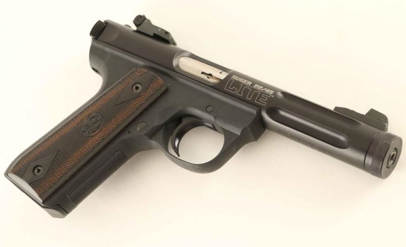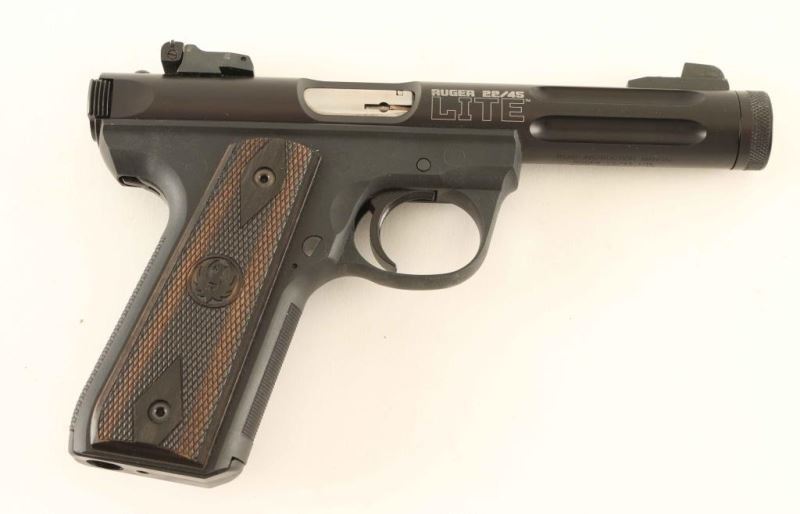 Prescott, Arizona made lightweight single action semi-automatic pistol chambered in .22 Long Rifle, circa 2013. The 22/45 series utilized the same grip angle and magazine release position as the 1911, the Lite version weighs only 23 ounces. Features a matte black finish, 4.4" threaded barrel with knurled thread protector, patridge-style front sight, adjustable rear sight, drilled & tapped receiver with flutes cut over the barrel, serrated trigger, loaded chamber indicator, thumb safety, magazine disconnect safety, push button magazine release, factory 10 round magazine, black Zytel grip frame, and two-piece checkered brown & black laminated wood grips. Includes the original factory cardboard box with a padded soft case, three spare magazines, a scope rail, lock and documents. Pistol exhibits few minor handling marks with no major wear observed. Action is smooth, bore is pristine and the wood grips are fine. Condition is near NRA Perfect. ***Modern Firearm***