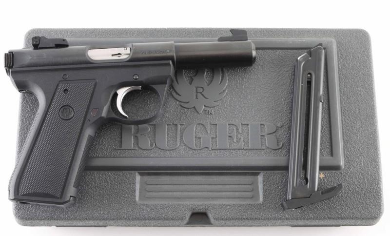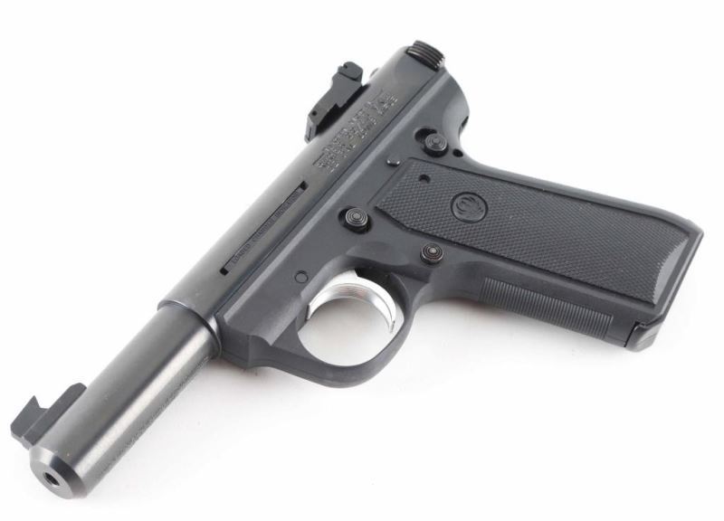 Semiautomatic rimfire pistol features blued finish, black polymer frame with checkered panels, 4" heavy barrel, adjustable sights, push button magazine release, manual safety, nickel plated trigger, loaded chamber indicator. Bore is excellent. Overall condition is almost like new with few signs of handling. Includes (2) magazines, gray plastic Ruger box, manual. Condition is NRA Excellent *** Modern Firearm ***