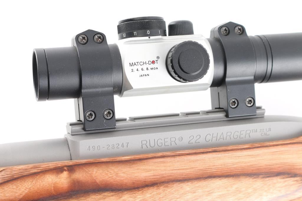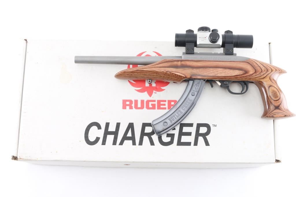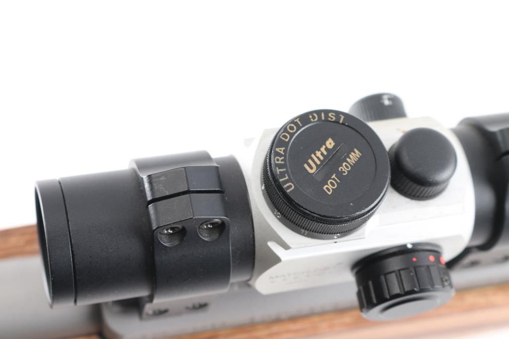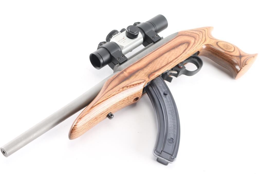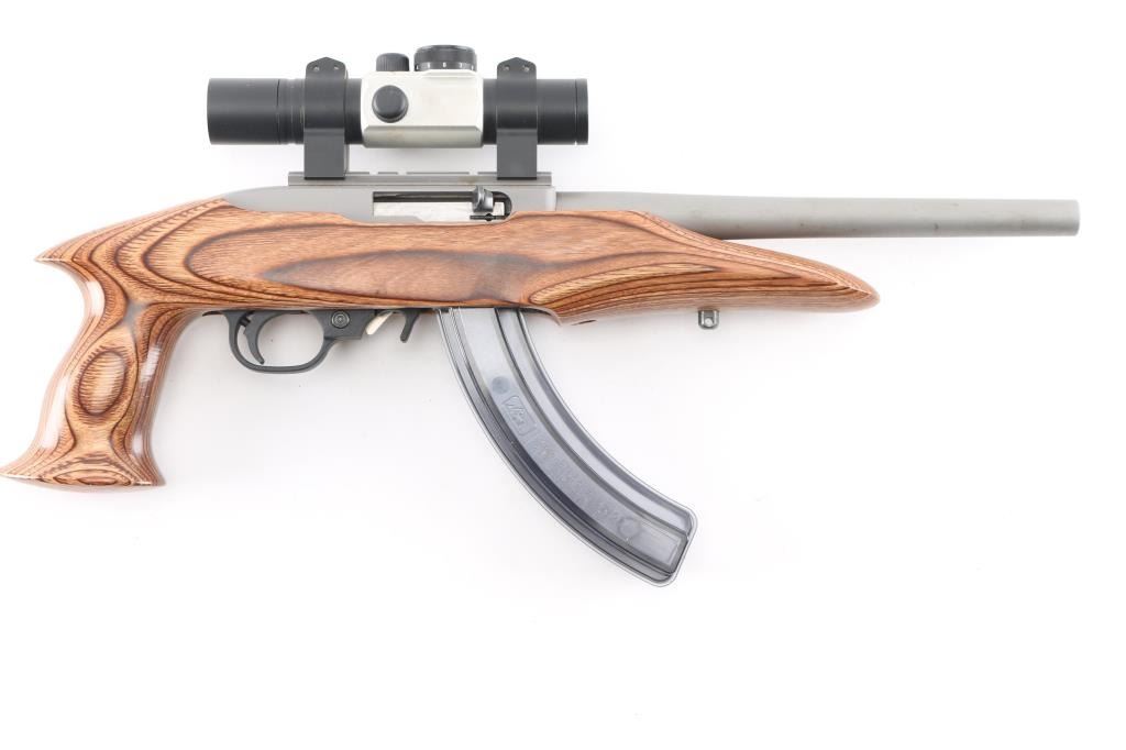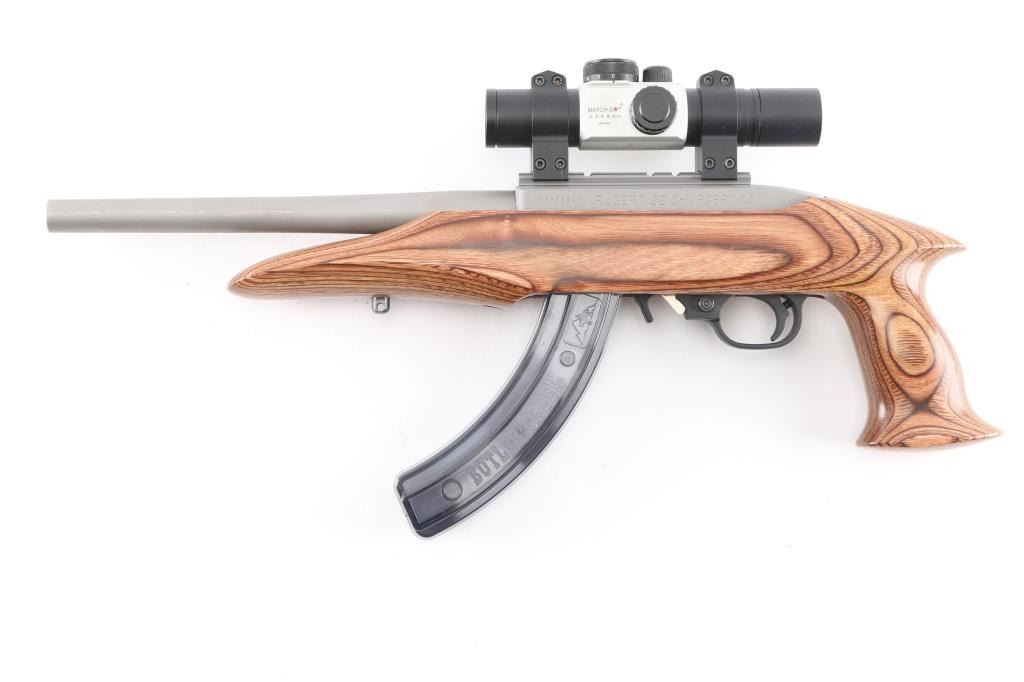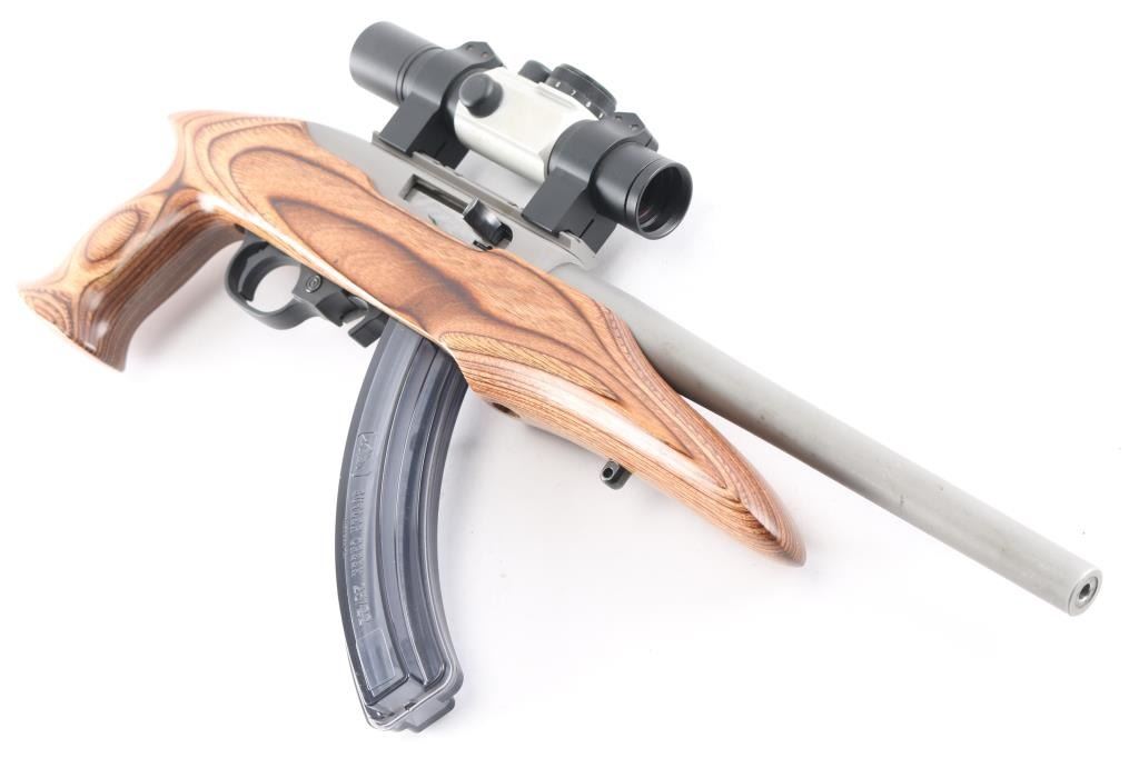 Semi-automatic pistol chambered in .22 Long Rifle, circa 2008. Features a matte grey finish, 10" tapered barrel with no provisions for sights, mounted Ultradot red-dot scope, smooth light brown laminated hard wood pistol grip stock, push button safety, smooth charging handle, serrated trigger, magazine release lever, sling swivel stud. Bore is bright with strong rifling. Retains approx. 98% finish with small scattered scratches on barrel. Wood is excellent and scope is clear. Includes original factory cardboard box, manual, lock and bracket. NRA condition is excellent.***Modern Firearm***