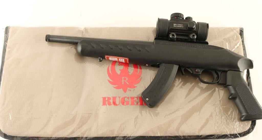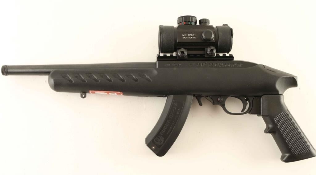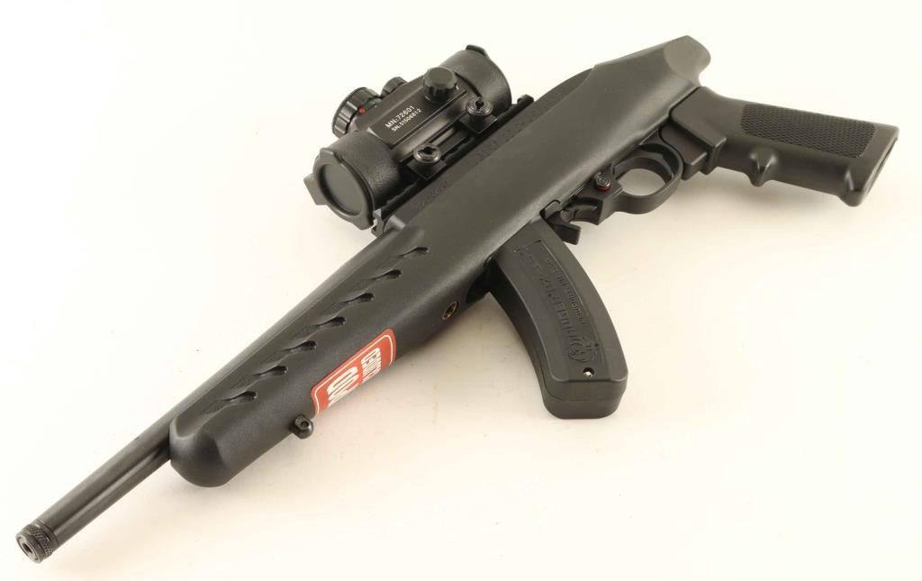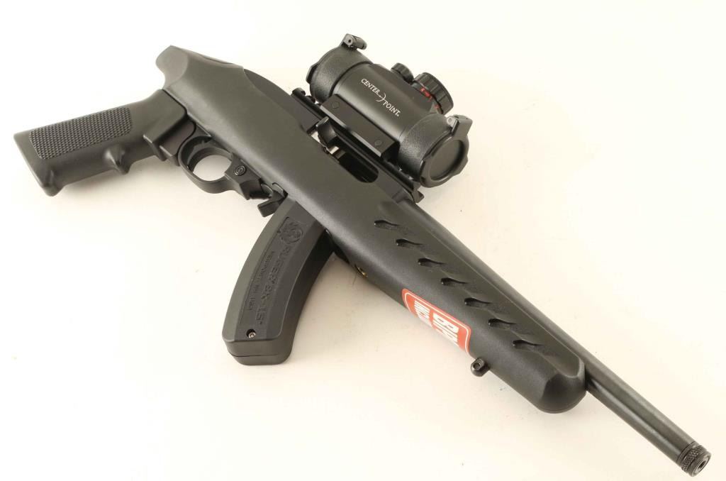 Semi-automatic pistol. 98% blued barrel, with matte-black receiver. Black synthetic, pistol grip stock. , with sling swivel studs. 10" threaded barrel. Bore is excellent/bright Action is tight. Mounted with a center Point, green-dot sight (Operable) There is a scratch, and a small blemish on top of the barrel, otherwise, the pistol is in almost new condition. Comes in the original factory box, with paperwork, one 15-rd magazine, bipod, and Ruger lock. Ruger nylon case is included. NRA Condition-Excellent. Modern Firearm.