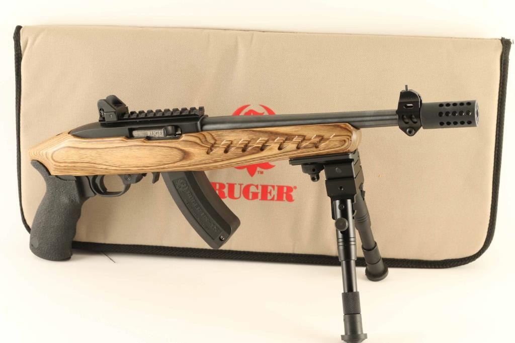 Pistol variation of the magazine-fed semi-automatic Ruger 10/22 rifle, chambered in .22 Long Rifle and manufactured circa 2017. Features a blued 10" threaded barrel with installed muzzle break, UTG elevation adjustable post front sight clamped to the barrel. installed optics rail with a windage adjustable UTG aperture rear sight installed, adjustable UTG bipod, factory BX-15 15 round magazine, push button safety, smooth charging handle, textured trigger, matte black finished alloy receiver, and contoured brown laminated wood stock with Blackhawk pistol grip. Includes the original factory cardboard box with padded soft case, documents and lock. Pistol exhibits approximately 99%+ of it's original finish showing few minor handling marks with no major wear observed. Action is smooth, the bore is excellent, and the wood stock is fine. Condition is NRA Excellent in case. ***Modern Firearm***
