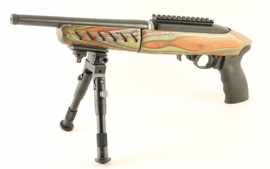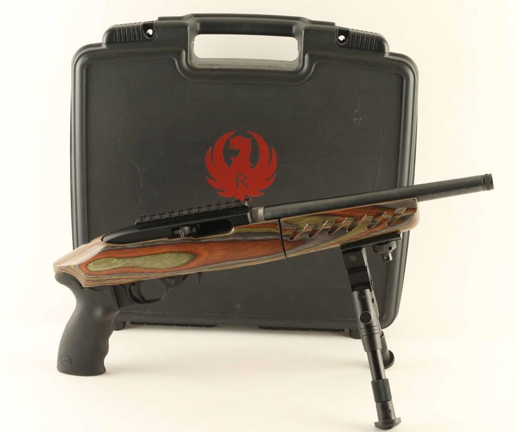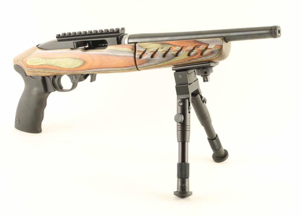 Take-down pistol variant of the magazine-fed semi-automatic Ruger 10/22 rifle. Features a blued/black finish, threaded 10" take-down barrel without provisions for sights, knurled thread protector, factory optic rail, adjustable 6-8.5” bipod, textured trigger, push button safety, (1) magazine, smooth charging handle, alloy receiver, and contoured Green Mountain laminate two-piece stock with textured forend & A2 pistol grip. Includes the original factory hard case with fitted foam interior. Overall condition is excellent with minor handling marks and some bright wear on the optic rail. Condition is NRA Excellent *** Modern Firearm ***