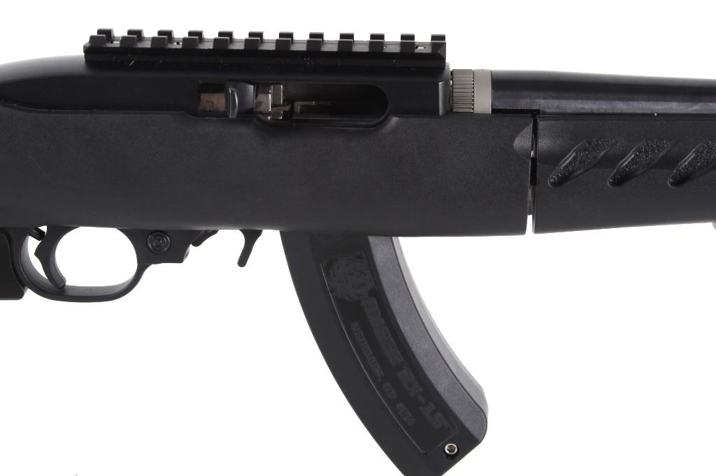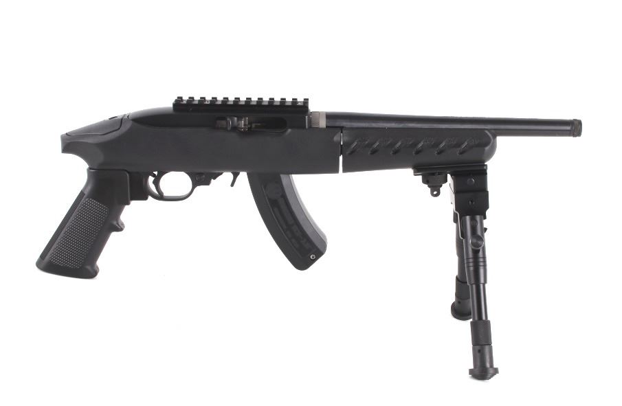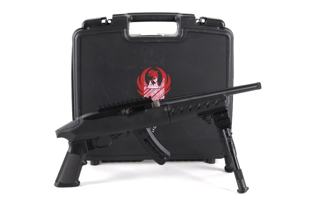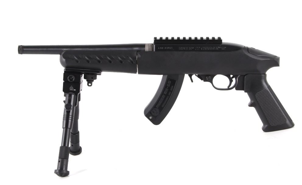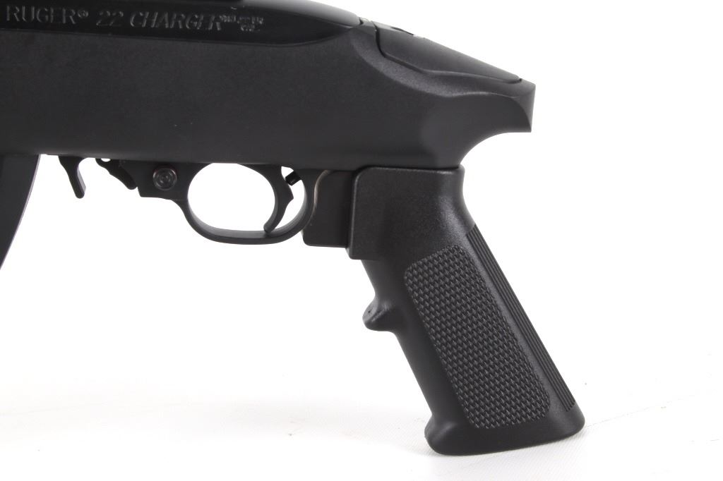 Featured in this lot we have a Ruger 22 Charger takedown rifle chambered in .22 long rifle and comes with its Ruger carry case. The rifle displays a 10" long round barrel, checkered grip, semi automatic action, attachment rails, removable 15 round magazine, and attachable bipod. The rifle is designed with a quick takedown system allowing the barrel and front grip to be separated from the frame and reattached easily. The frame is marked on the left side reading "Ruger 22 Charger TM .22 LR CAL" with the serial number and the top of the barrel is marked with "Ruger Newport NH USA". The rifle comes with its Ruger fitted carry case showing foam interior with cut out sections for the individual parts. The piece shows good condition and weighs 6lbs 4oz. Serial Number: 490-81965. This is a modern firearm and requires a FFL transfer or NICS background check.