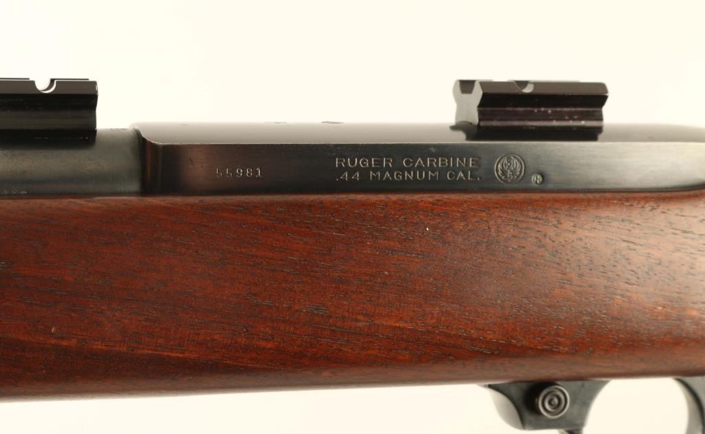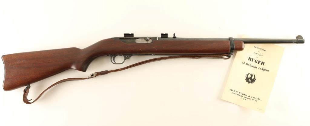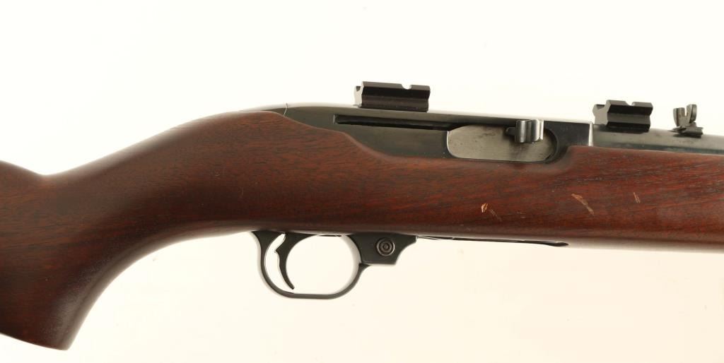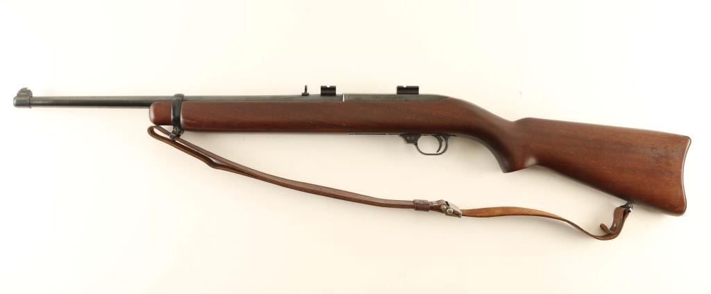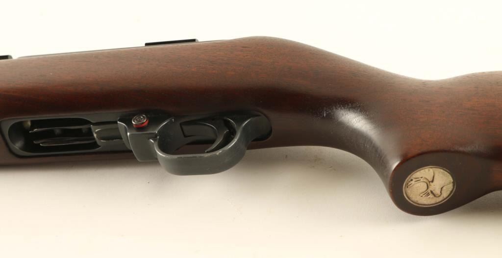 Semiautomatic carbine features appox 18.5" barrel, buckhorn style sights, tube magazine under barrel, manual safety, sling swivels, Weaver style scope base (no rings, no scope). Bore is very good or better condition. Retains 90% blued finish with thinning or bare metal at sharp edges and side of barrel near muzzle, scratches and scuffs. Wood is very good condition with small dents and scratches. Canadian quarter has been inlaid into bottom of grip. Includes very good condition leather sling, reprint of original instruction manual. Condition is NRA Very Good *** Modern Firearm ***