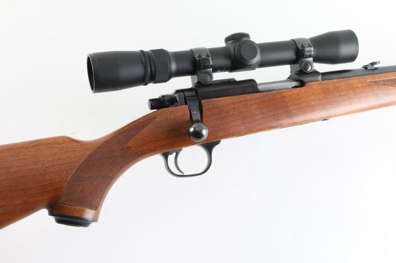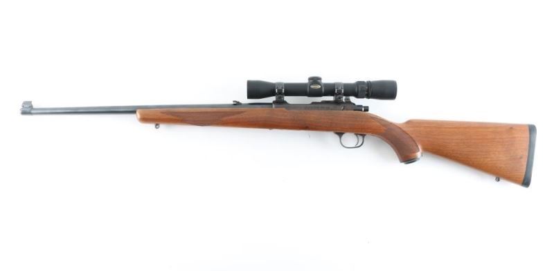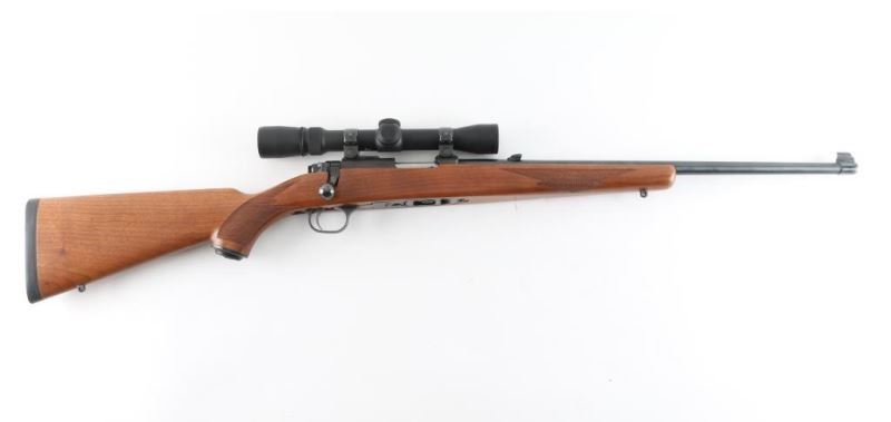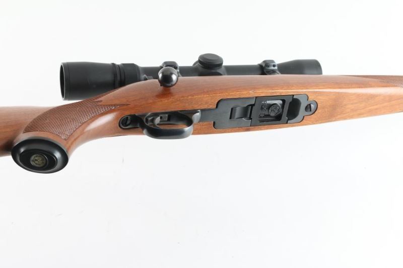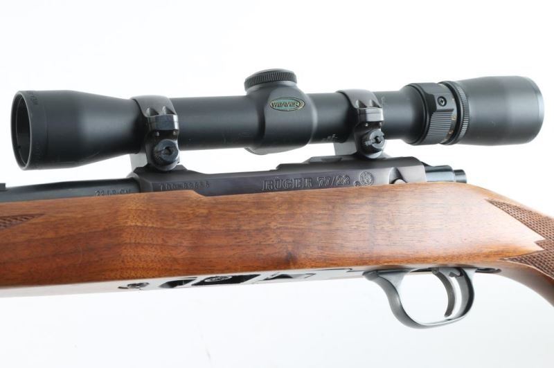 American made bolt action rifle chambered in .22LR, circa 1990. It features the famous Ruger 10 round rotary magazine, a 20" blued barrel and receiver with integral scope bases machined into the receiver, a raised blade front sight, a flip up rear sight, a thumb safety on the right side of receiver at the tang with a metal trigger guard and serrated trigger. The one piece straight grain stock has checkering at the wrist and forearm, swivel studs, black Ruger grip cap and butt pad. Comes with a Weaver Classic RV-7 2.5-7x28mm scope and rings. LOP is 14". Bore looks great, bright. Metal finish looks very good with little sign of handling. There is a small spot on the bolt handle that has a loss of finish. Wood stock looks great with almost no signs of handling. Condition is NRA Very Good+