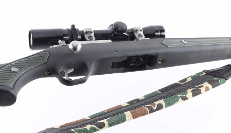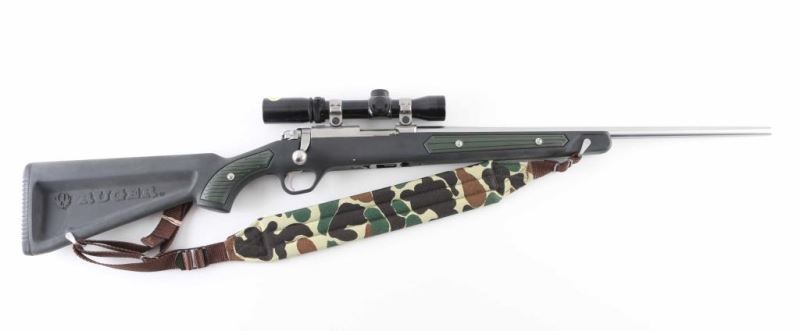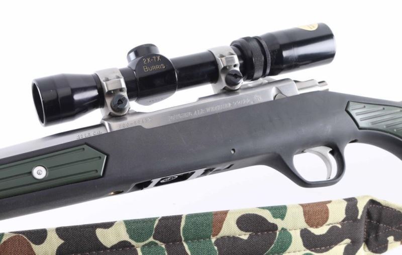 'All-Weather' Bolt action rimfire rifle features stainless steel construction, black polymer stock with grooved green polymer insert panels at forend & curved wrist, no cheekpiece, thin serrated rubber buttplate, sling swivels, 20" barrel, no sights, scalloped dovetails on receiver for scope mounting, detachable magazine, manual safety. Bore is very good condition. Overall external condition is like new with few minor handling marks. Mounts a Burris 2x-7x scope with clear view, duplex reticle. Condition is NRA Excellent *** Modern Firearm ***