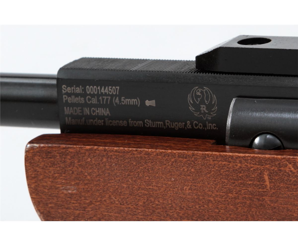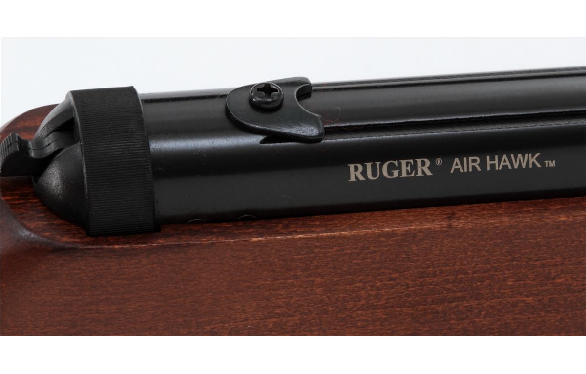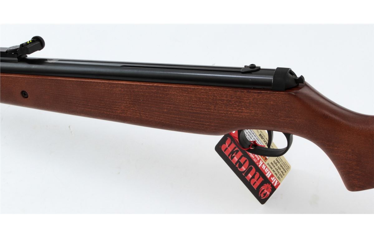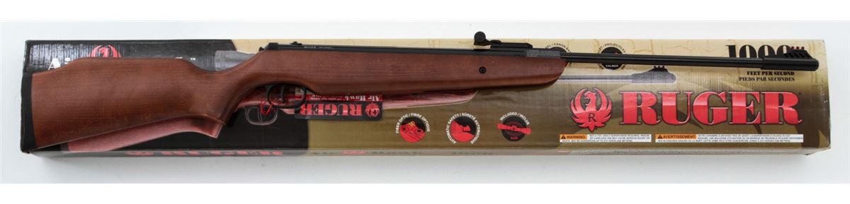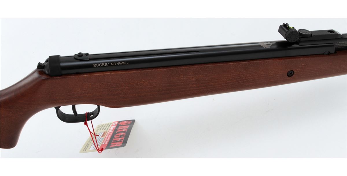 Ruger AirHawk Combo 1000 Single Shot Air Rifle, #000144507, .177 cal., 17'' barrel, black finish, birch stock, with fiber-optic sights. Appearing as new and unfired, in original box, with only light marks from gun shop rack handling. Retails @ $140. Est.: $50-$100.