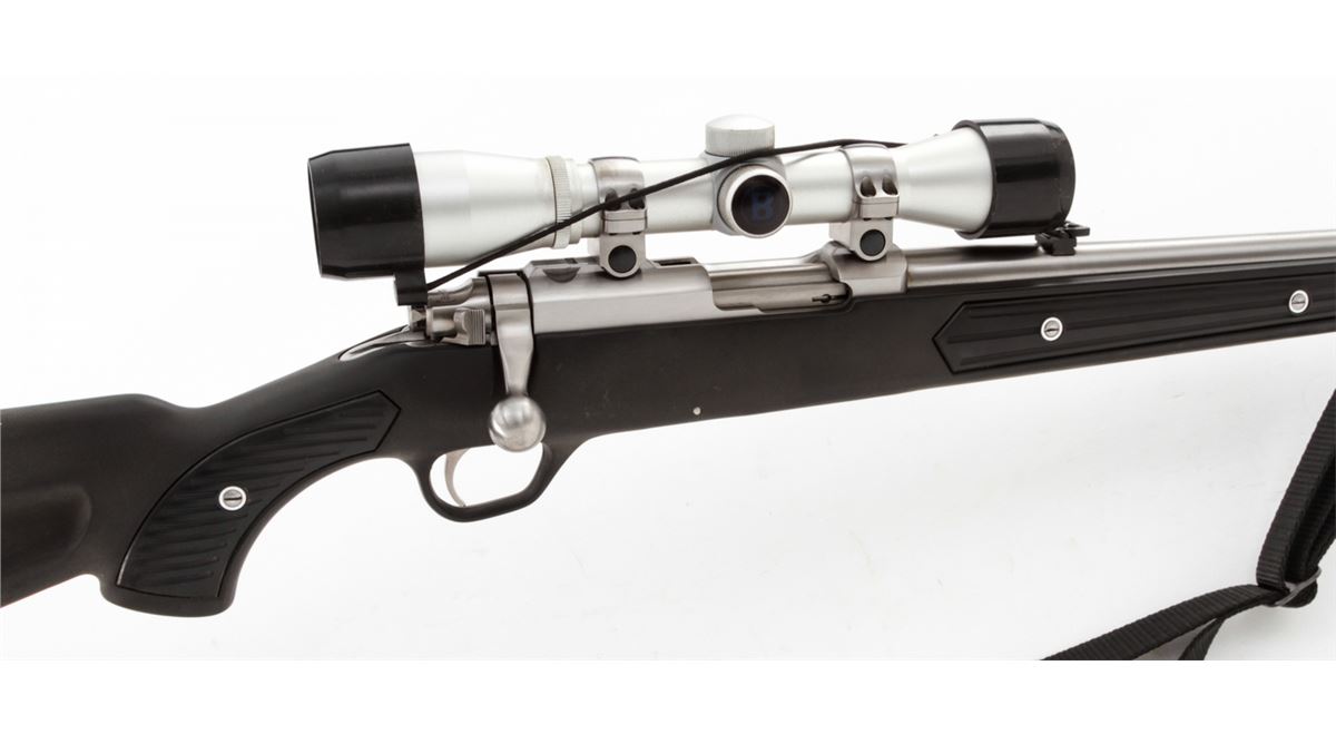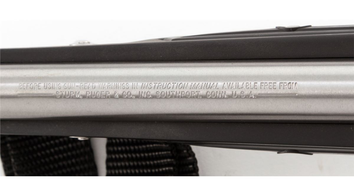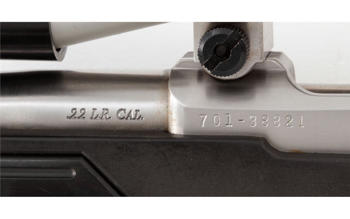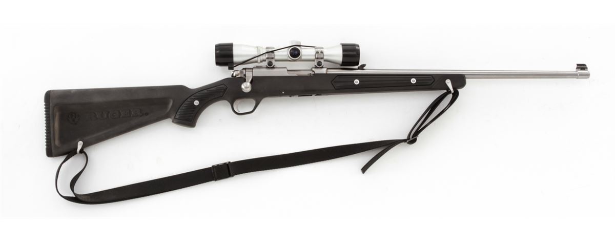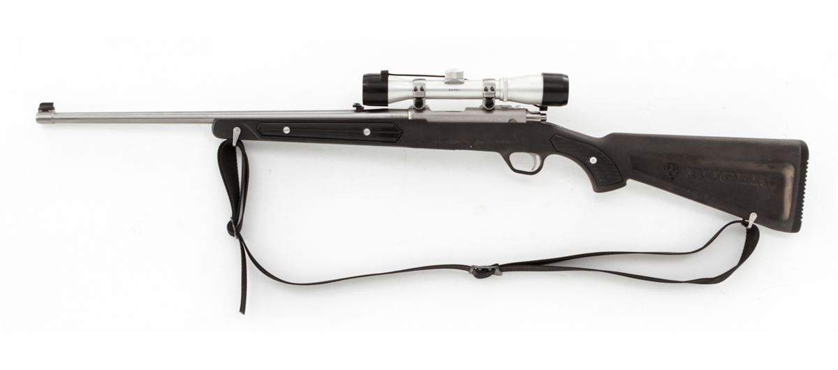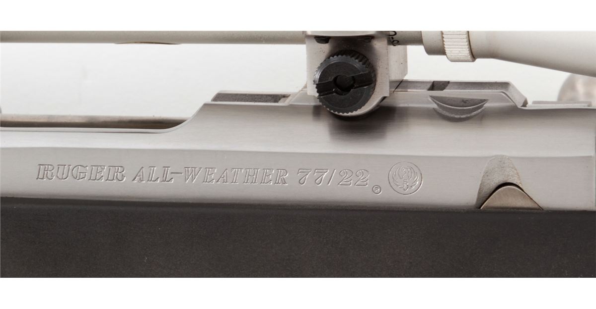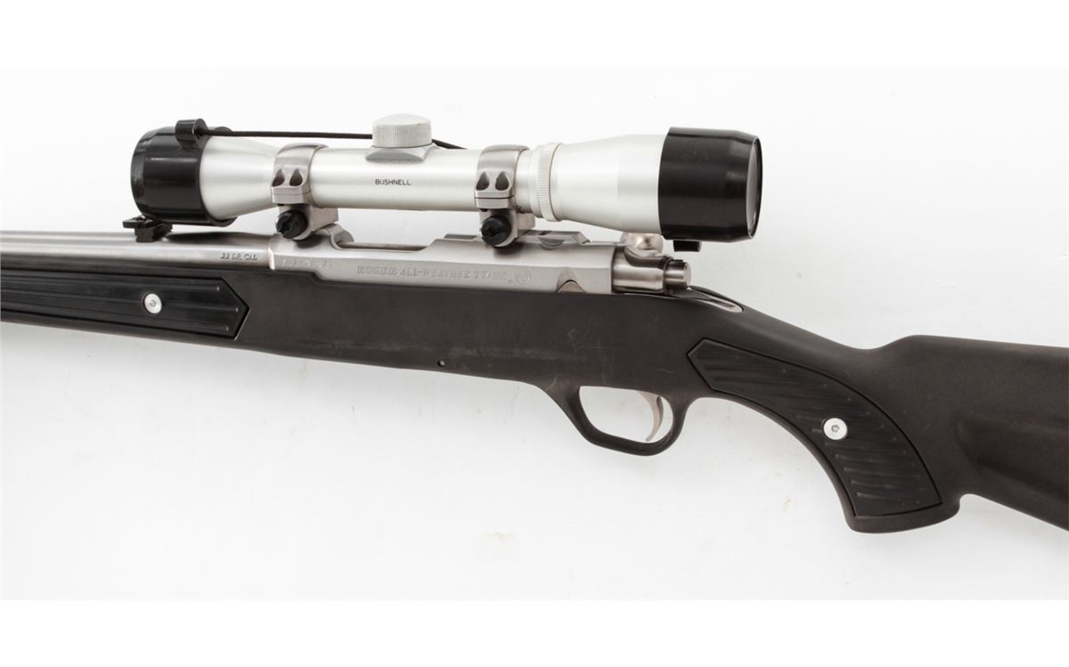Ruger All-Weather 77/22 Bolt Action Rifle, #701-38821, .22 LR cal., 20'' barrel, stainless steel, factory nylon stock. Topped with a Bushnell scope on Ruger rings. Condition is excellent showing light marks from field use, but otherwise near new. Scope optics are clear. Est.: $400-$600. (Modern)