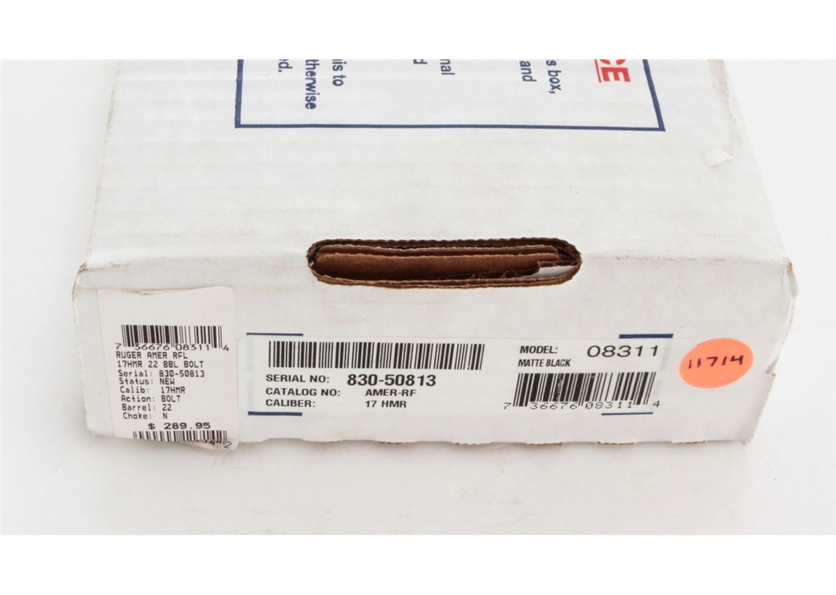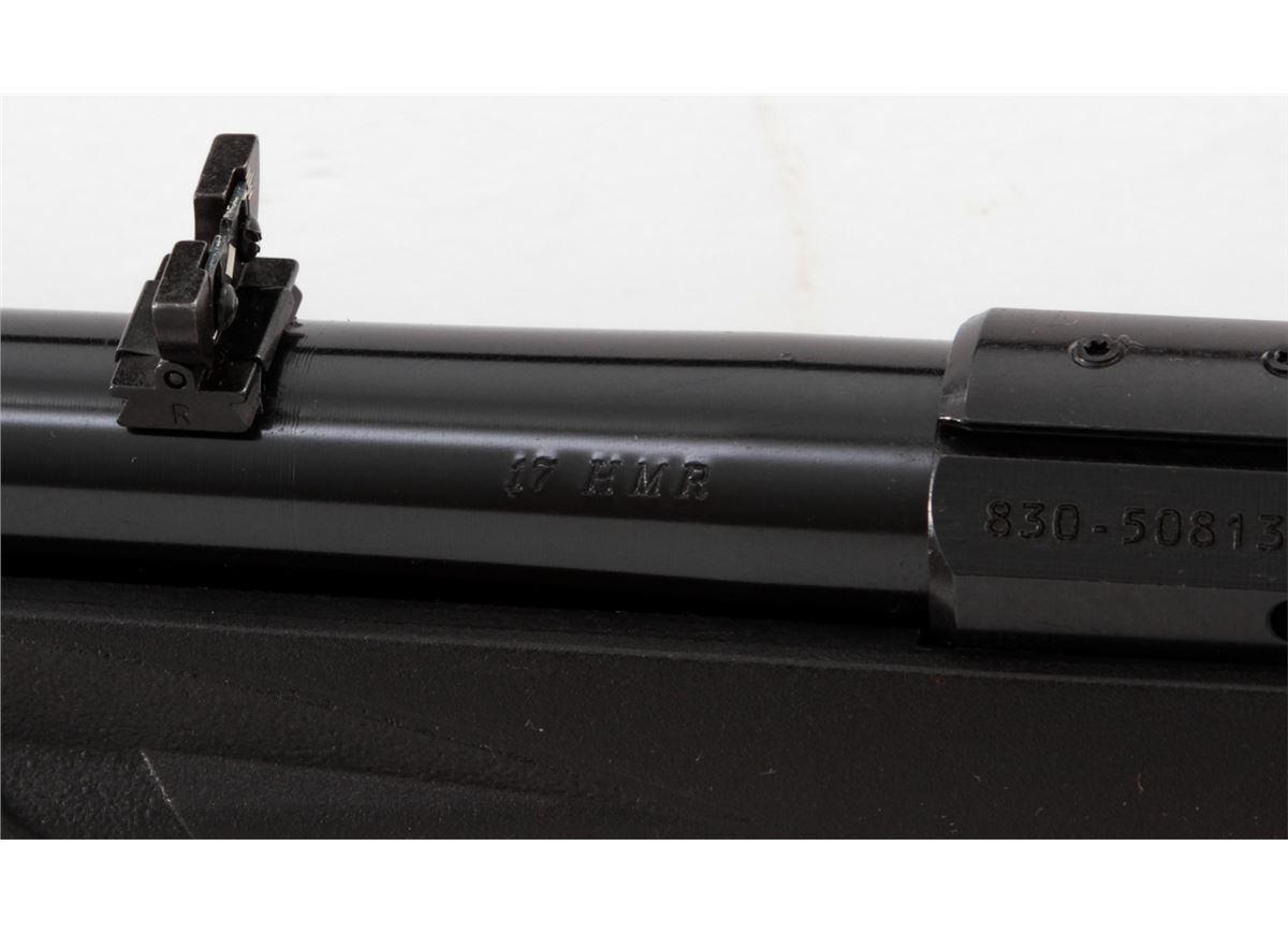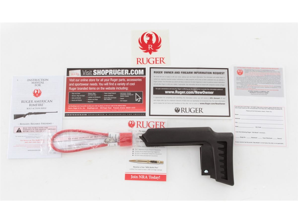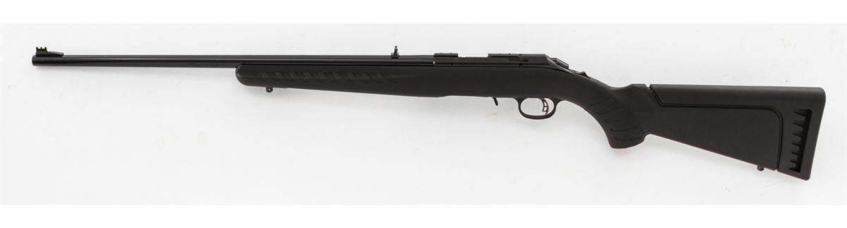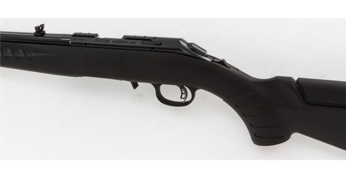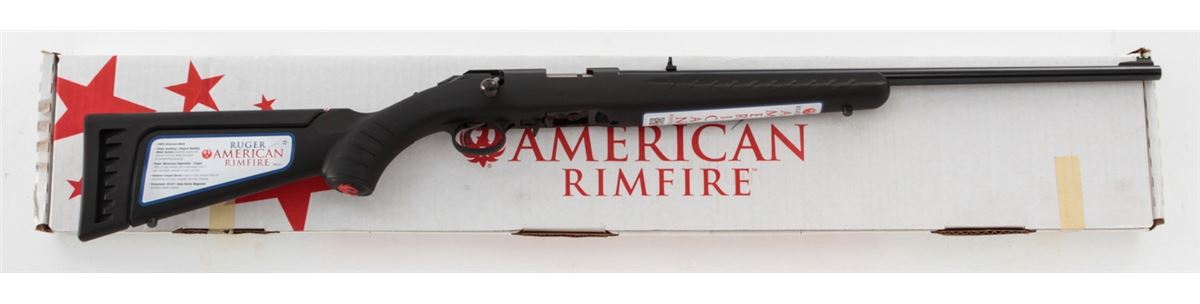 Ruger American Rimfire Bolt Action Rifle, #830-50813, .17 HMR cal., 22'' barrel, dark blue finish, black pistol-grip composite stock, fiber optic front sight, folding rear sight, additional but stock with high comb cheekpiece, with one (1) magazine and gun lock, in original box with matching end label and owner's manual. Condition is excellent remaining new and unfired; original Ruger stickers remain intact. Box with moderate damage. Retails @ $289.95, Est.: $150-$250. (Modern) (Field Time)