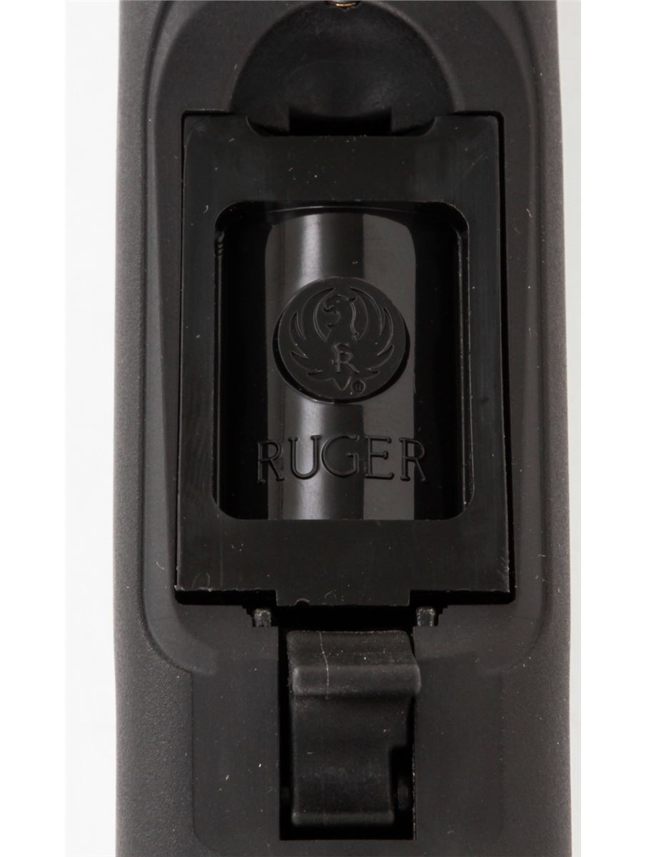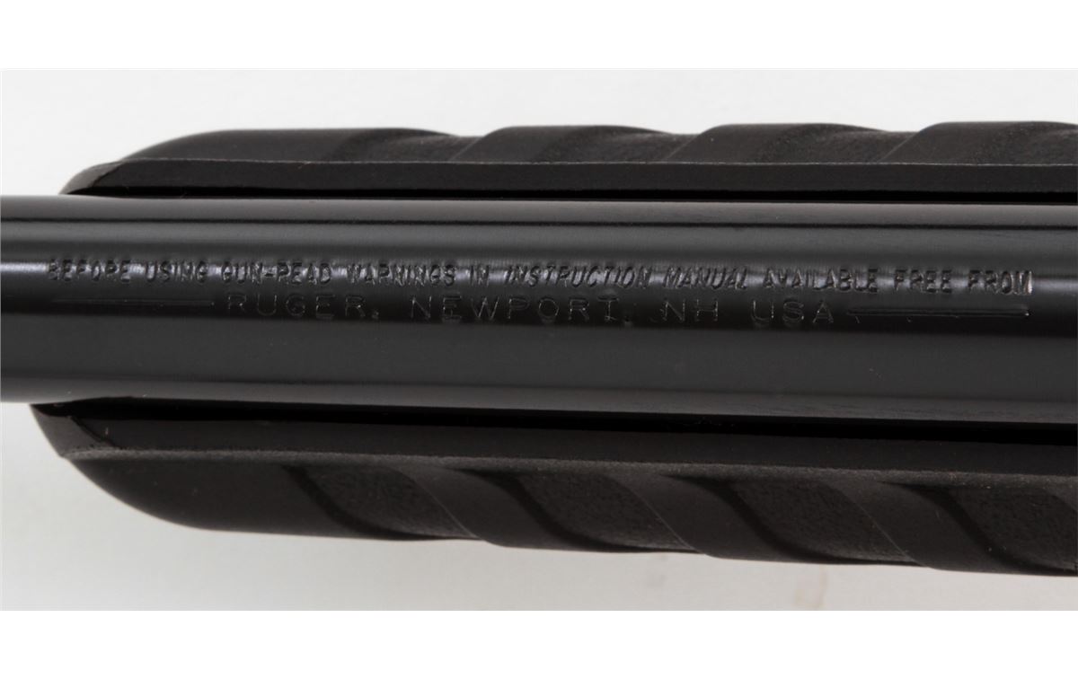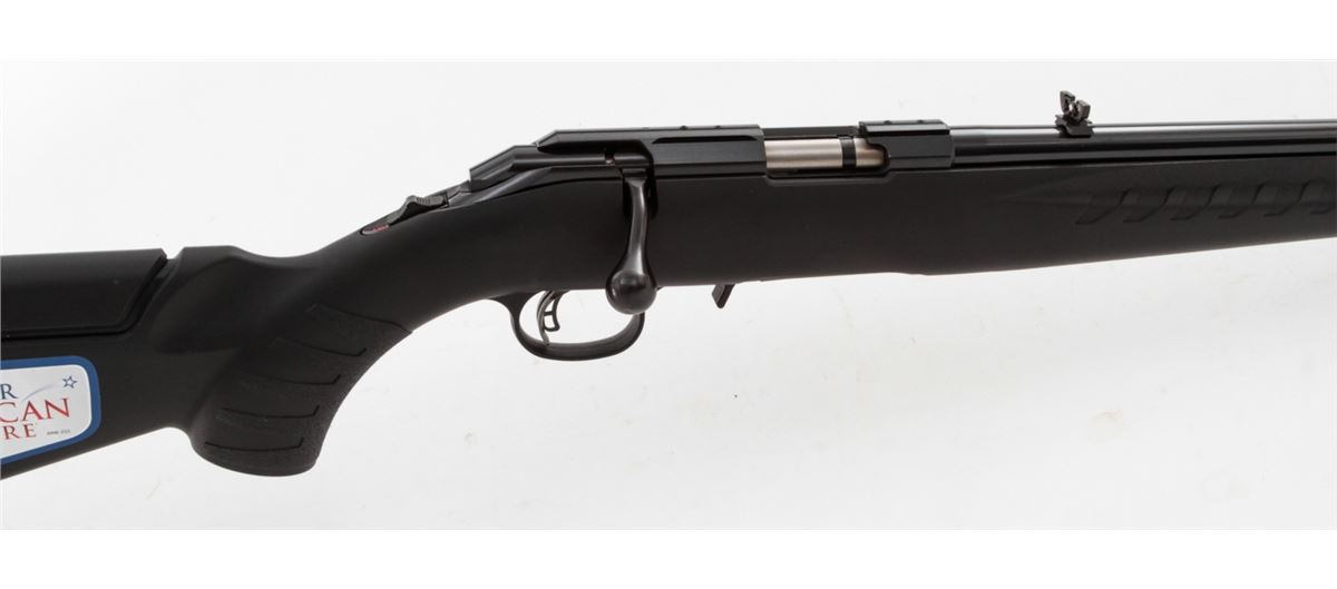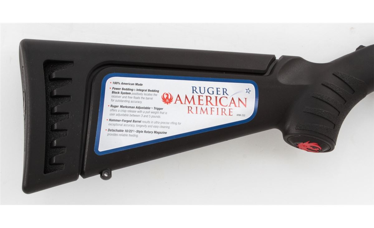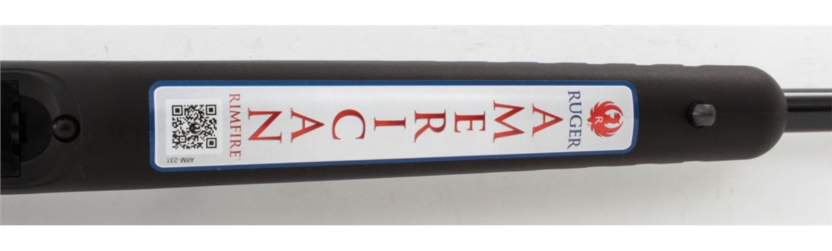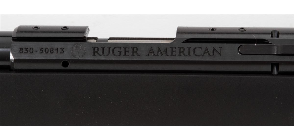 Ruger American Rimfire Bolt Action Rifle, #830-50813, .17 HMR cal., 22'' barrel, dark blue finish, black pistol-grip composite stock, fiber optic front sight, folding rear sight, additional but stock with high comb cheekpiece, with one (1) magazine and gun lock, in original box with matching end label and owner's manual. Condition is excellent remaining new and unfired; original Ruger stickers remain intact. Box with moderate damage. Retails @ $289.95, Est.: $150-$250. (Modern) (Field Time)