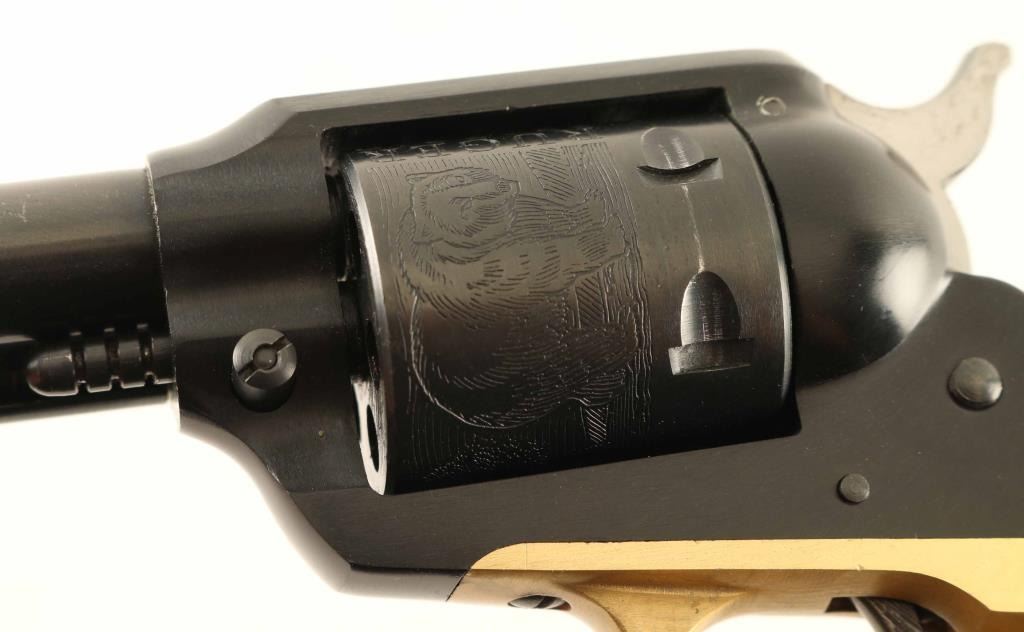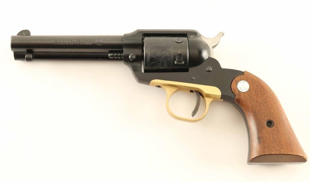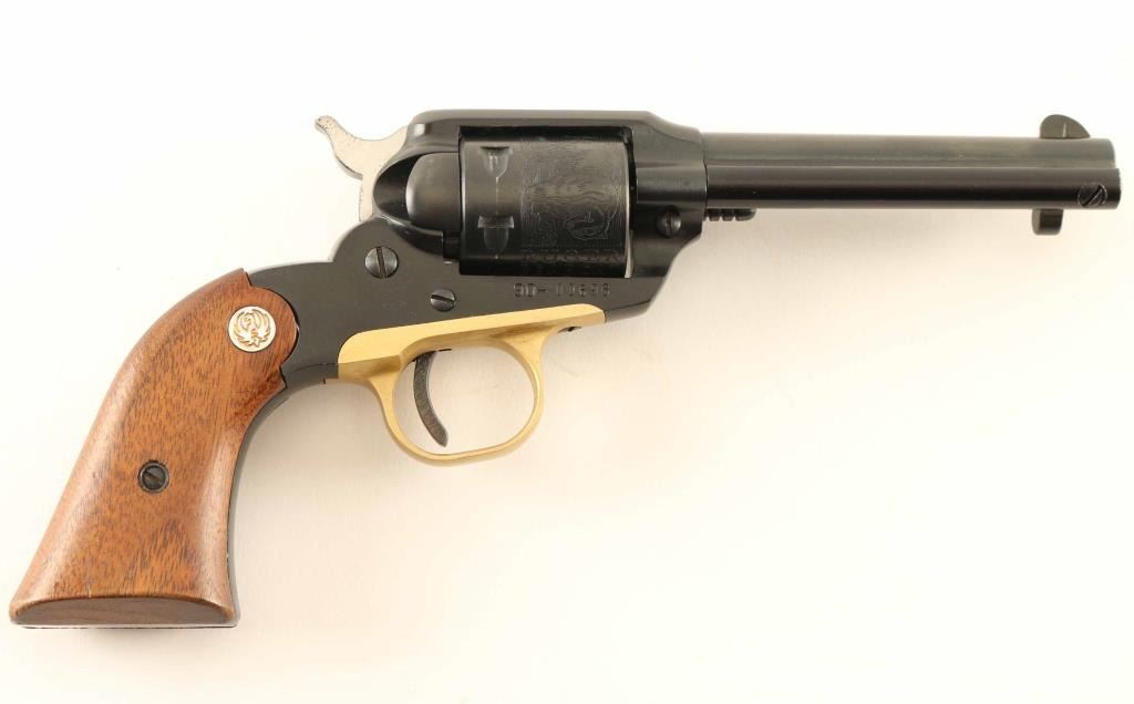 ‘Old Model’ Small frame single action revolver modeled along the lines of a scaled down Remington 1890 and chambered in .22 Long Rifle. Manufactured circa 1969. Features a blued/black anodized finish, 4" barrel, ejector rod, blade front sight, square notched rear sight, alloy frame, non-fluted six shot cylinder with roll-stamped bear & cat scenes, brass colored anodized alloy trigger guard, smooth thin trigger, serrated hammer spur, and two-piece smooth walnut grips with Ruger medallions. Revolver exhibits approximately 94% of it’s original finish showing a faint drag line and light holster wear/handling marks on the barrel. Action is crisp, bore is excellent, and grips very good with a few minor blemishes. Condition is NRA Very Good++. ***C&R Firearm***