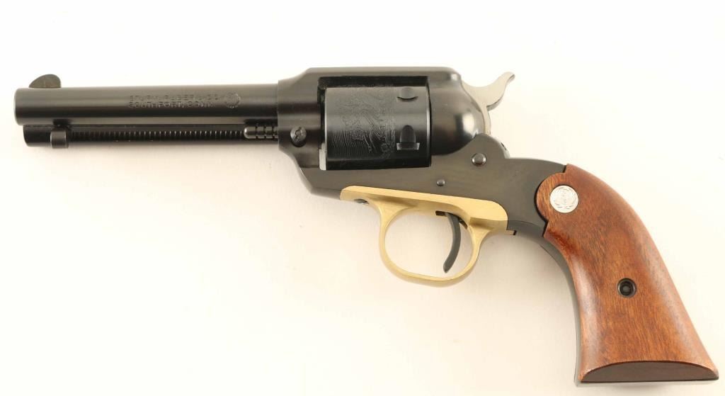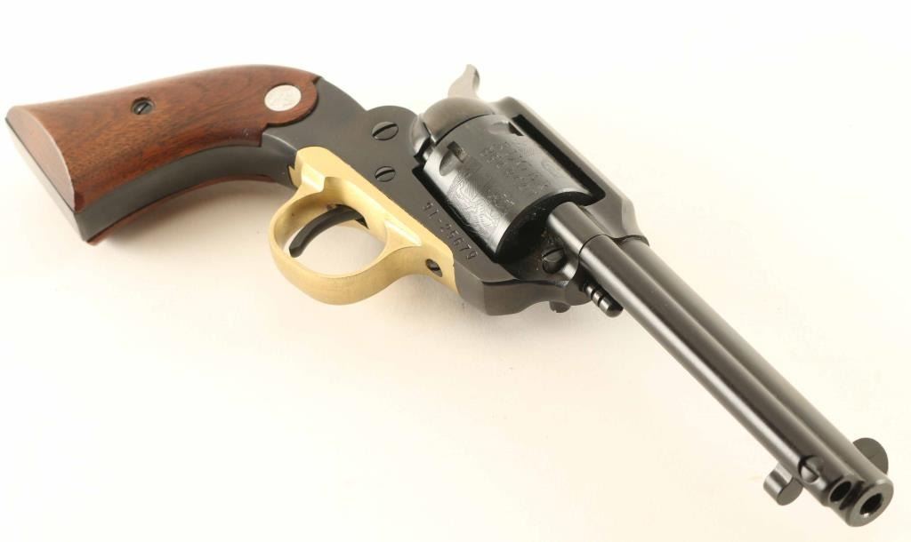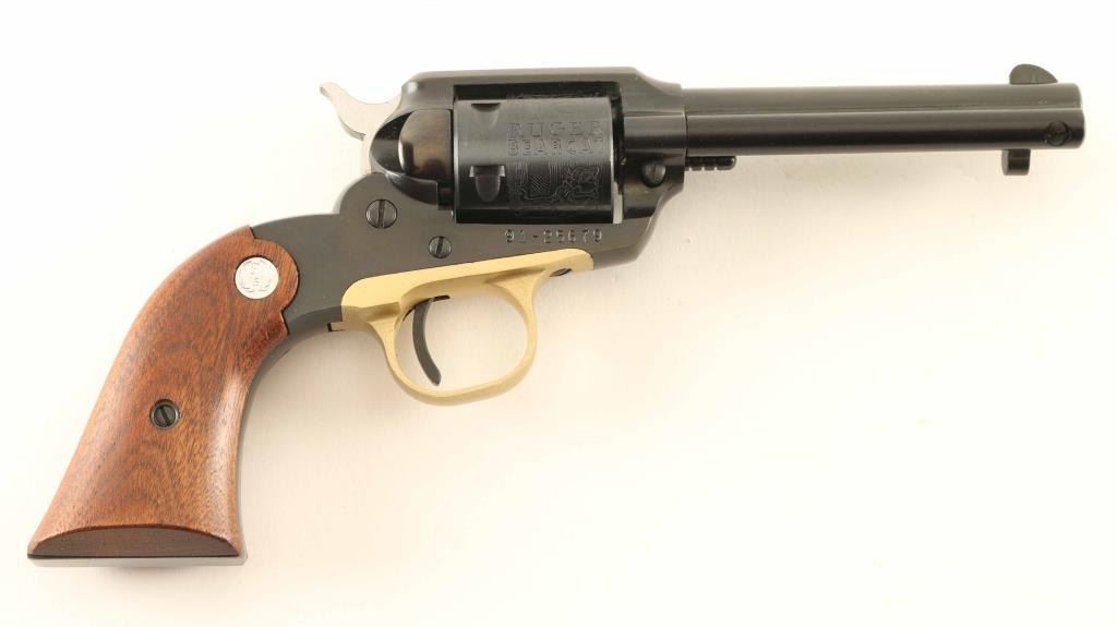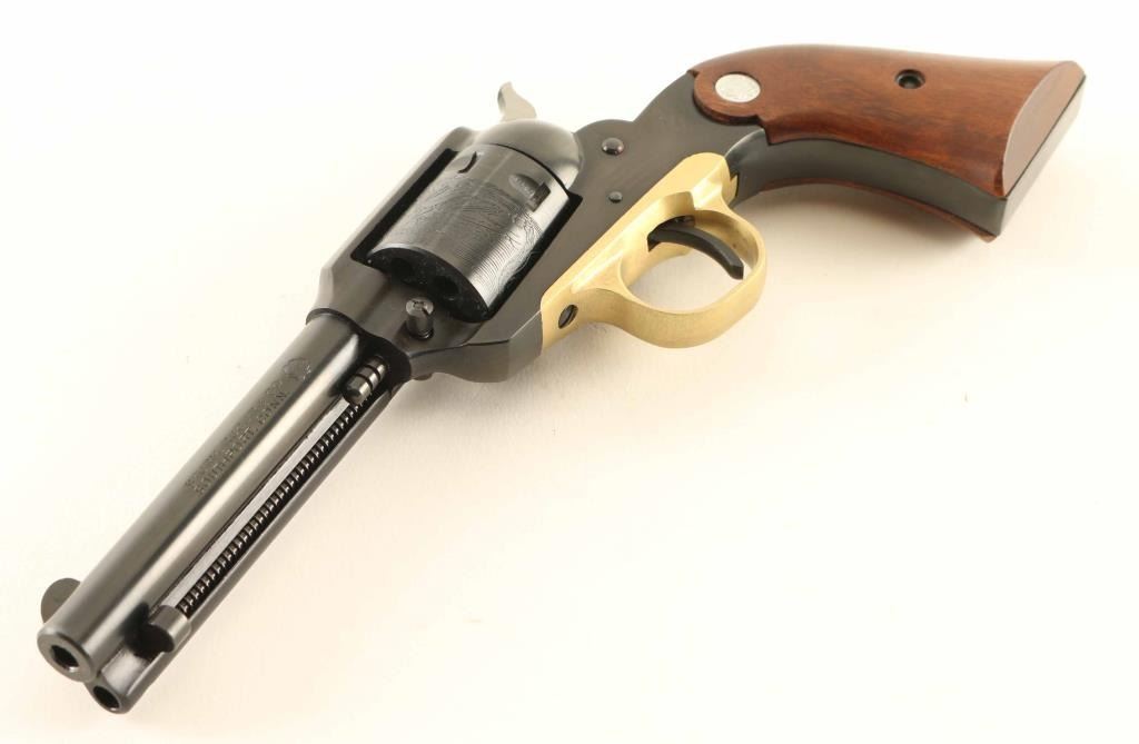 Small frame single action rimfire revolver modeled along the lines of a scaled-down Remington 1890, manufactured circa 1972. Features a blued/black anodized finish, 4" barrel, blade front sight, square notched rear sight, ejector rod, non-fluted six shot cylinder with roll-stamped bear & cat scenes, smooth thin trigger, brass colored anodized alloy trigger guard, serrated hammer spur, alloy frame, and two-piece smooth wood grips with Ruger medallions. Revolver exhibits approximately 99% of it’s original finish showing very little wear. Action is crisp with very good lock-up, the bore is pristine, and the wood grips are near fine with a couple small dings Condition is NRA Excellent. ***Modern Firearm***
