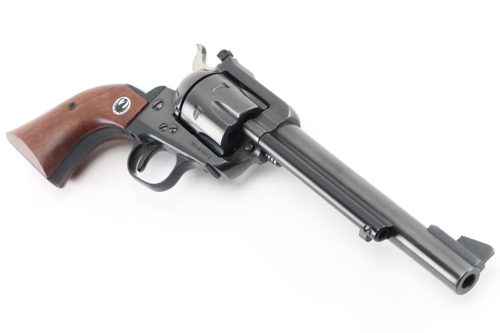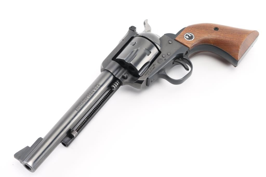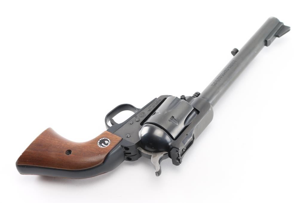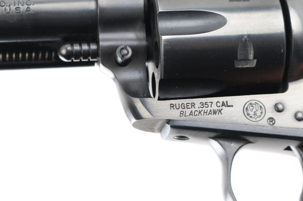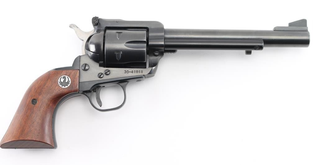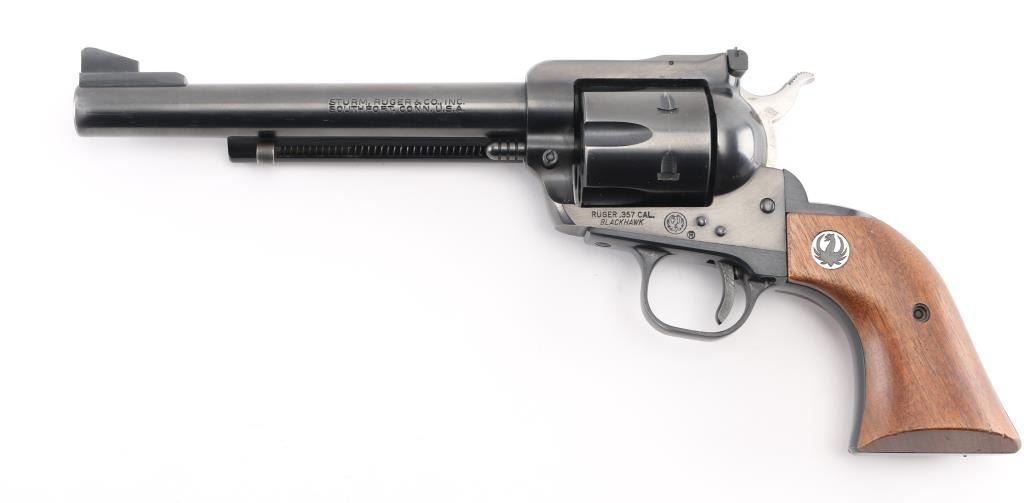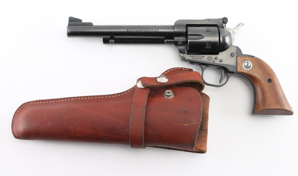 Old Model, Three Screw' Vintage American made single action revolver chambered in .357 Magnum, manufactured circa 1970. Features a blued finish, 6 1/2" barrel, raised serrated ramp front sight, Micro adjustable rear sight, smooth thin trigger, serrated hammer spur, fluted six-shot cylinder, flat top three-screw frame, black finished aluminum alloy grip frame and two-piece smooth walnut grips with Ruger medallions. Revolver retains most of it's original blued finish showing muzzle wear and light drag wear on the cylinder. Good lock-up, the bore appears very good, needs cleaning, and the wood grips are very good. Comes with Hunter brown leather snap holster. Condition is NRA Very Good. C&R Firearm.