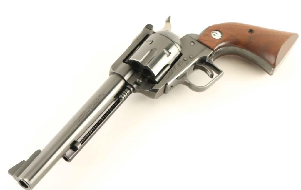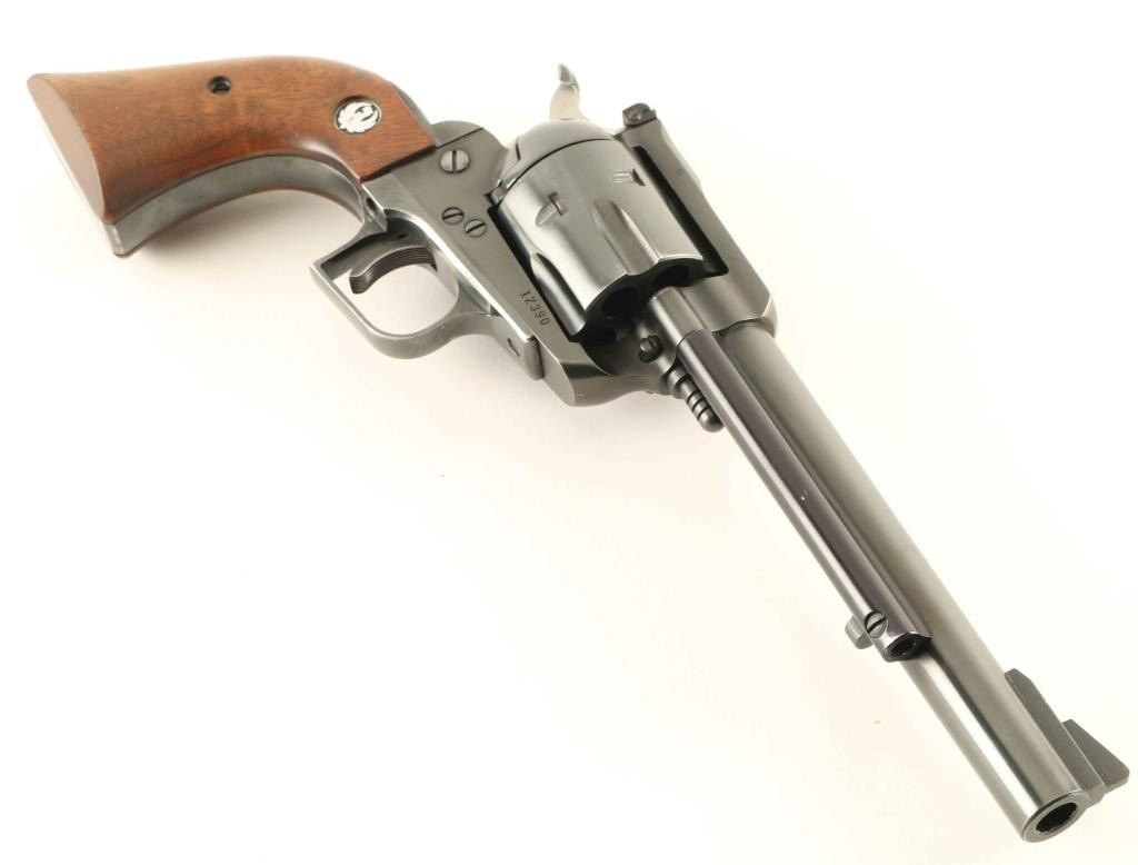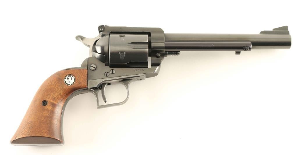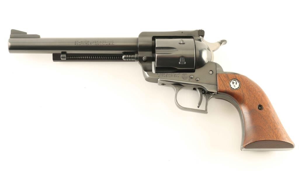 'Three Screw' Vintage American made single action revolver chambered in .41 Magnum, manufactured circa 1968. Features a blued finish, 6 1/2" barrel, raised serrated ramp front sight, adjustable rear sight, serrated wide trigger, serrated wide hammer spur, fluted six-shot cylinder with counterbored cylinders, collared cylinder pin, ejector rod with flat-faced button, three-screw frame, steel grip straps and two-piece smooth walnut grips with Ruger medallions. Revolver retains approximately 90% of it's blued finish showing edge wear, thinning on the grip straps and some small scattered losses. Action is smooth with very good lock-up, the bore is pristine and the wood grips are near fine with small imperfections. Condition is NRA Very Good+++. ***C&R Firearm***