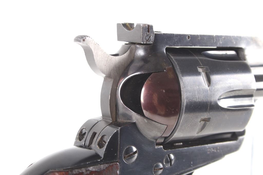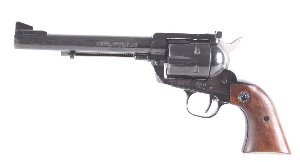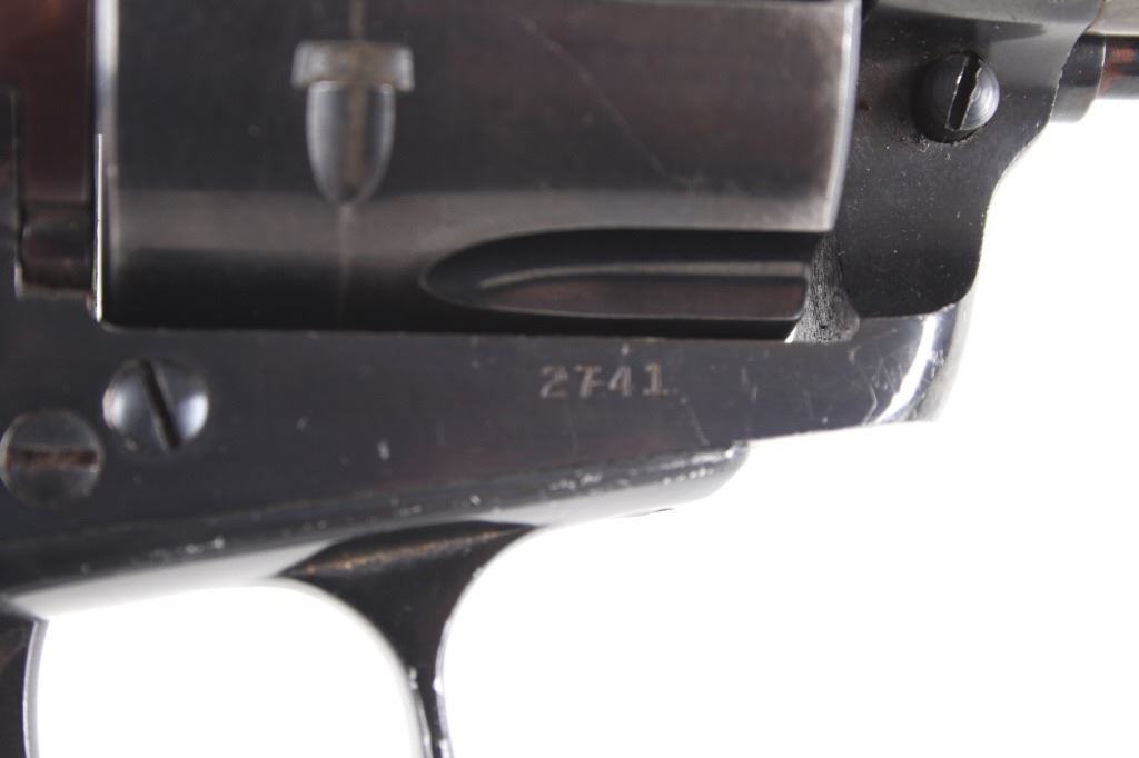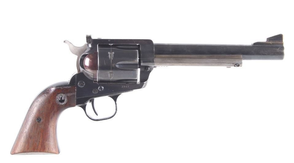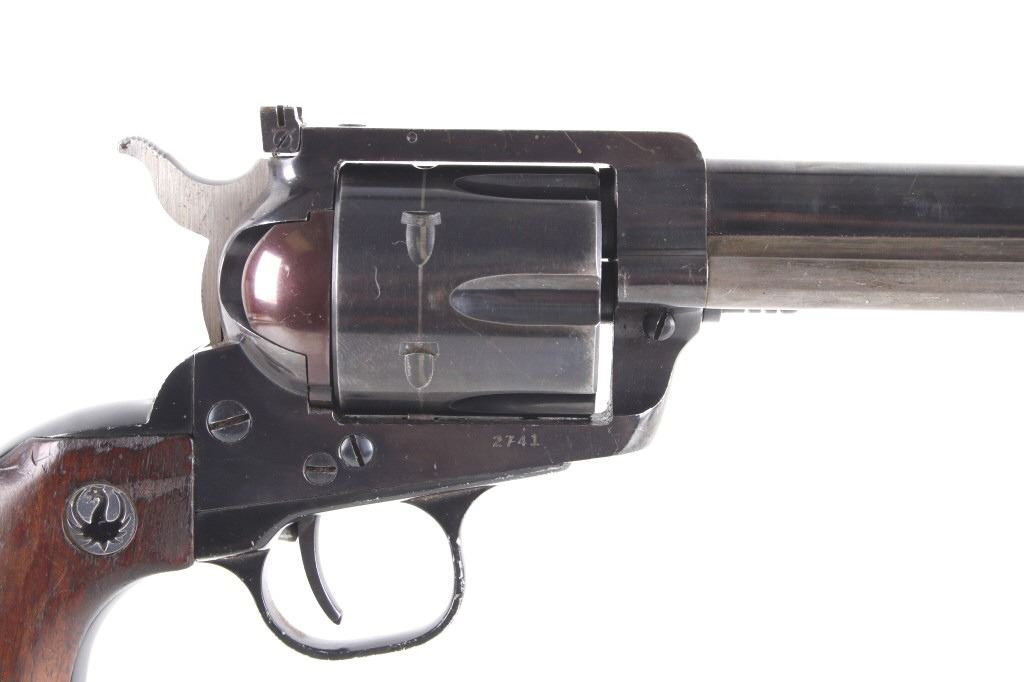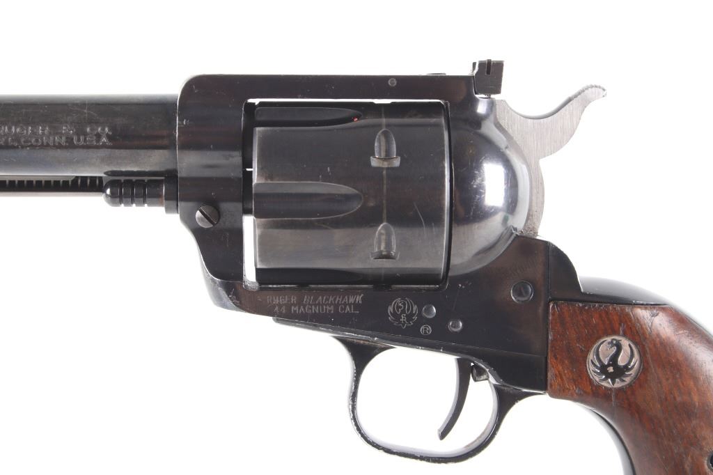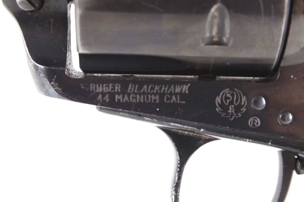 Featured in this lot we have a Ruger & Co Blackhawk single action revolver chambered in .44 Magnum caliber. This revolver was manufactured in 1957 by Ruger & Co. The revolver displays a 6 1/2" long round barrel, six shot fluted cylinder, walnuts grips, single action trigger system, and manual ejector rod. The barrel is marked across the left reading "STURM, RUGER & CO SOUTHPORT, CONN. U.S.A." with the frame marked "RUGER BLACKHAWK .44 MAGNUM CAL." with the Ruger logo. This revolver shows good mechanical condition with a smooth action and crisp trigger pull. The pistol features a blue'd finish across the barrel, frame, and cylinder with the grips showing Ruger medallions on the top. The revolver is in good condition overall with some wear across the finish due to use and storage. The piece weighs 2lbs 8oz. Serial Number: 2741. This is a modern firearm and requires a FFL transfer or NICS background check.