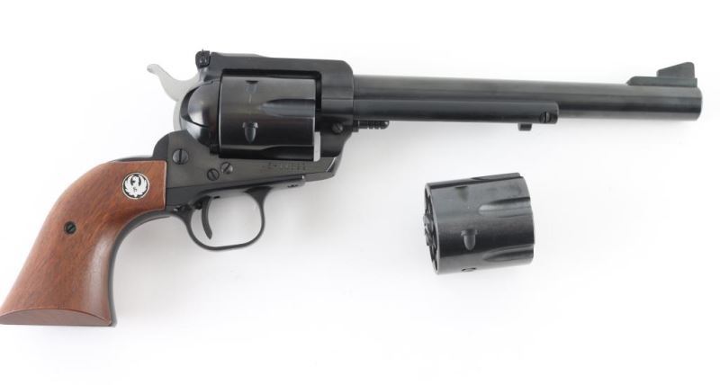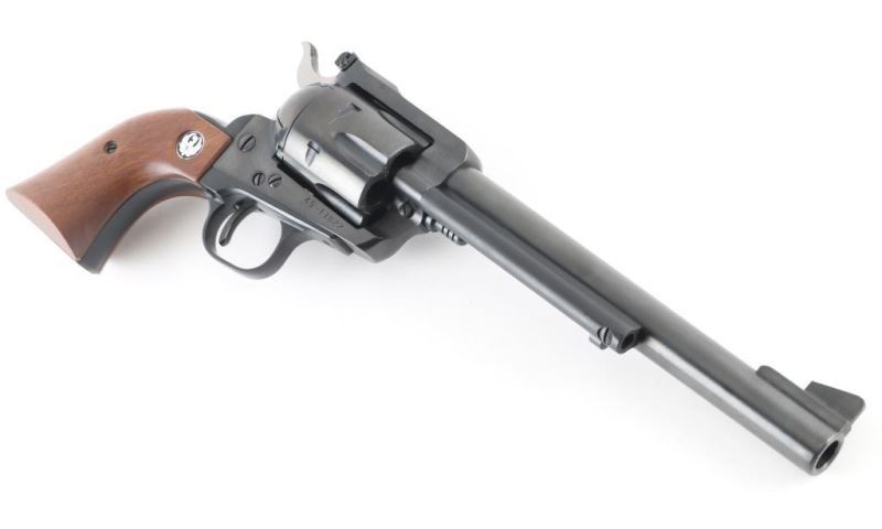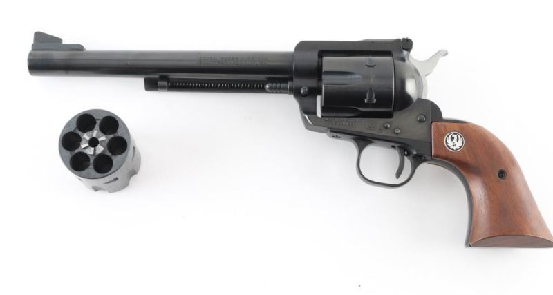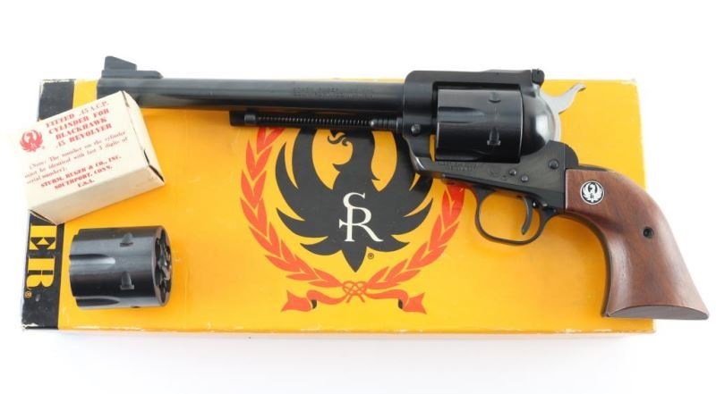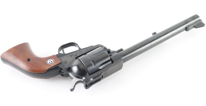 Revolver. Single-Action. 6-rd capacity. Includes 45 Colt and 45 ACP cylinders. Both cylinders are electric pencil marked "822" on front face, and seem to rotate and index smoothly when installed in revolver. 3 screw . Introduced in 1955. (Ruger's first center-fire single-action), this example manufactured circa 1971-72. 7.5" barrel with partridge blade front and micro-adjustable rear sights. Blued finish. Smooth walnut grips with Ruger medallions. Bore/cylinders appear excellent/bright. Action is crisp/tight. Blued finish is about 99% with some minor scratches. Grips are excellent. Comes in its original Ruger factory box.