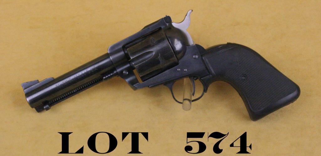 Ruger Blackhawk SAA revolver, .41 Magnum cal., 4-3/4” barrel, blue finish, Pachmayr checkered combat hard rubber grips, #9319. This gun is in overall fair + condition showing high point and muzzle wear withbalance of blue finish remaining including some scattered spots of erosion and some pin prick pitting, good action and markings, bore shows some scattered pitting, after market grips good. A very low serial numberedBlackhawk. Est.: $200-$300.