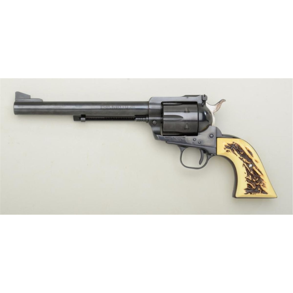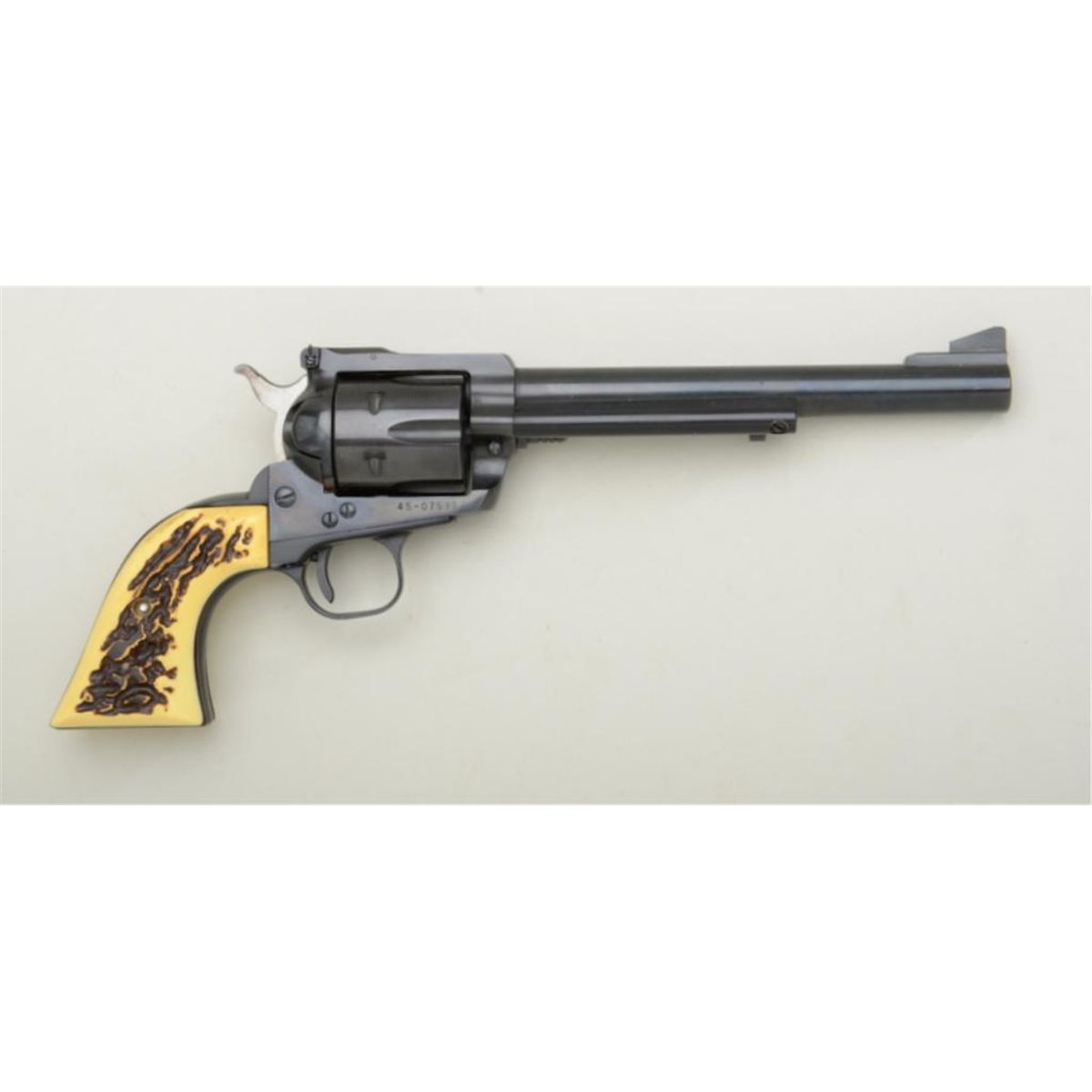 Ruger Blackhawk Single Action revolver, .45 cal., 7-1/2” barrel, black finish, faux stag grips with spacers, #45-07596. This gun is in overall very good to fine condition showing the majority of what may be a quality olderre-finish, very good bore, action, markings and grips. Est.: $250-$500.