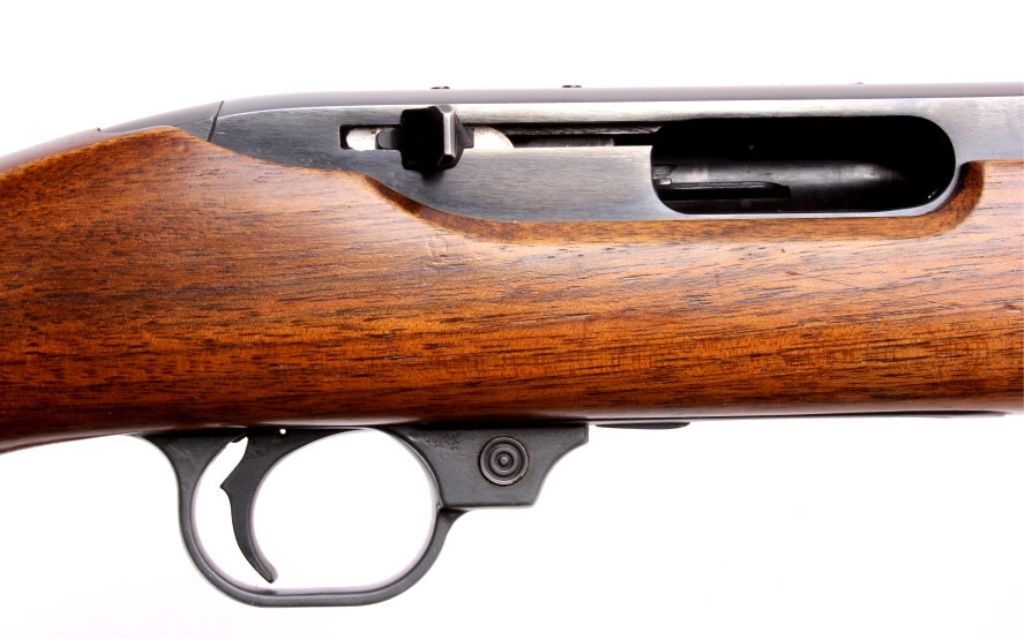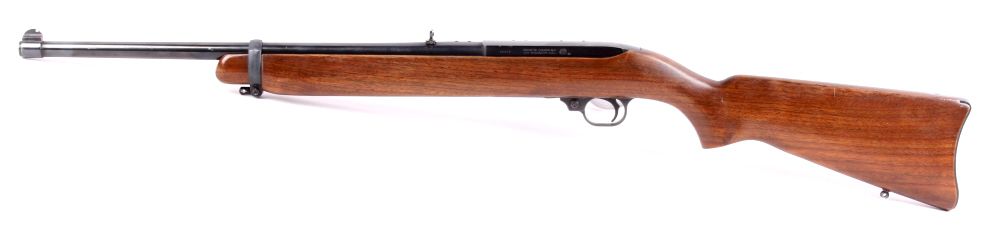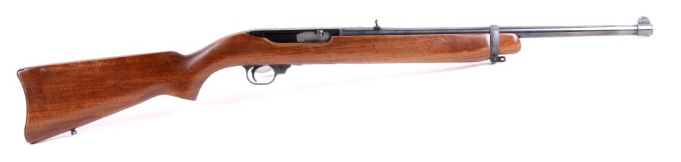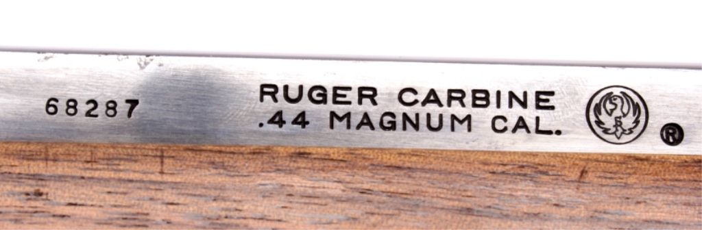 This is a .44 magnum caliber auto loading Ruger Model Rifle. The Ruger is in great condition. This firearm has a beautiful dark brown stock. The bluing on the barrel is pristine condition. The rifle has the flip upsights and is tube fed.
