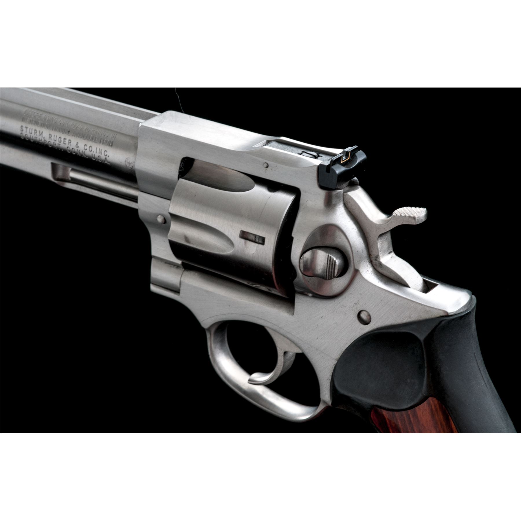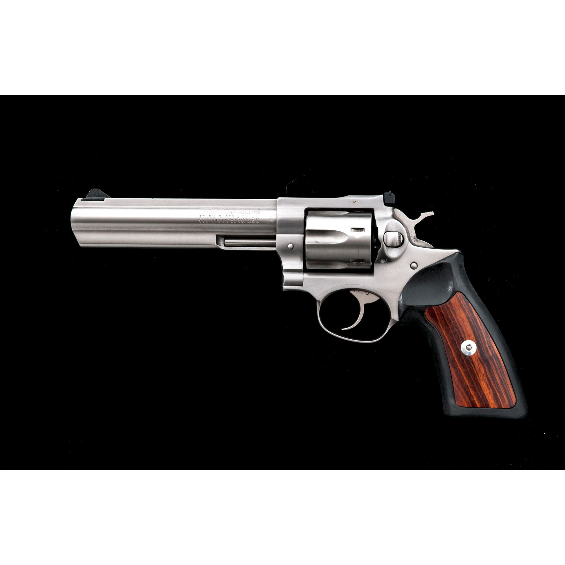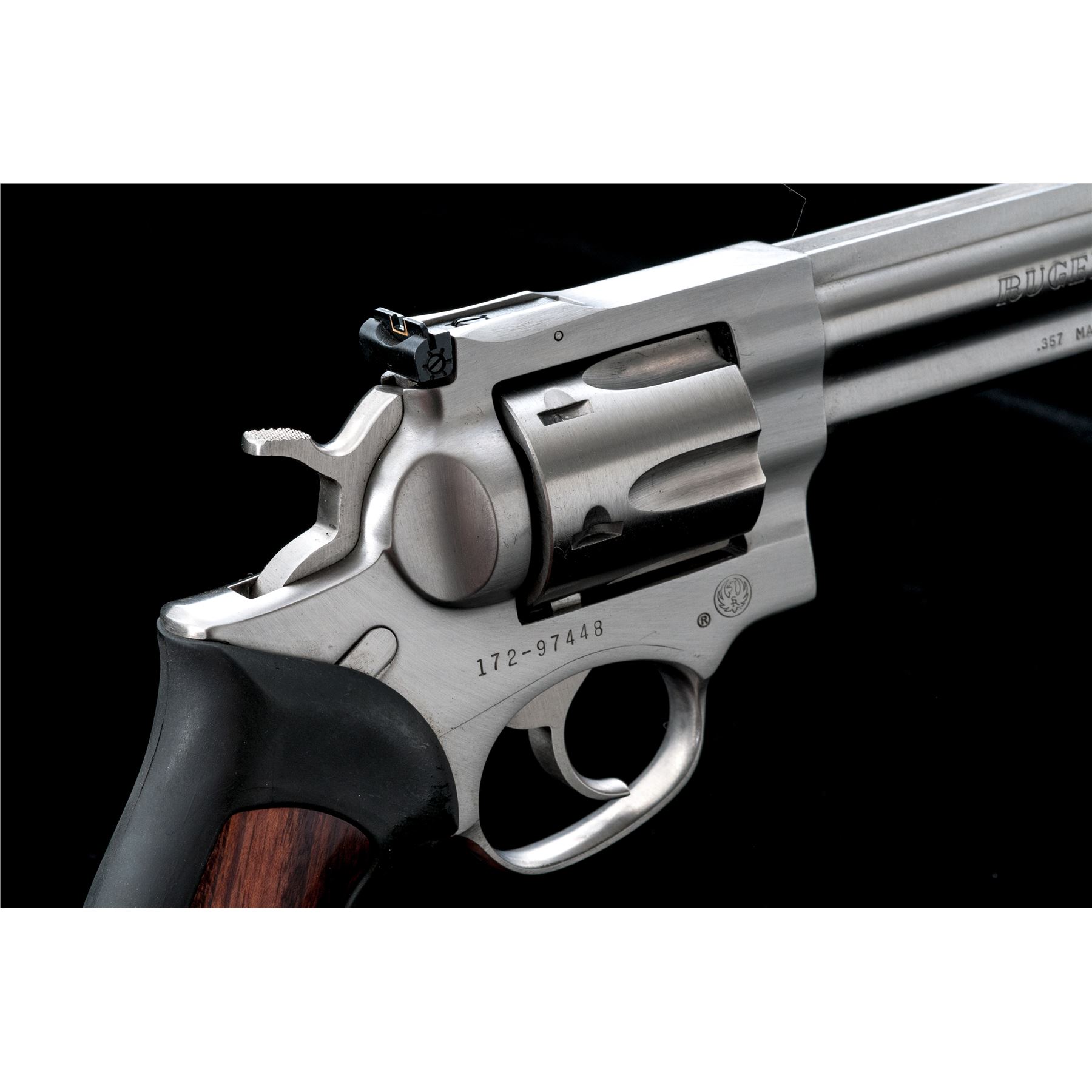Ruger GP-100 Double Action Revolver, #172-97448, .357 mag. cal., 6'' barrel, satin stainless finish, black rubber grips with wood inlays, ramped front sight and white outline fully adjustable rear sight. Condition is excellent, with intermittent slight handling marks to the grips and metal; cylinder with only a very light index line. Factory lettering is crisp and clear. Smooth action, bright bore with excellent rifling. Est.: $400-$550. (Modern/PPT)
