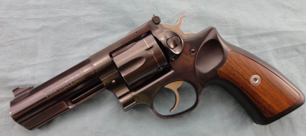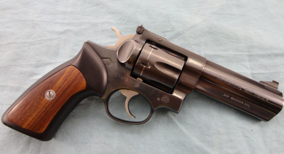 #170-37049; 357 mag. 4" bbl. Blued finish w/std. wood & rubber grips. Good overall condition w/some small brown spots on frame & drag line on cylinder.