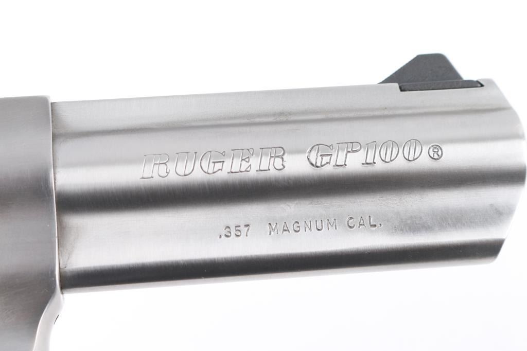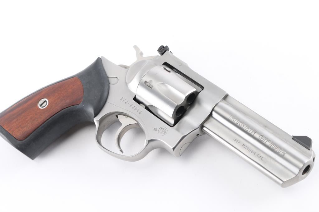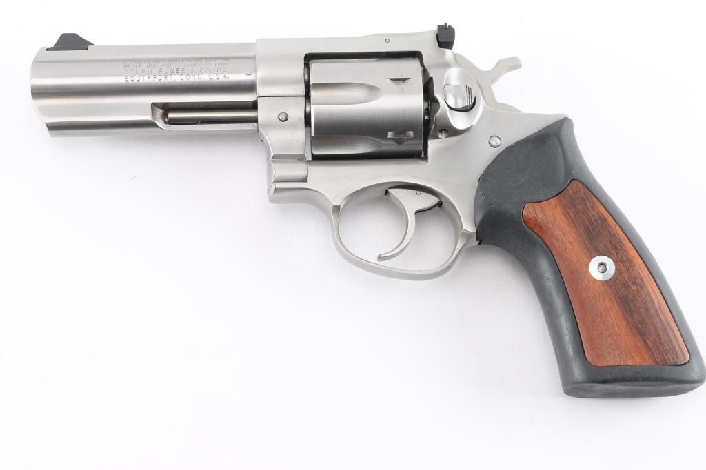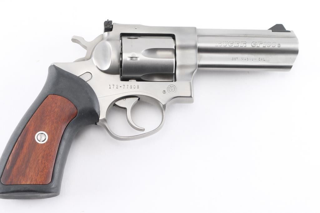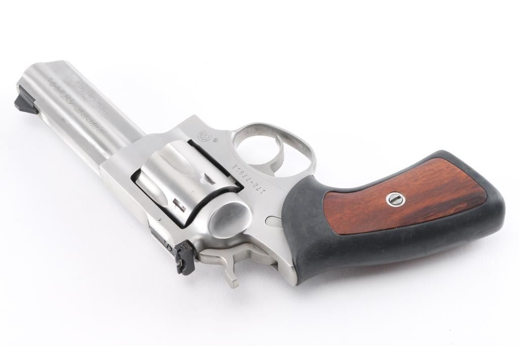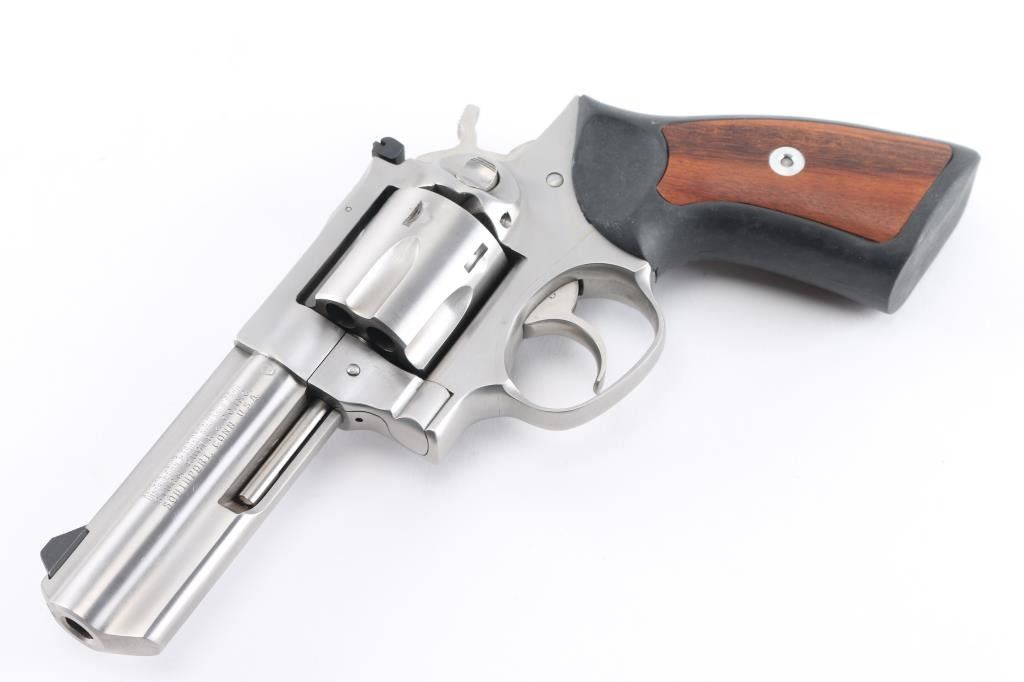 American made stainless steel double action revolver chambered in .357 Magnum, manufactured circa 1992. Features a brushed finish, 4" full lug barrel, with dovetailed blade front sight, adjustable rear sight, smooth trigger, knurled hammer spur, fluted six-shot cylinder, and black rubber grips with smooth wood inserts. Bore is excellent/bright. Metal shows few handling marks, minor scratches. Grips are excellent condition. Action is smooth with tight lock-up.Condition is NRA Excellent. Modern Firearm