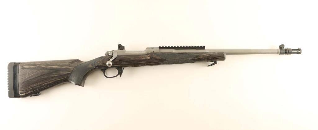Stainless steel magazine fed controlled round feed bolt action scout rifle chambered in .308 Winchester, manufactured in Newport, NH circa 2013. The concept of the scout rifle was defined & promoted by Jeff Cooper who was a former Marine, firearms expert & founder of the American Pistol Institute (Gunsite). Configuration: Matte finish, free floated 18.7” cold hammer forged barrel featuring 1:10 twist & 5/8”-21 threads with installed flash hider, full-banded shrouded blade front sight, receiver mounted adjustable rear aperture sight, forward mounted Picatinny optic rail, smooth trigger, black glass-reinforced nylon triggerguard/magazine well with push-forward magazine release, no magazine, swept-back bolt, three-position safety on the right side of the receiver, quick-detach sling swivels and checkered black/green laminated wood semi-pistol grip shoulder stock with spacer, rubber recoil pad & 13.25” LOP. Rifle exhibits light handling marks with no major wear observed. Action is smooth, the bore appears excellent but dirty and the wood stock is fine. Condition is NRA Excellent. ***Modern Firearm***