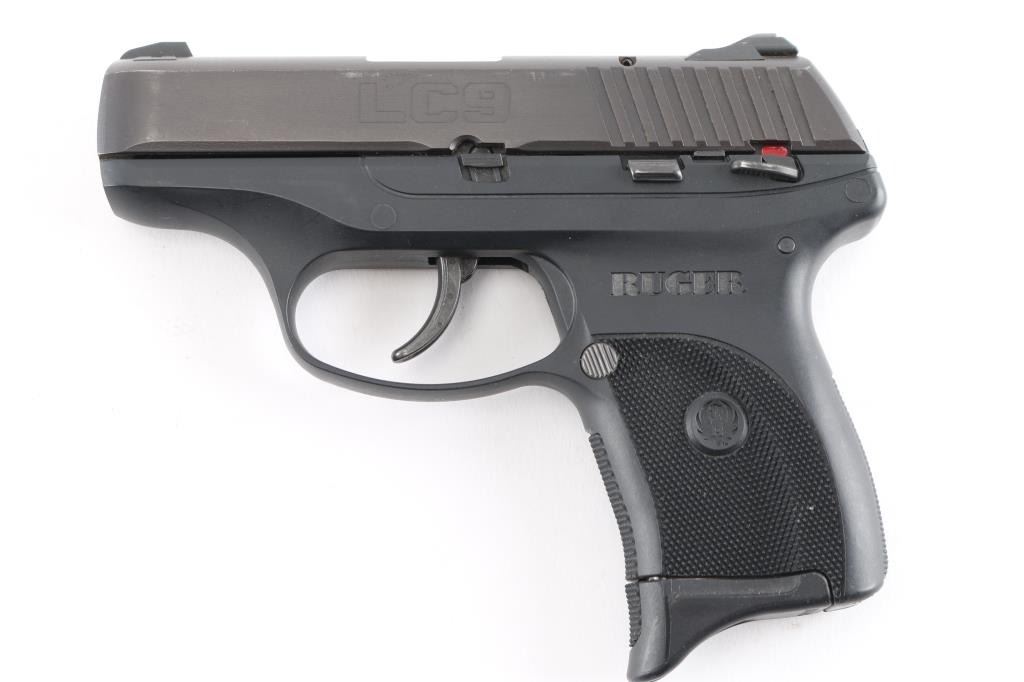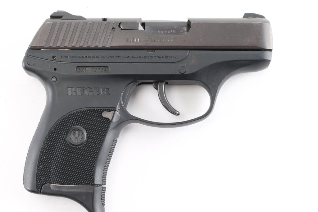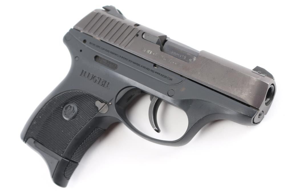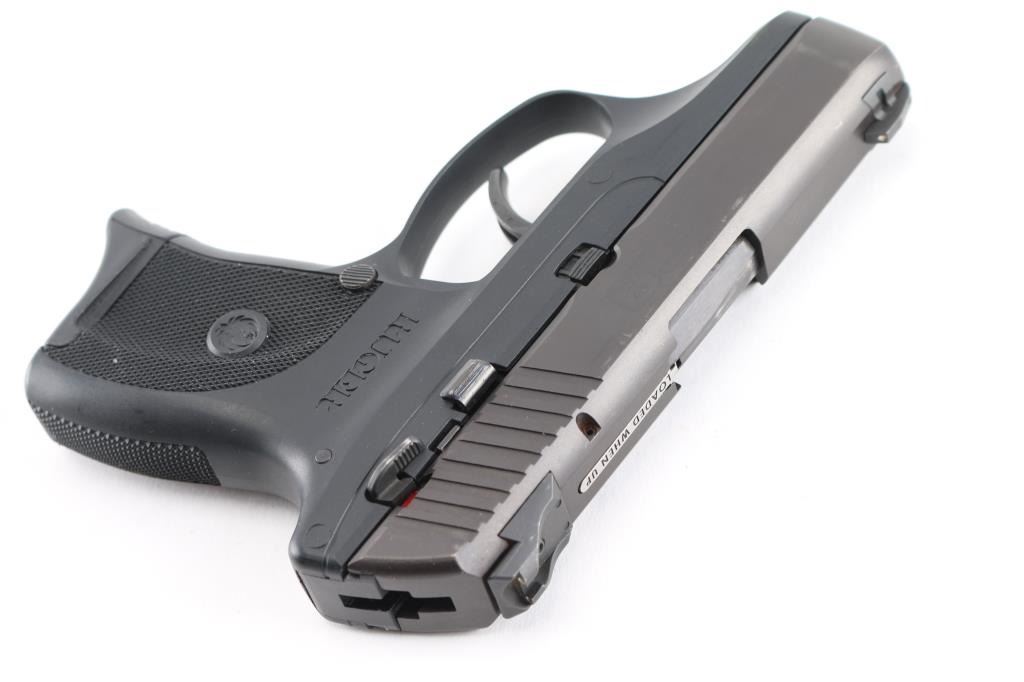 Semi-automatic pocket pistol chambered in 9MM. 3" barrel, black oxide slide with matte black finish with serrations on back, fixed blade front sight with white dot and fixed square notch rear sight with white dots, recessed hammer, polymer frame with checkered grip with Ruger logo, frame manual safety, push button magazine release and slide release. Loaded chamber indicator. Slide has minor edge wear & a patch of patina on the right side. Comes with (1) six round metal magazine with finger extension. Bore is excellent with a smooth action.