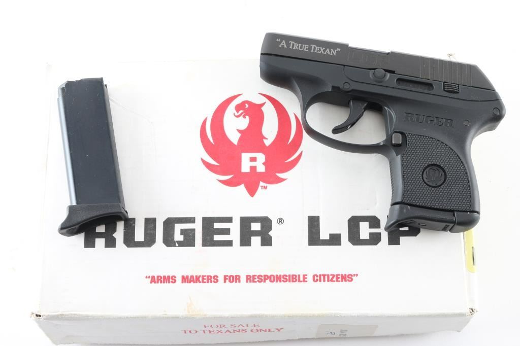 Made in America, circa 2010, the "True Texan Coyote Special" is a semi-auto, hammer fired pistol chambered for .380 ACP ammo. The left side of the slide says "A True Texan". The right side says Coyote Special. On the top of the slide there is a coyote howling at the moon and a Texas star. It has fixed, integral sights, smooth trigger, recessed hammer and black oxide finish on the alloy barrel and slide. The black, glass-filled nylon grip frame is textured for better grip and has the Ruger logo embossed in the center. Metal finish looks very good with one tiny scuff (barely noticeable) on the right side of the slide under the word Coyote. Grip frame looks very good. Bore looks good but dull. Comes with original factory cardboard box, owners manual, Ruger lock and Ruger logo soft side case. Something sticky is inside the box and has stained the soft case. It also comes with 4 magazines, 1 factory, 3 ProMag. Condition is NRA Excellent *Modern Firearm*