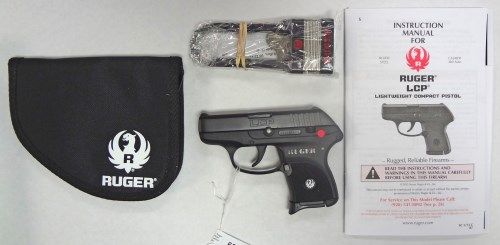 Ruger LCP (lightweight Compact Pistol). Semi-Auto pistol .380. Finish: blue. Action: double action only. Stock: black glass-filled nylon frame. Capacity: 6+1. # of mags: 1. Sights: fixed. OVerall length: 5.16. Weight: 9.4 oz. Packaging: soft case included.