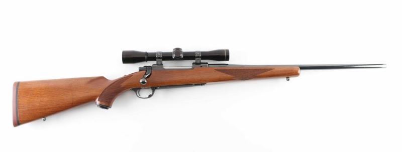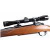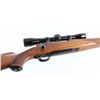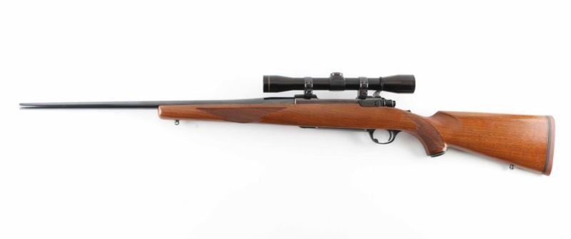 Bolt action rifle features blued finish, wood stock with checkered panels at forend & curved wrist, no cheekpiece, thin solid rubber recoil pad, sling studs, 22" barrel, no sights, scalloped dovetails on receiver for scope mounting, hinged floorplate, manual tang safety. Bore is very good condition. Retains 95% blue. Wood is excellent condition. Mounts a Leupold M8 4x scope with clear view, duplex reticle. Condition is NRA Excellent *** Modern Firearm ***