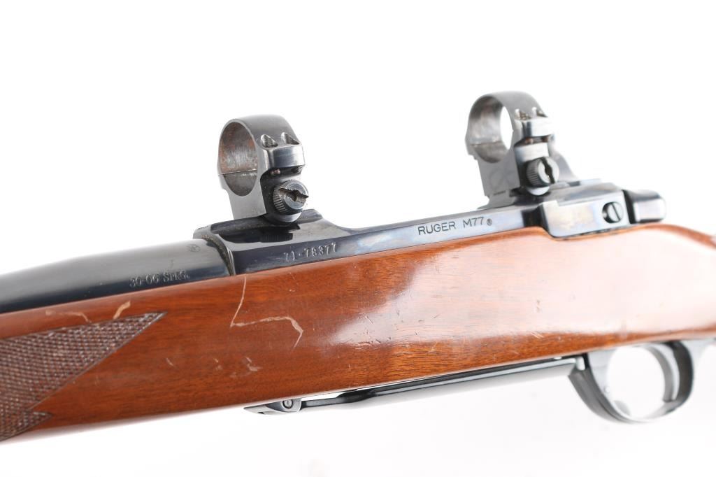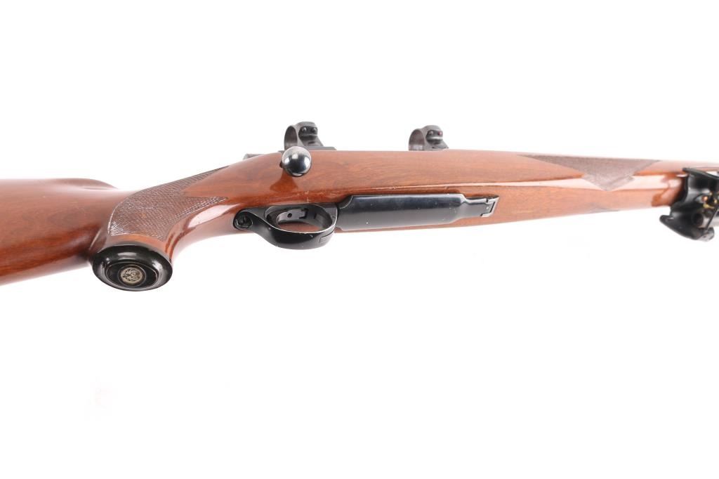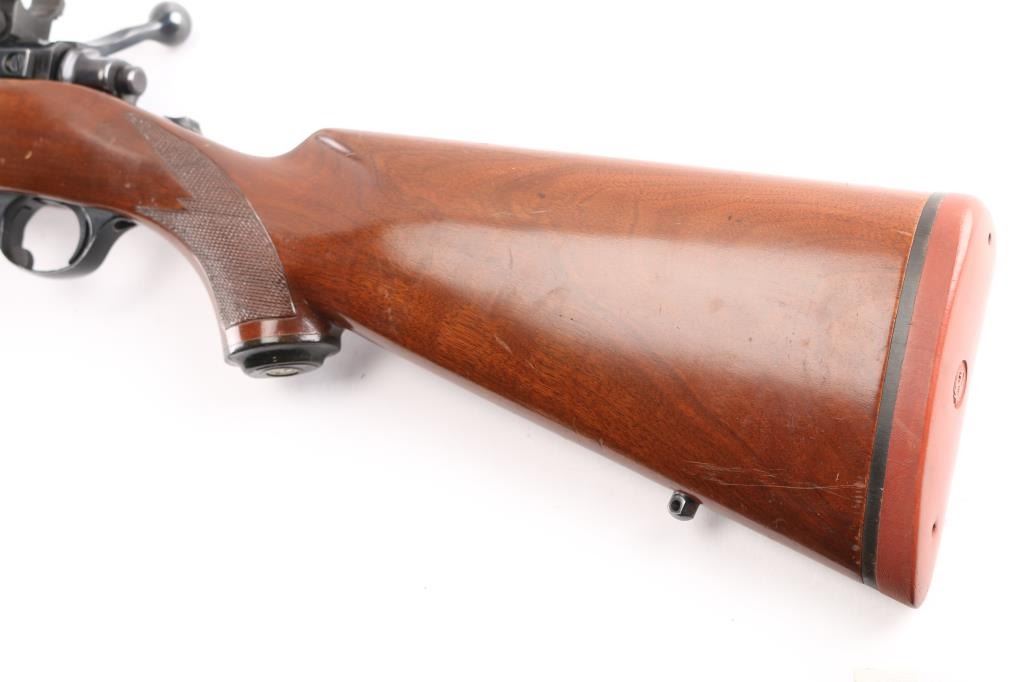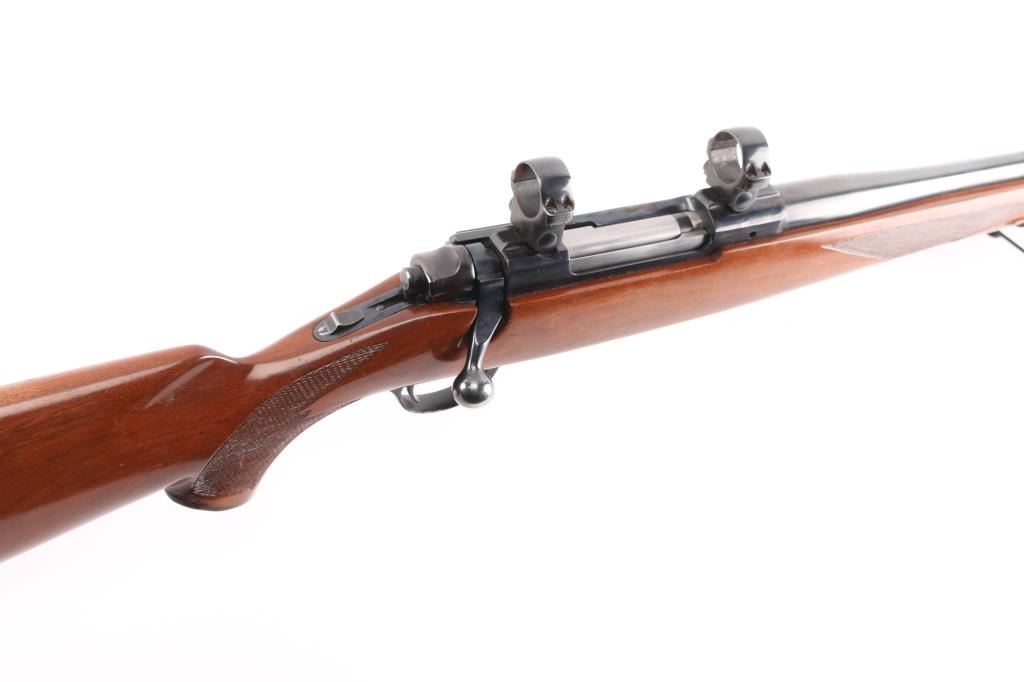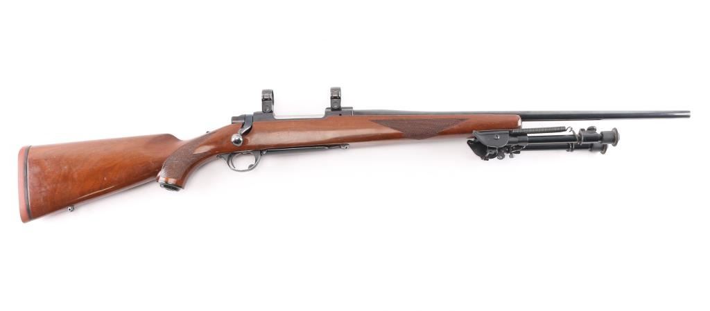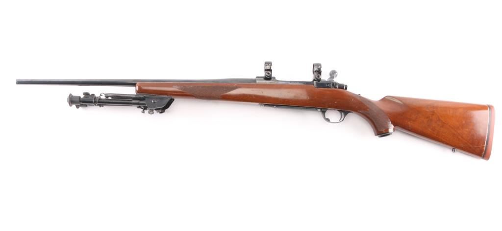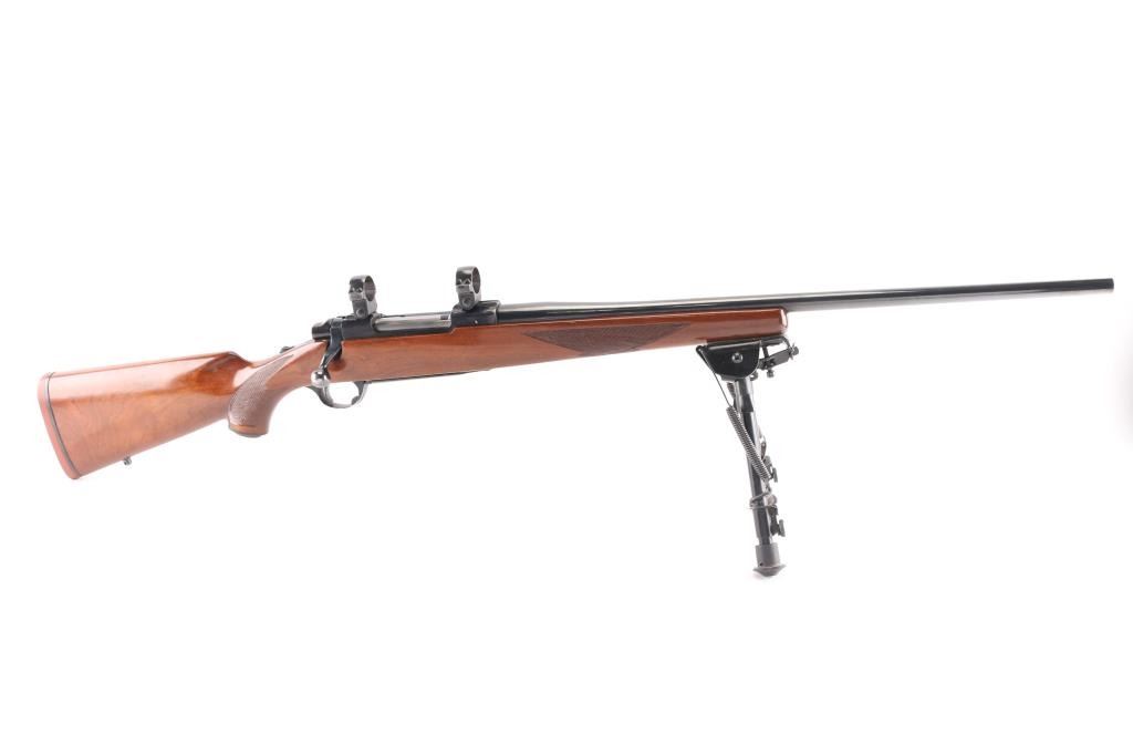 Bolt action rifle manufactured circa 1978. Features blued finish, 22" barrel without sights, Ruger rings mounted to receiver scallops, sliding tang safety, hinged floorplate. Semi-gloss walnut stock features checkering at forend & curved wrist, rear sling studs, no cheekpiece, thin solid red rubber factory recoil pad. Winchester Twist Leg Rifle Bipod 99700 installed. Bore is excellent/bright. Retains 95% finish with handling marks. Wood is very good with some scuffs, scratches. Manufactured 1976.