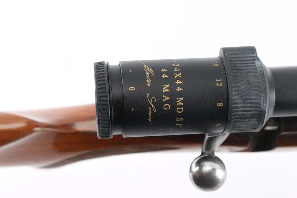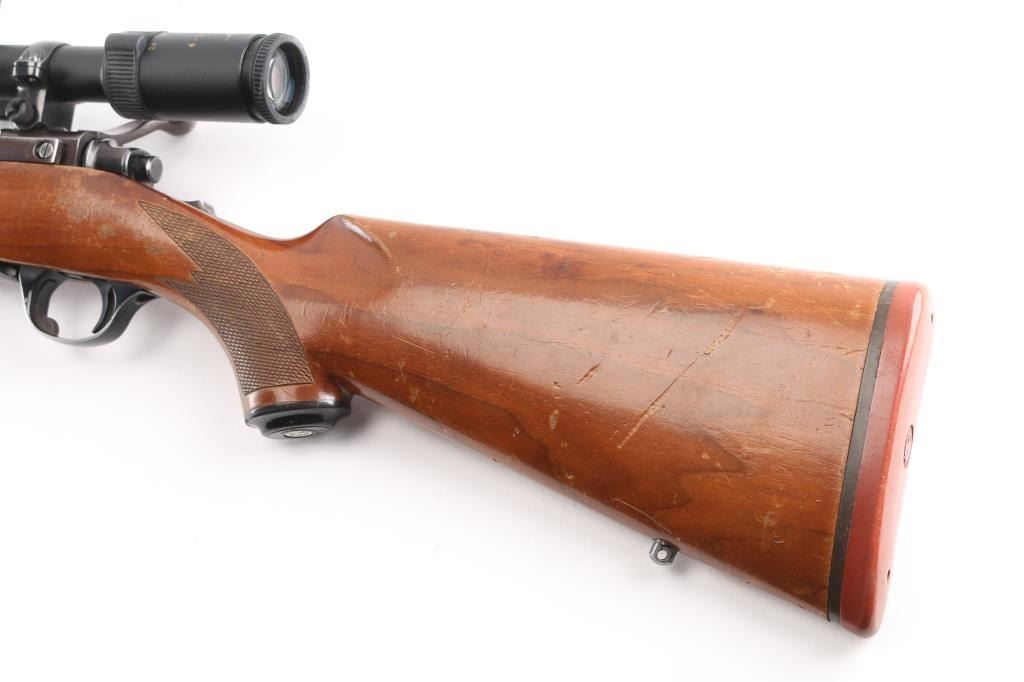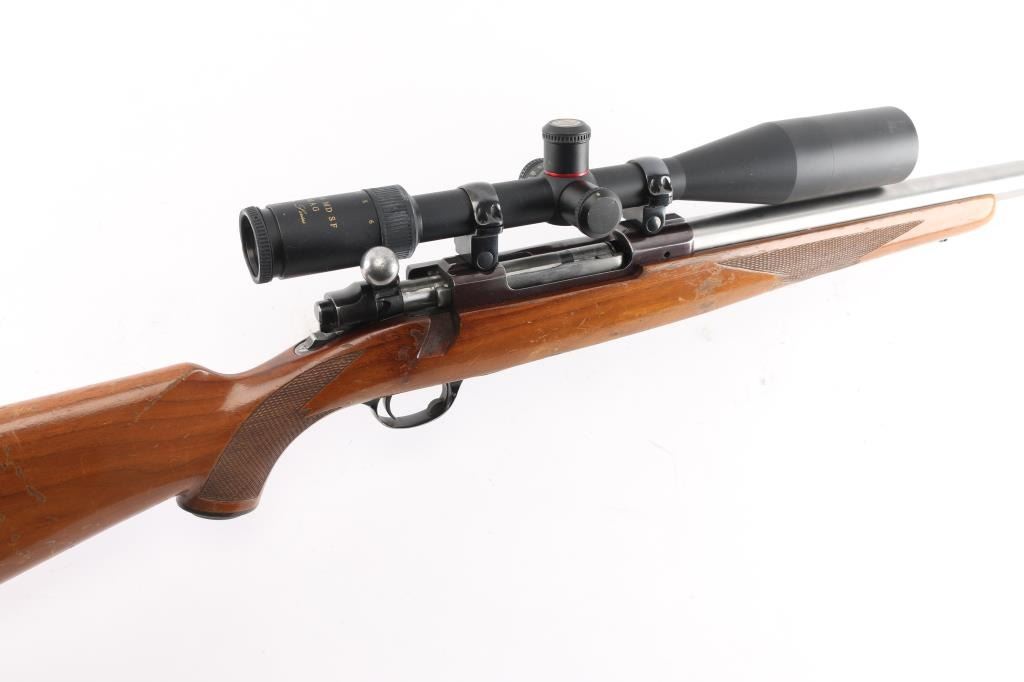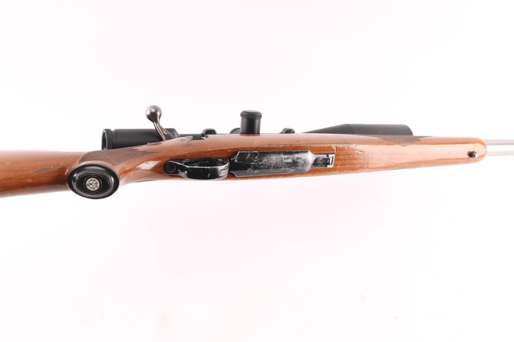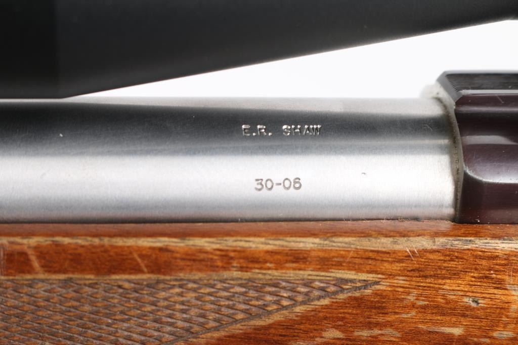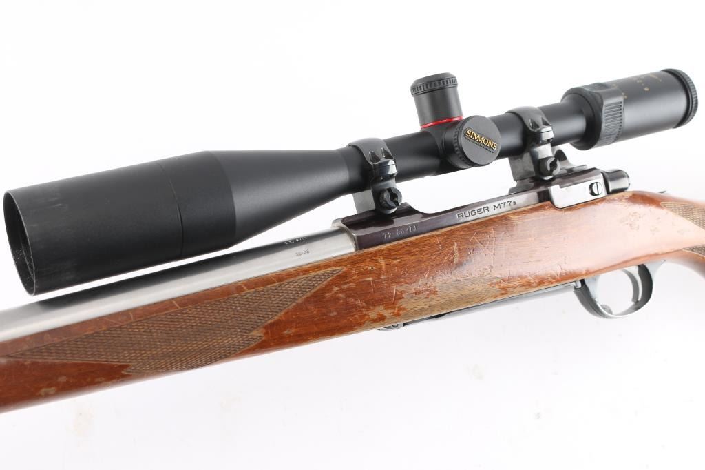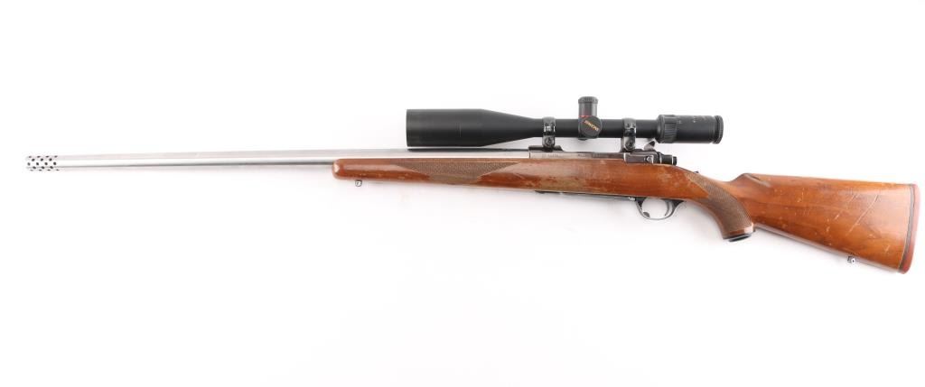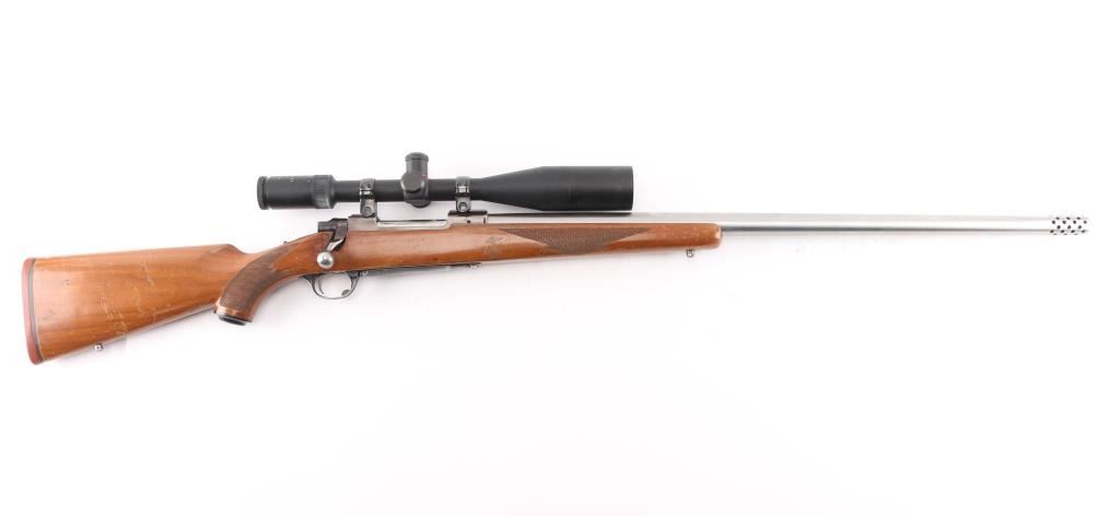 This is a custom rifle built on a Ruger M77 action using a 28.5" E.R. Shaw stainless barrel with ported muzzle, original Ruger stock with factory recoil pad, & grip cap, sling swivel studs, hinged floorplate. Mounted with a Simmons 6-24X44 MD 44 'Master Series' scope, duplex reticle, clear optics. Bore is excellent/bright, action is smooth, barrel is excellent, stock is sound with many scratches, dings, and handling finish loss, mostly on the left forearm. The plum colored receiver has edge wear, handling wear to the bolt handle, the floorplate has scratches, and about 50% finish loss.