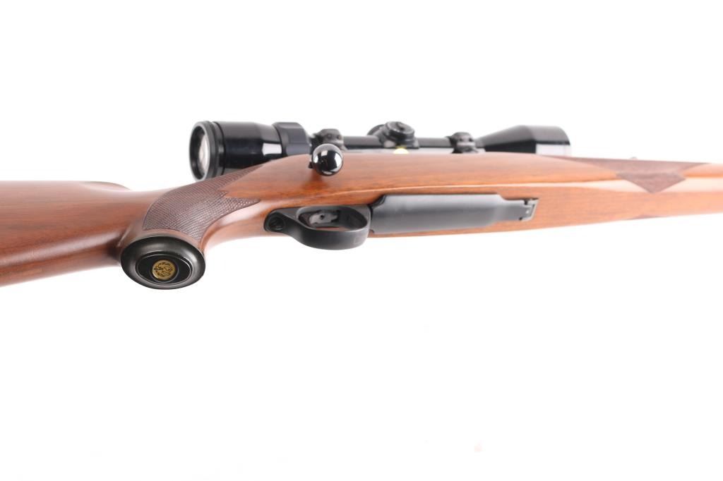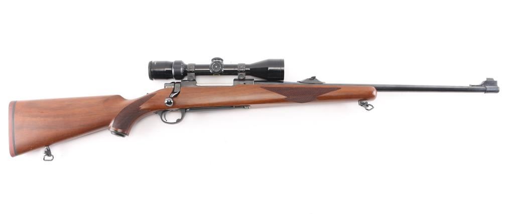 Bolt action rifle manufactured circa 1980. Features blued finish, 22" barrel with raised blade/bead front, and raised adjustable u-notch flip sights, Ruger rings mounted to receiver scallops hold a Bushnell 3-9x40 scope, sliding tang safety, hinged floorplate. Semi-gloss walnut stock features checkering at forend & curved wrist, sling swivels, no cheekpiece, thin solid rubber butt pad. Bore is excellent/bright condition. Retains 99%. Wood is very good with some small creases & scuffs. Scope is very good, bright view.