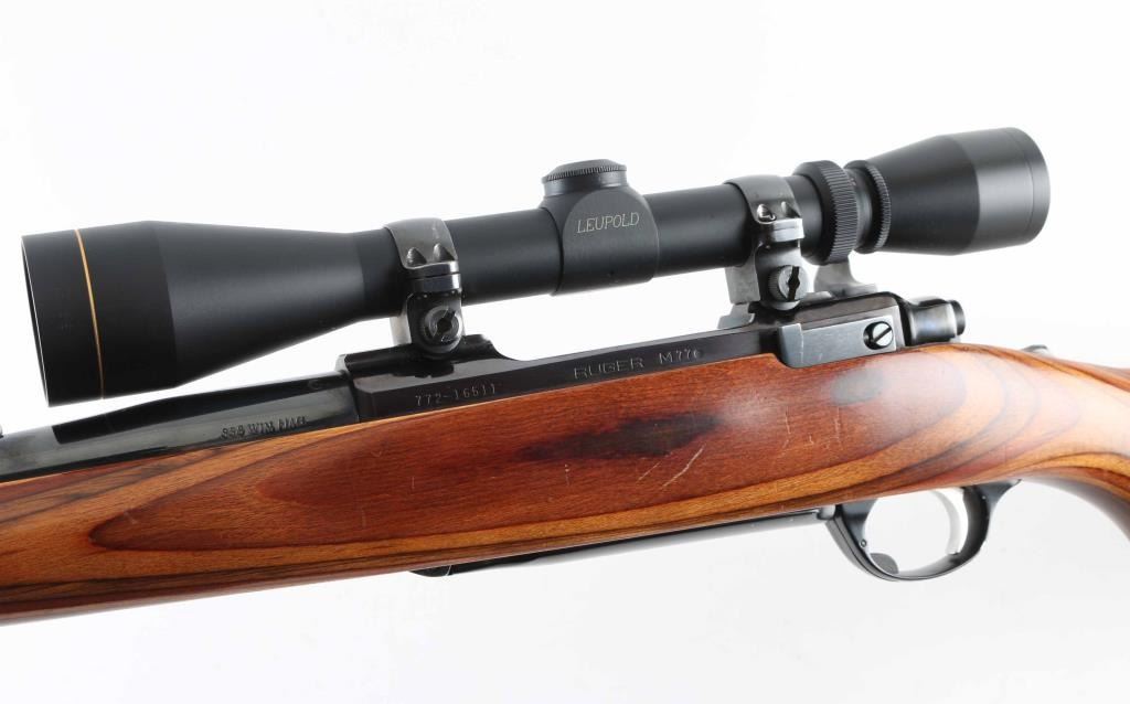 24" high polish barrel with a laminate stock, flip down rear sight, integral scope base with rings and a Leupold 3-9 VARI-X II. Barrel and stock both have minor scuffing. Circa 1989. NRA Very Good. Modern Firearm