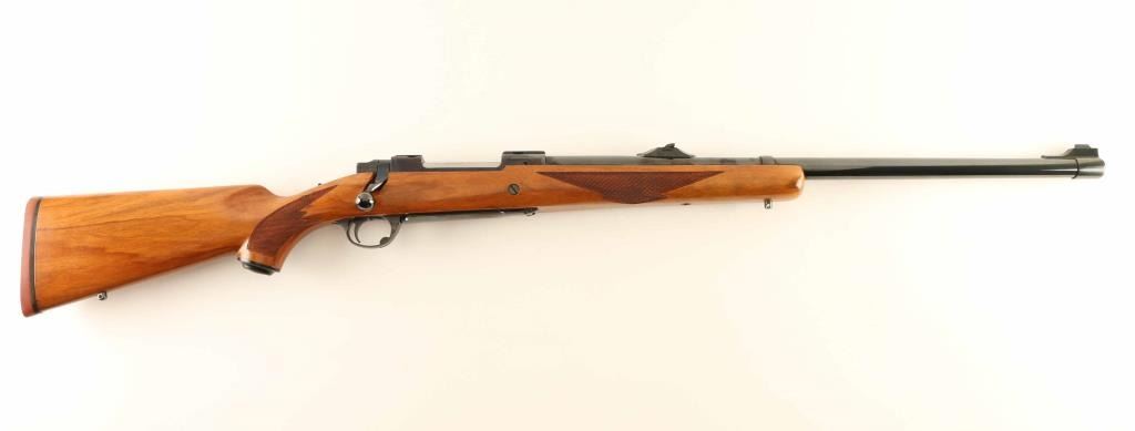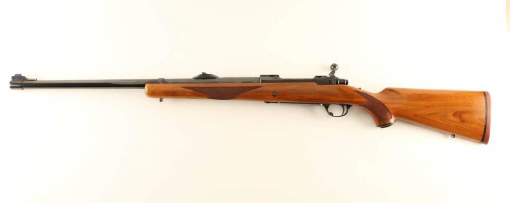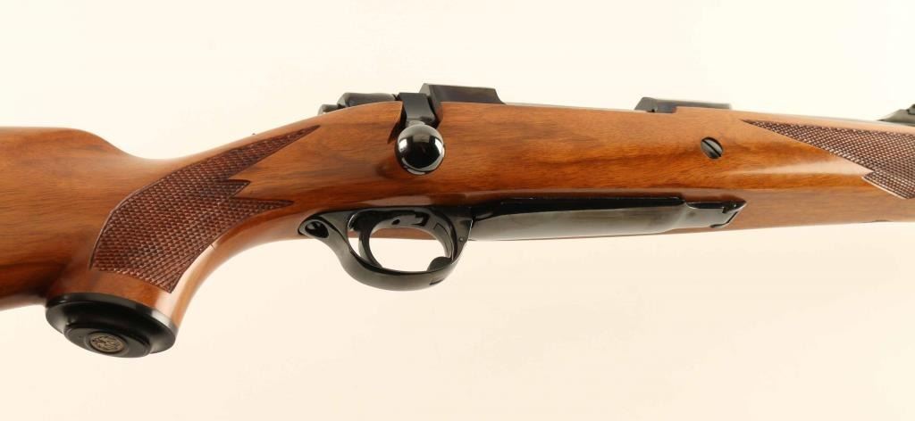 'Model 00740, 77 RSC' High quality American made bolt-action sporting rifle chambered in .458 Winchester Magnum, manufactured circa 1978. Features a high polished blued finish, 24" heavy barrel, raised blade front top with brass bead, raised flip-up adjustable rear sight, integral scope bases cuts in the receiver, smooth adjustable trigger, sliding tang safety, polished bolt, internal box magazine with hinged steel floorplate, steel triggerguard, and hand checkered Circassian walnut pistol grip shoulder stock with swivel studs, factory grip cap & red rubber recoil pad. Rifle exhibits approximately 99%+ of it's original high polished blued finish showing very little wear. Action is smooth, the bore is pristine and the wood stock is fine with minimal blemishes. Condition is near NRA Perfect. ***Modern Firearm***