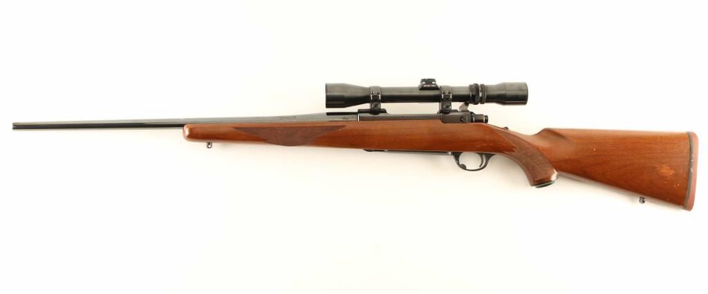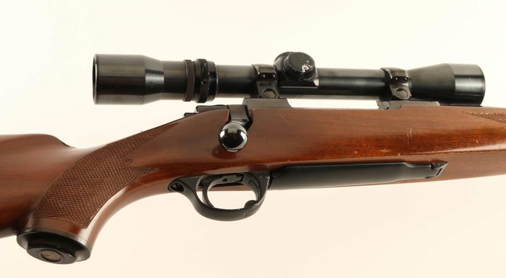 Rifle, bolt-action. blued finish. One piece, checkered wood stock, w/ rubber recoil pad. 21" tapered barrel. Mauser style action. safety on the tang. 5-rd magazine. bore looks excellent/bright, but a little dusty. Action is tight. Blued finish is about 95%, with a couple of rubs/scratches. Wood has numerous small scratches/dings, nothing serious. Sling swivel studs attached. mounted with a Weaver micro-trac V7-II scope. NRA Condition-Very good. Modern firearm.