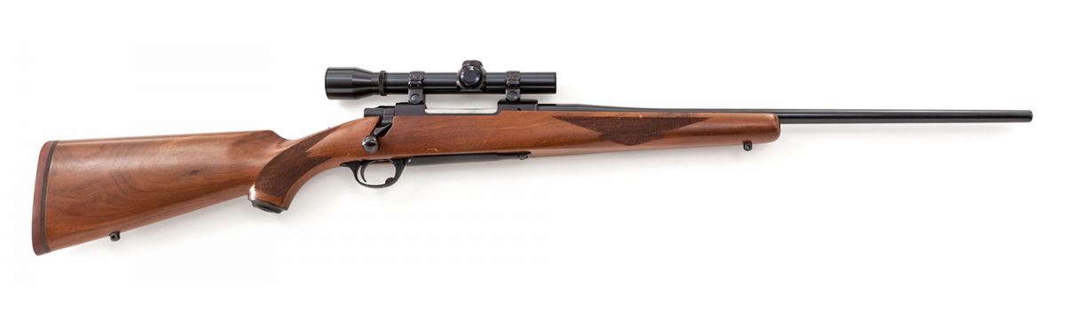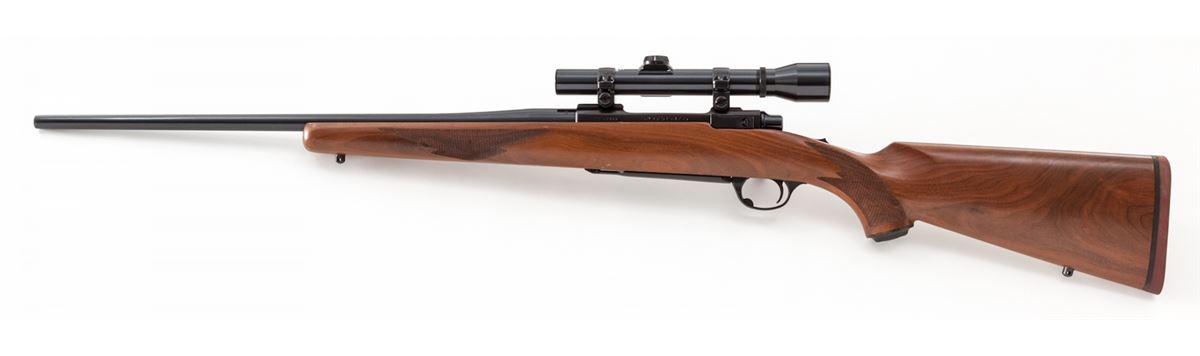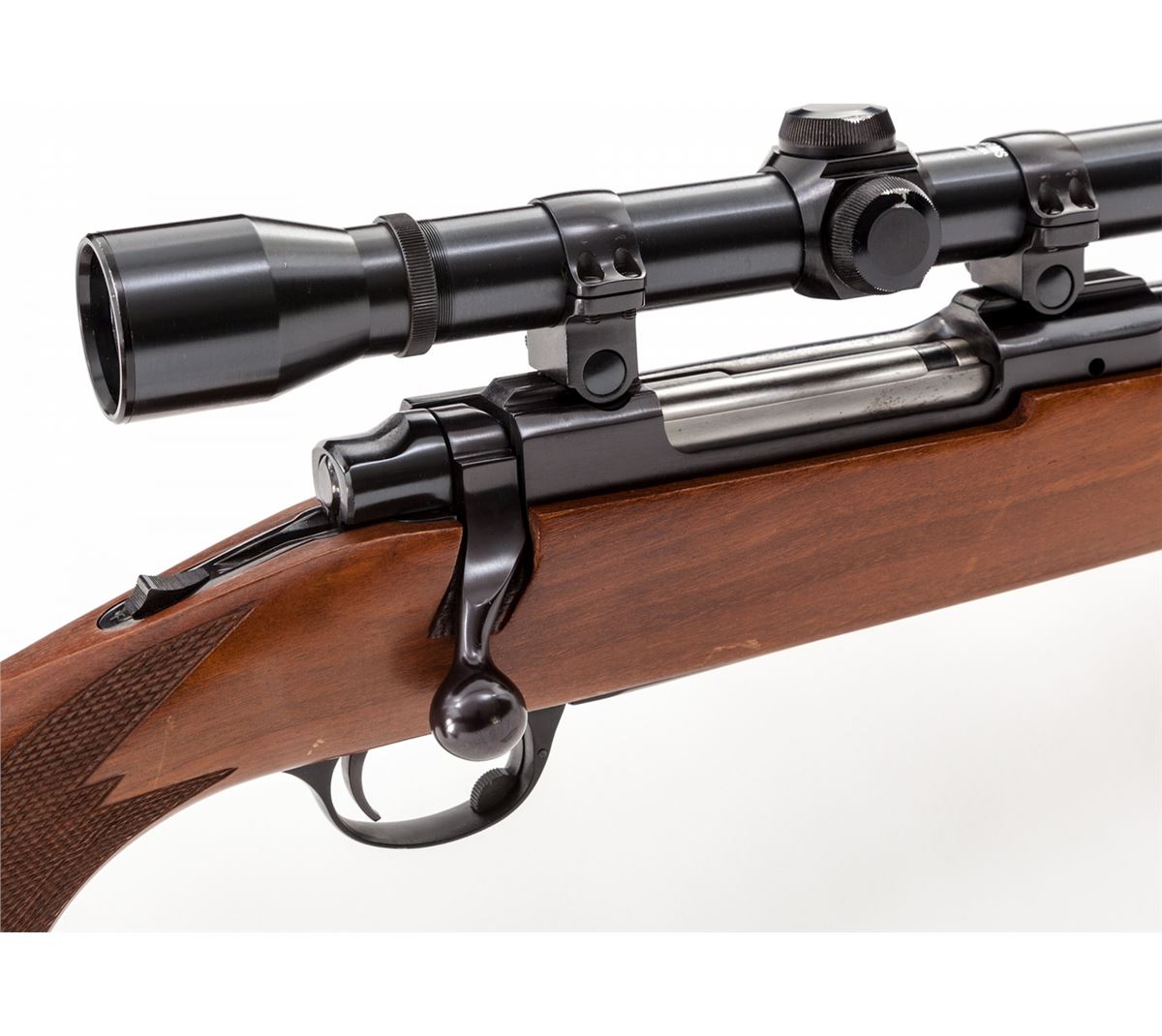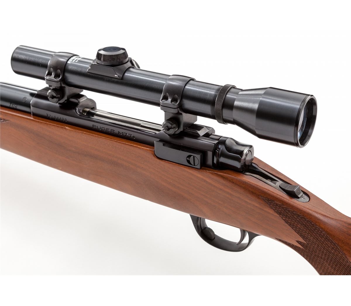 Ruger M77 Bolt Action Rifle, #72-64409, 7x57 cal., 22'' barrel, blue finish, factory checkered walnut stock. Topped with a Weaver scope on Ruger rings. Mfg'd 1972, pre-dating barrel warning. Condition is excellent showing light marks to stock from handling. Action is crisp, bore is bright, scope optics are clear. Est.: $500-$750. (Modern)