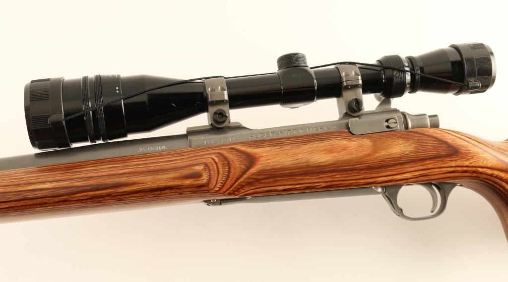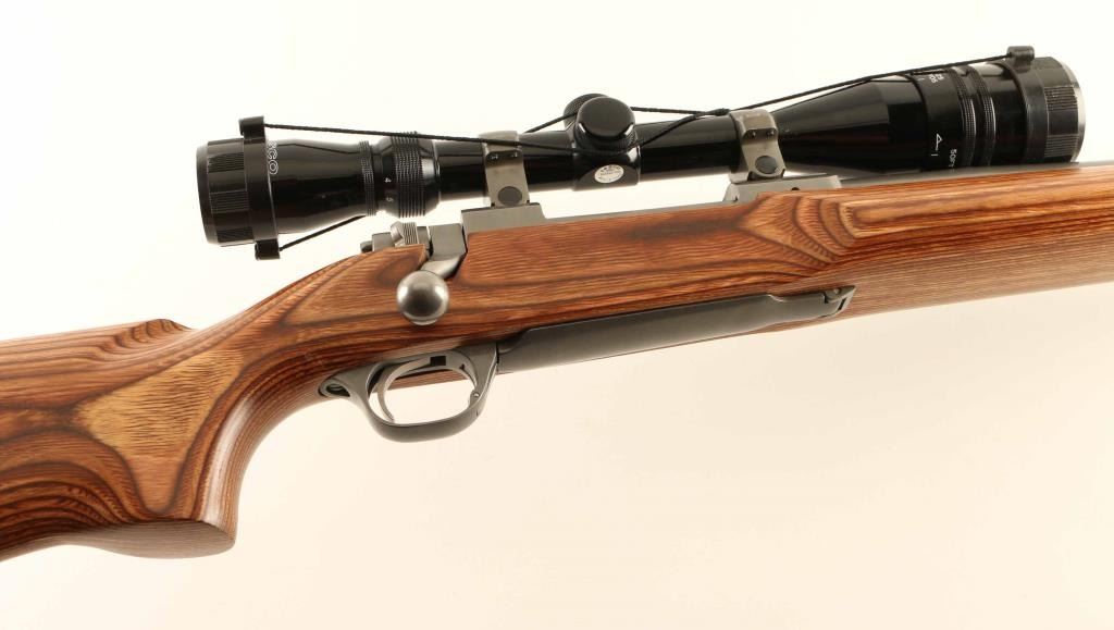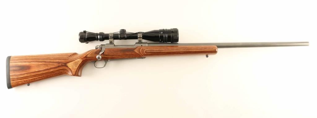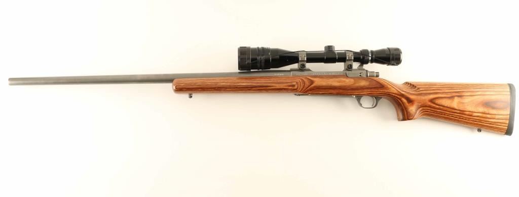 Rifle, Bolt-Action. Gray steel finish. Brown laminate stock, pistol-grip. Rubber recoil pad, sling swivel studs. 26" heavy barrel. Mauser style action. 3-position safety. Magazine fed. Swing down floorplate. Bore is excellent/bright. Action is smooth/tight. Mounted with a Tasco 4-16x40 scope on Ruger rings. Rifle is in almost new condition, with no visible mars on the wood, or metal. NRA Condition-Excellent. Modern Firearm.