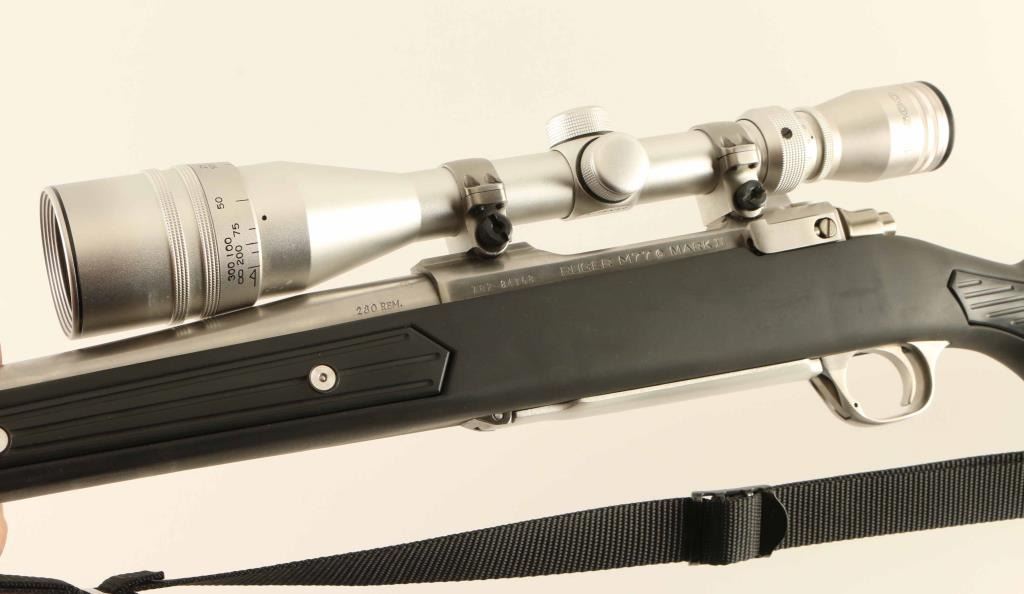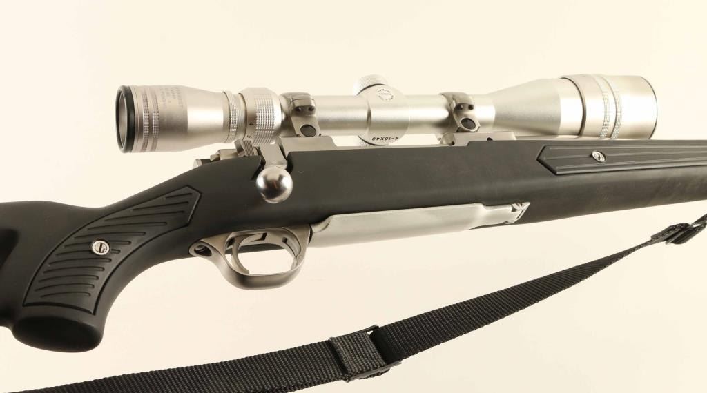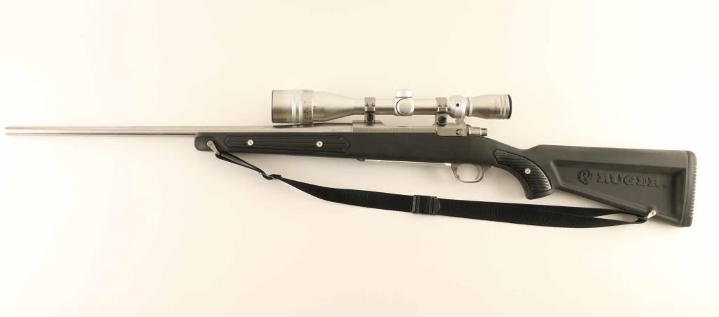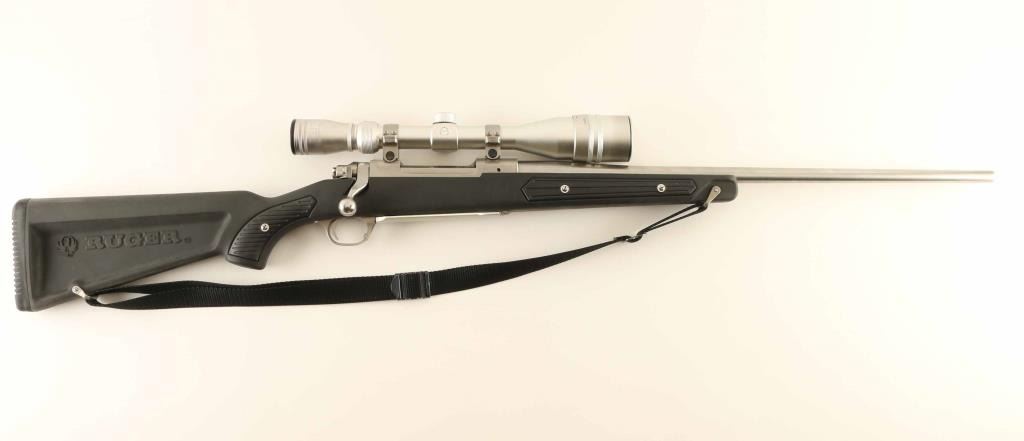 Bolt action rifle chambered for 280 Remington. Features approx 22 inch barrel, manual safety, hinged floorplate, integral scope bases are part of receiver and accept Ruger style rings. Stock features polymer construction with grooved insert panels on sides of fore end and wrist; non-slip rubber recoil pad, stainless steel sling swivels. Bore is excellent. Metal is excellent condition stainless steel. Stock is excellent condition with light scuffing present at comb. Mounts a Tasco 6-18x scope with duplex style crosshair and adjustable objective lens. View through scope is bright and clear. Includes excellent condition black nylon sling. Condition is NRA Perfect - Like New ***Modern Firearm***